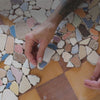 Teal and aqua tones create a cool foundation, traced with golden lines that weave like pathways of light. The geometry feels fluid, almost aquatic, balancing freshness with refinement. Teal Trace captures the quiet luxury of fragments arranged with care — a harmony of cool depth and luminous warmth.