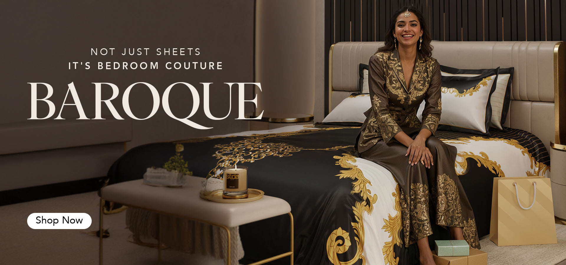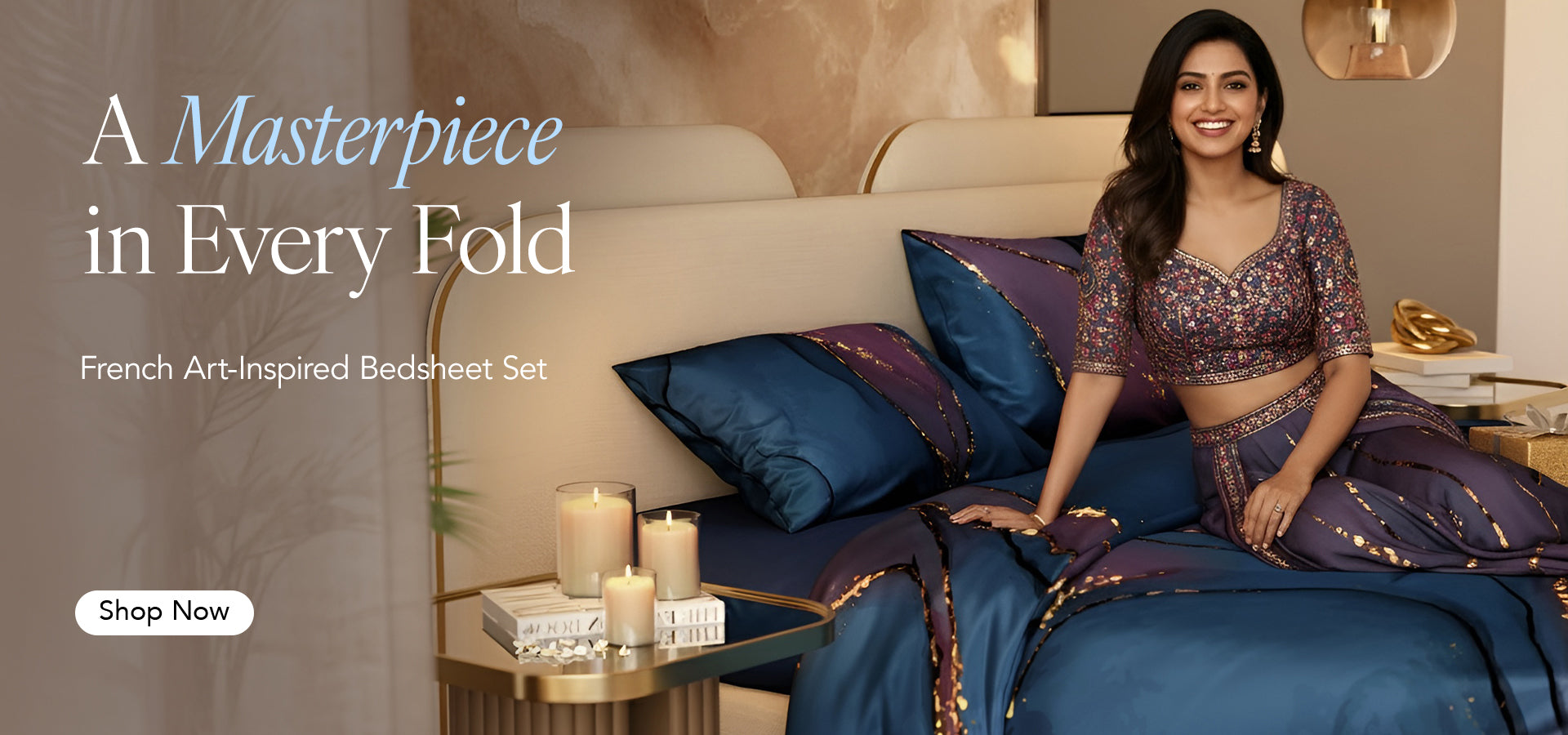 Sunset Stage captures the drama of a performance caught between day and dusk. Blush pinks meet deep indigos in sweeping gestures that rise and retreat across the fabric like two dancers sharing the same spotlight. Every curve feels lit from within, graceful, vivid, and composed in motion. Warm, expressive, and full of presence, this is bed fashion that turns stillness into spectacle.