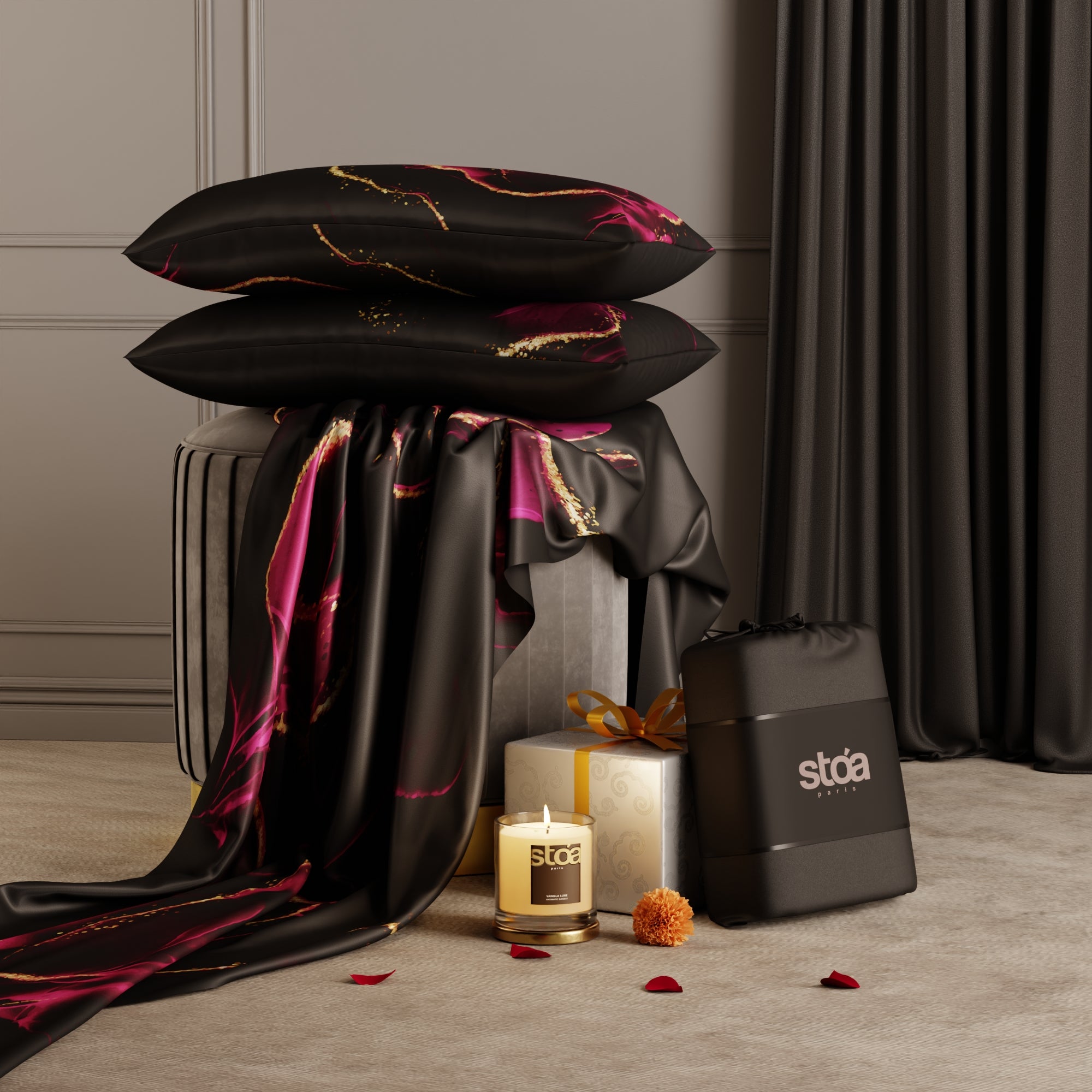 UltraSatin is an innovative, new-age, premium, custom-designed, high-quality fabric uniquely crafted by Stoa Paris. It features a silky-smooth texture and brilliant sheen. The lightweight fabric is made using 100% polyester, which offers a higher (300+) thread count and a denser weave than standard satin. It is also cool-to-touch, easy to maintain, and shrink-fade-resistant, ensuring both glamour and durability.