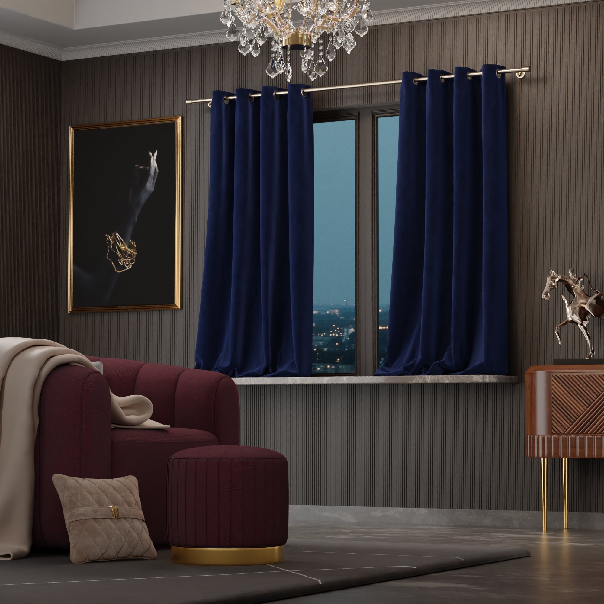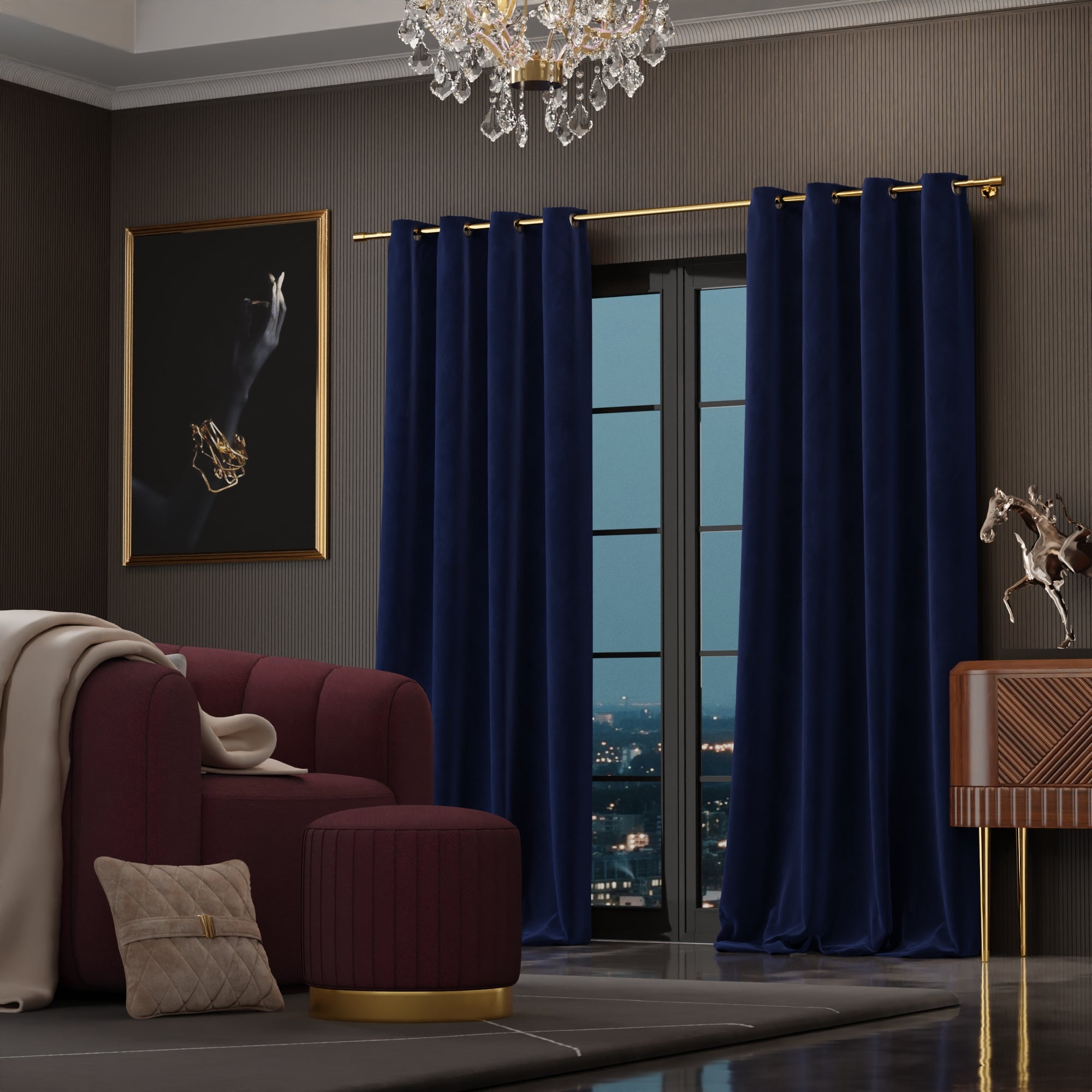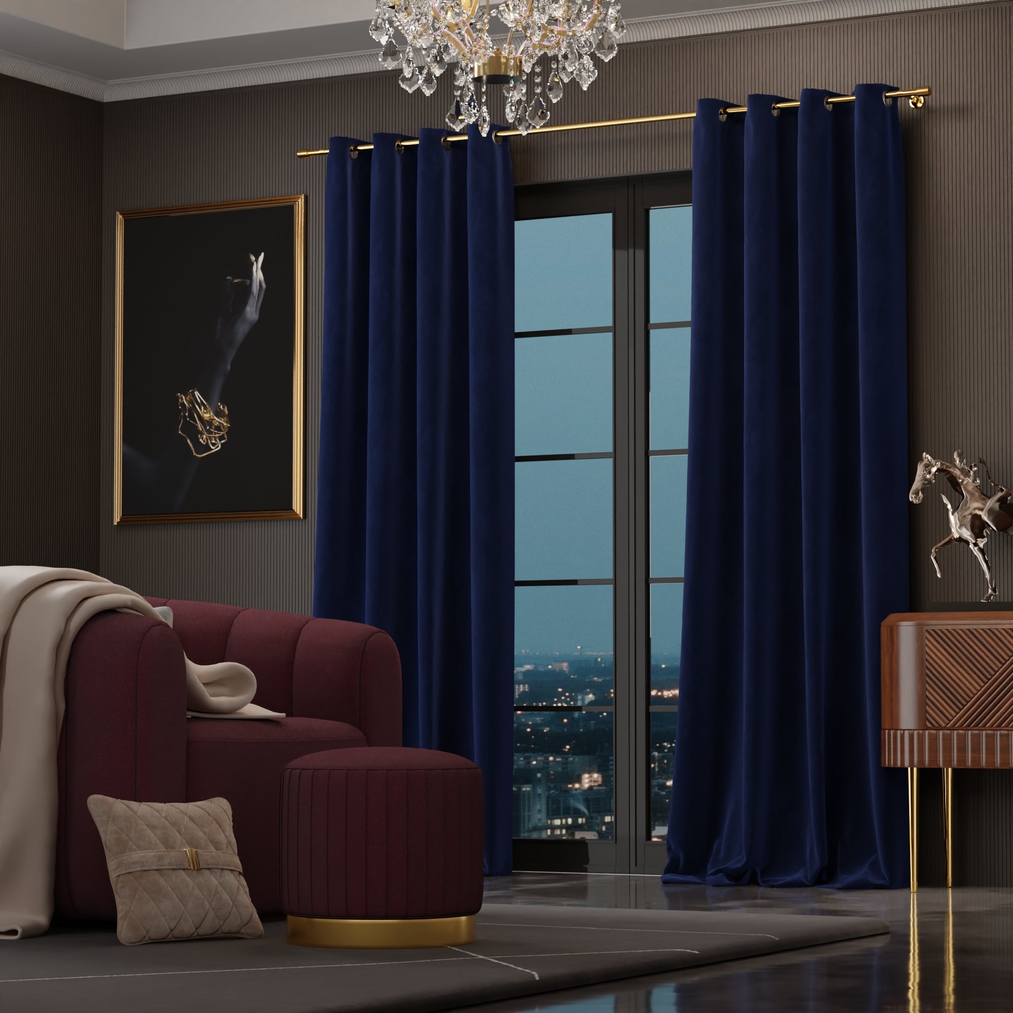 The Blue Enigma curtains speak of a twilight cruise on the Seine, their mystique blue velvet as compelling as the Paris skyline silhouetted against the gathering night.