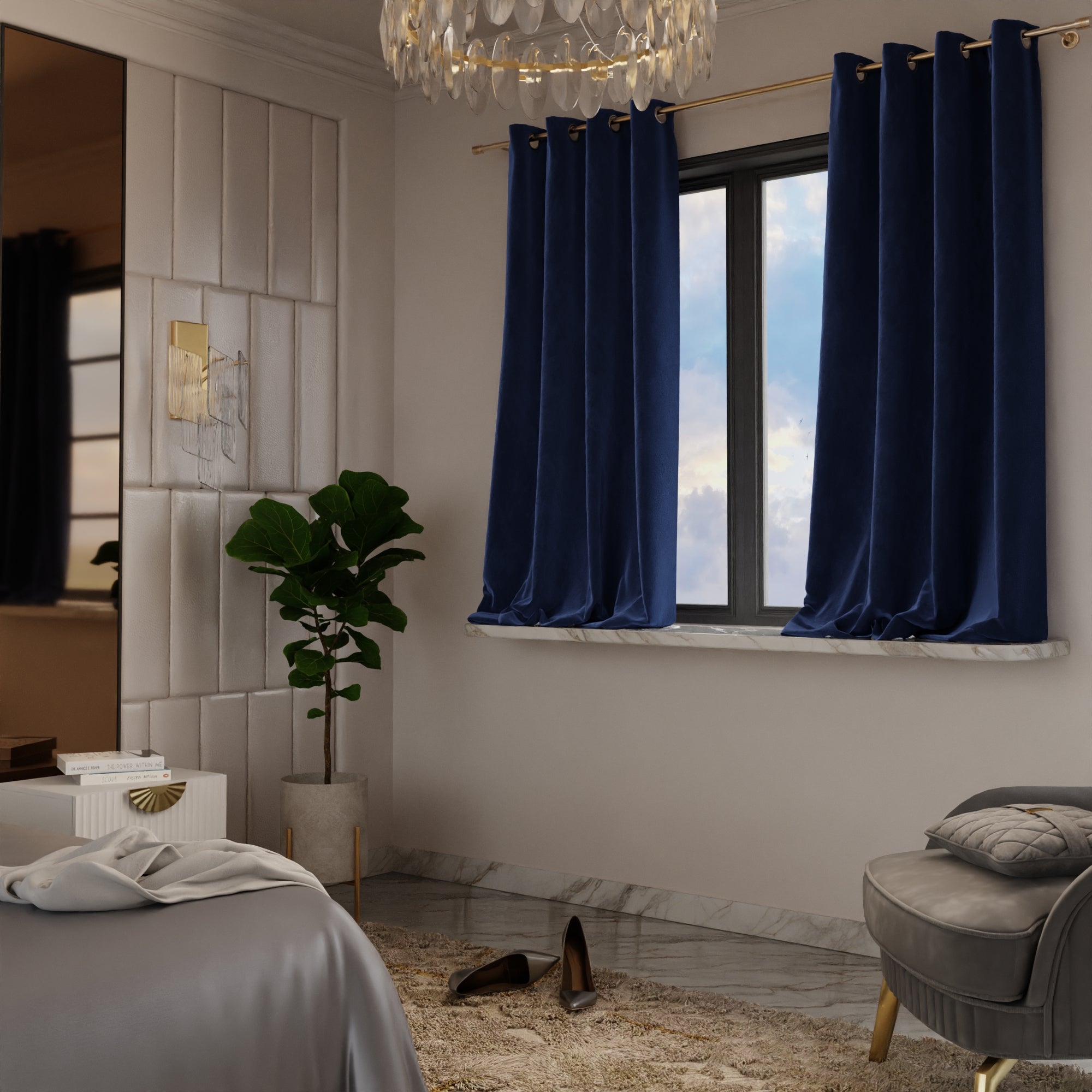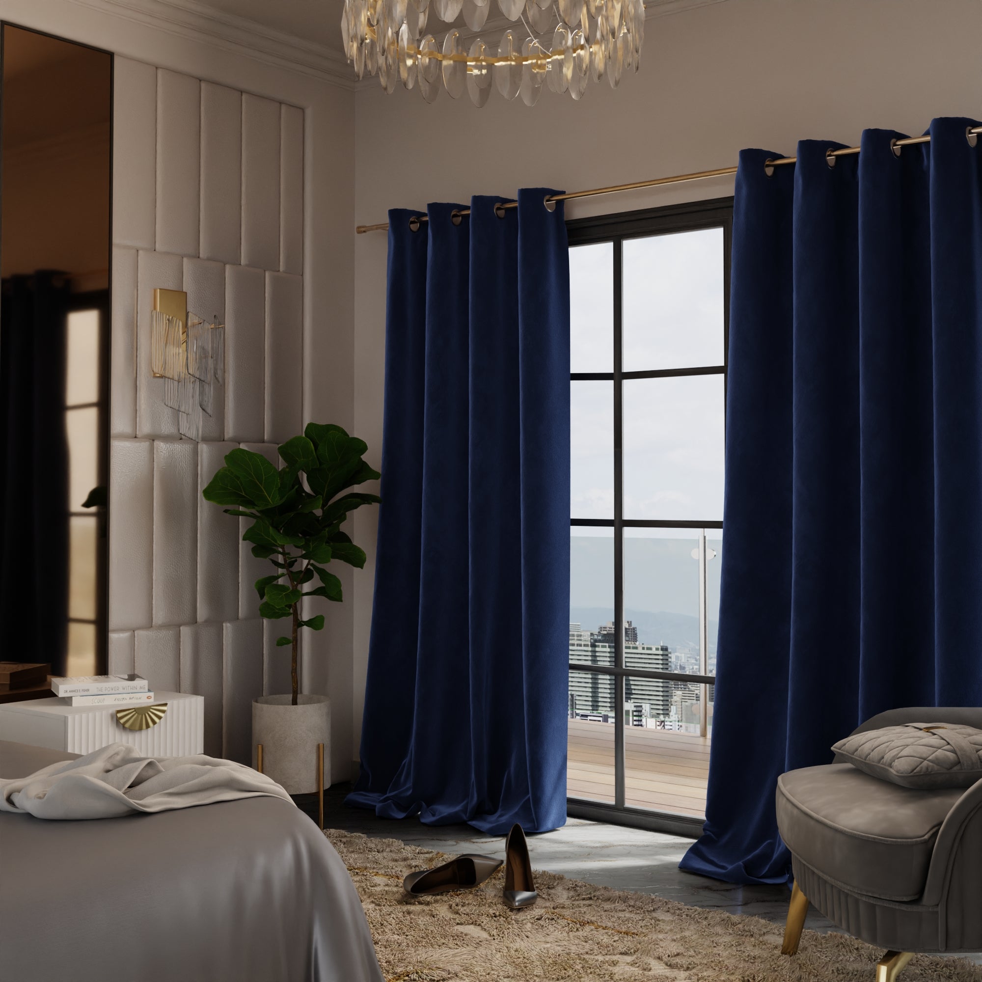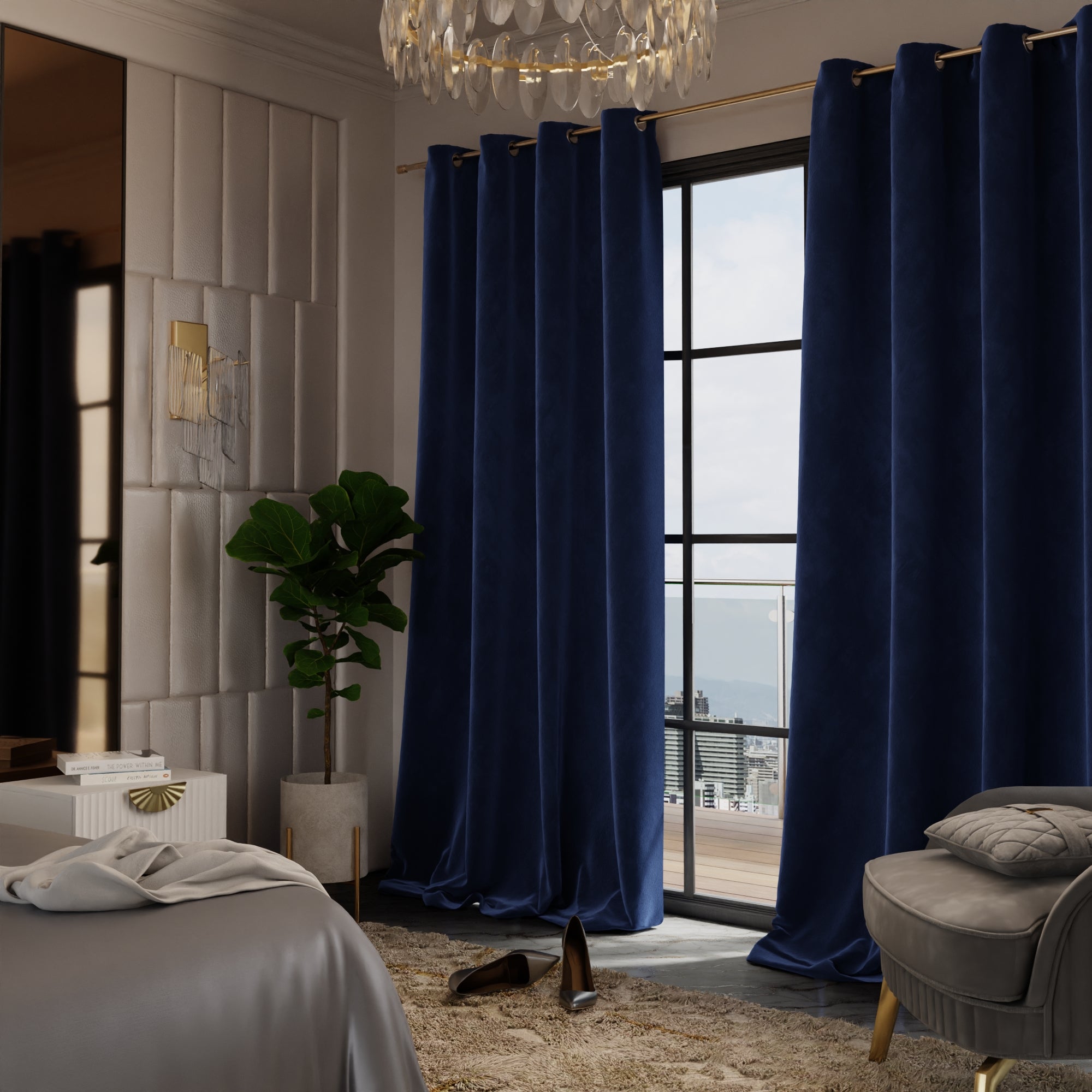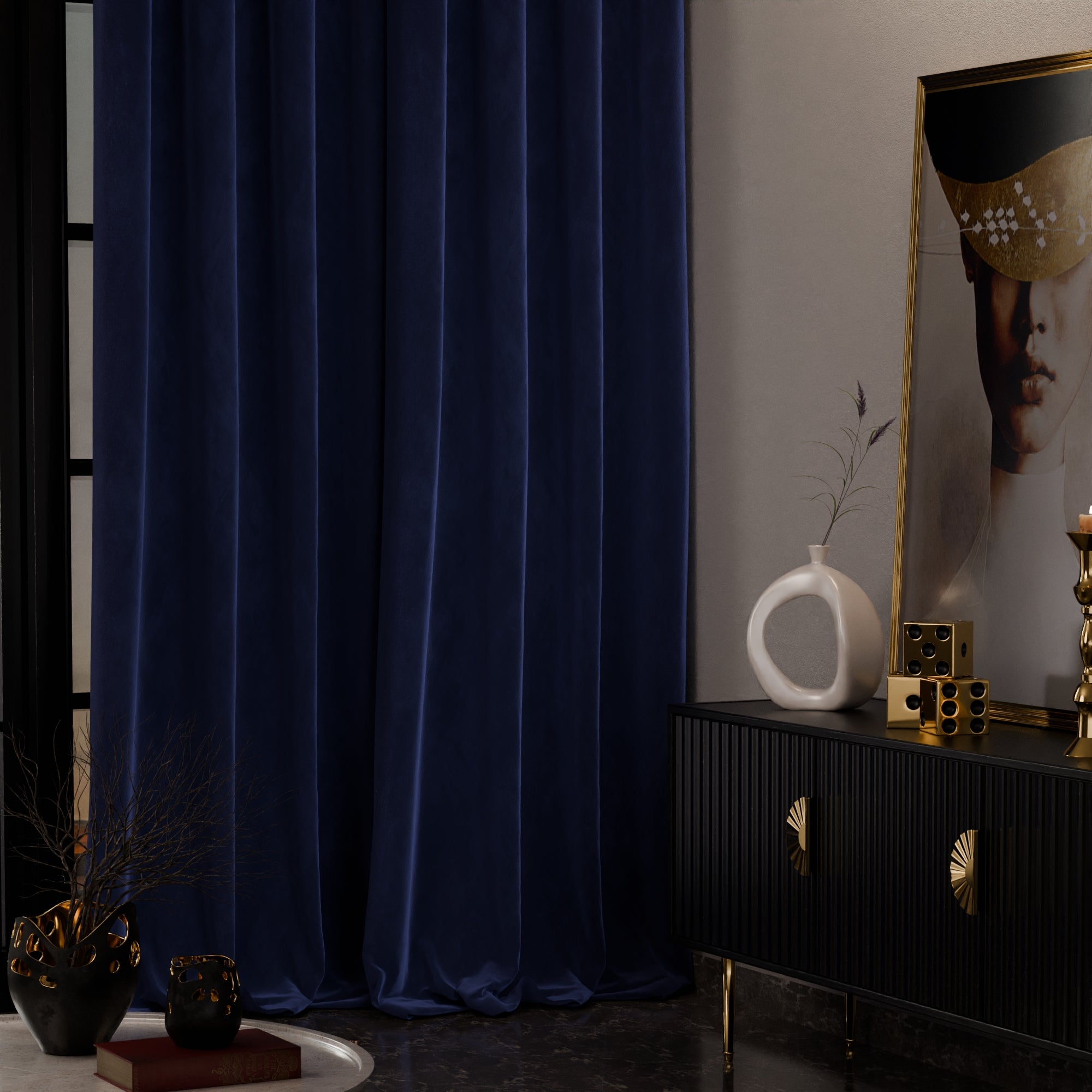 The Blue Enigma curtains speak of a twilight cruise on the Seine, their mystique blue velvet as compelling as the Paris skyline silhouetted against the gathering night.