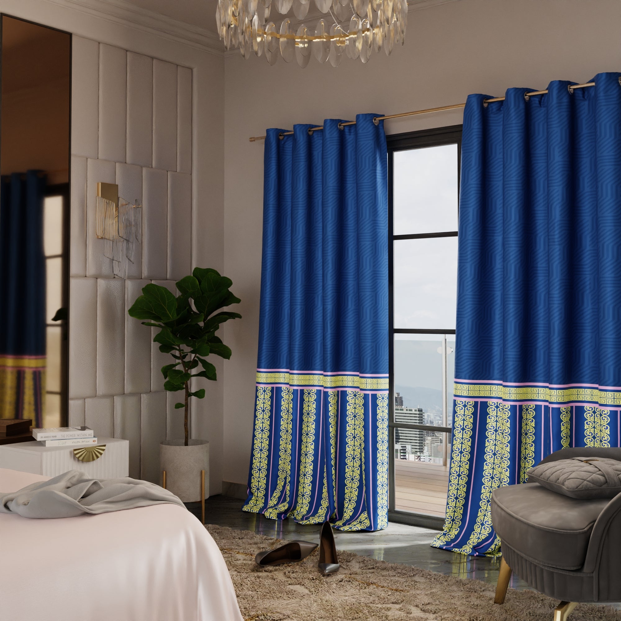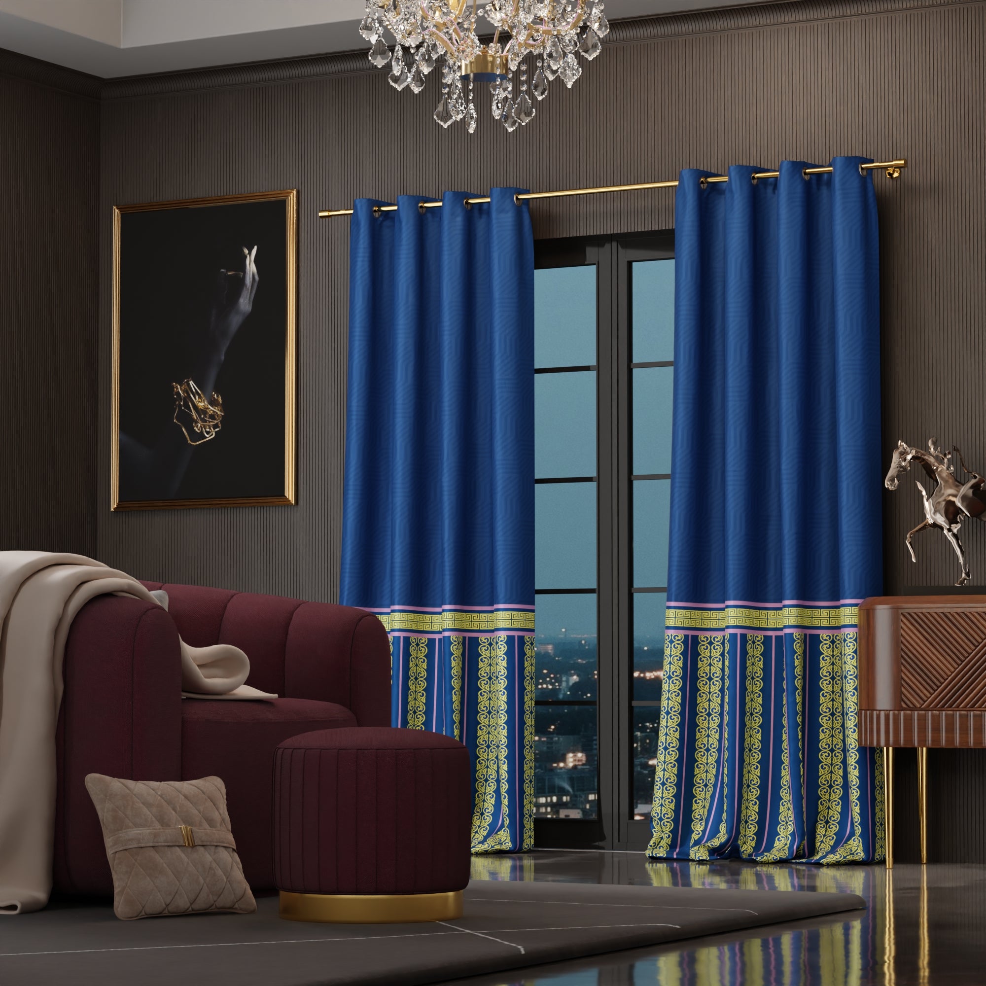 The Blue Monarch curtains redefine luxury with a modern twist, marrying deep royal blues with fresh design elements that speak to a new era of Versailles-inspired décor