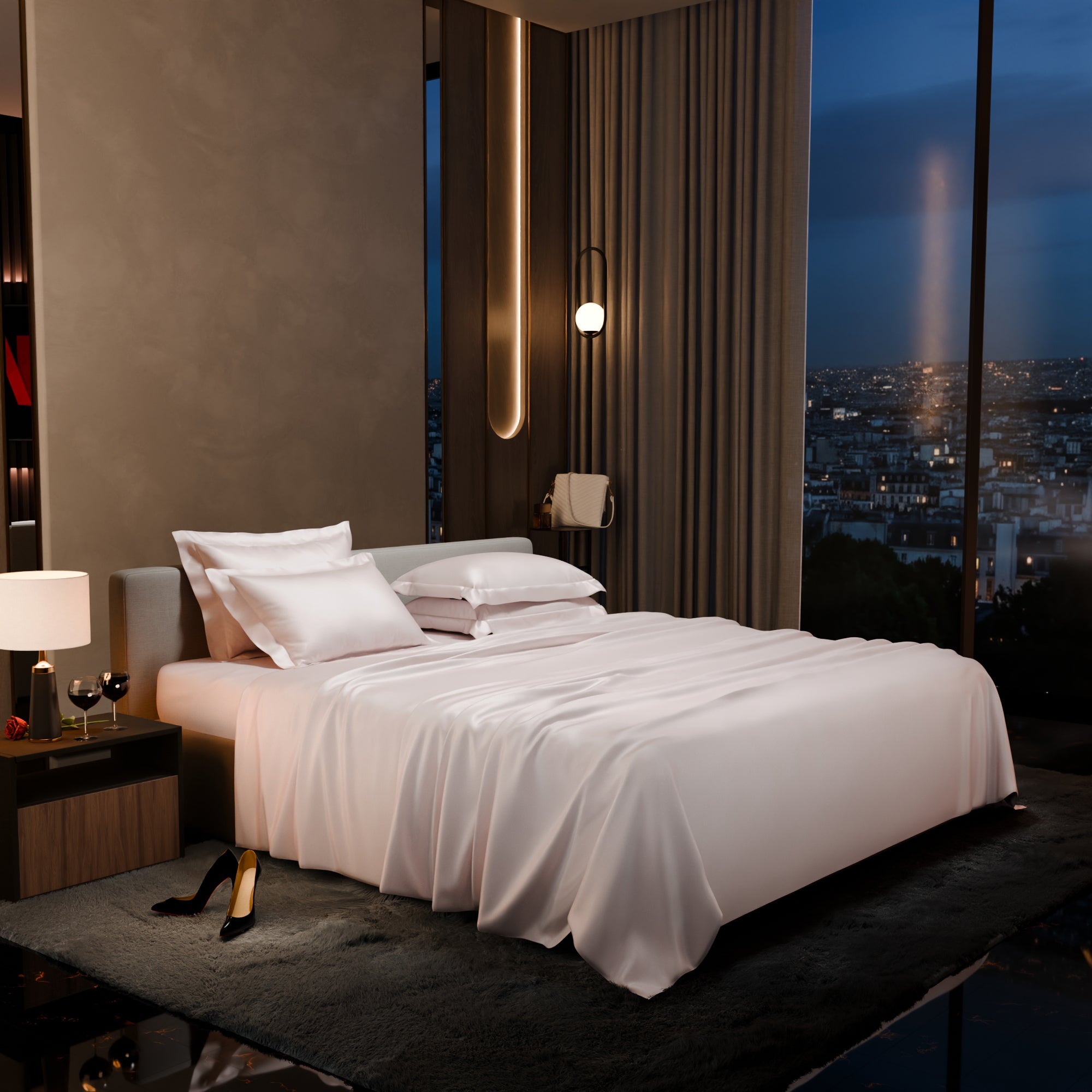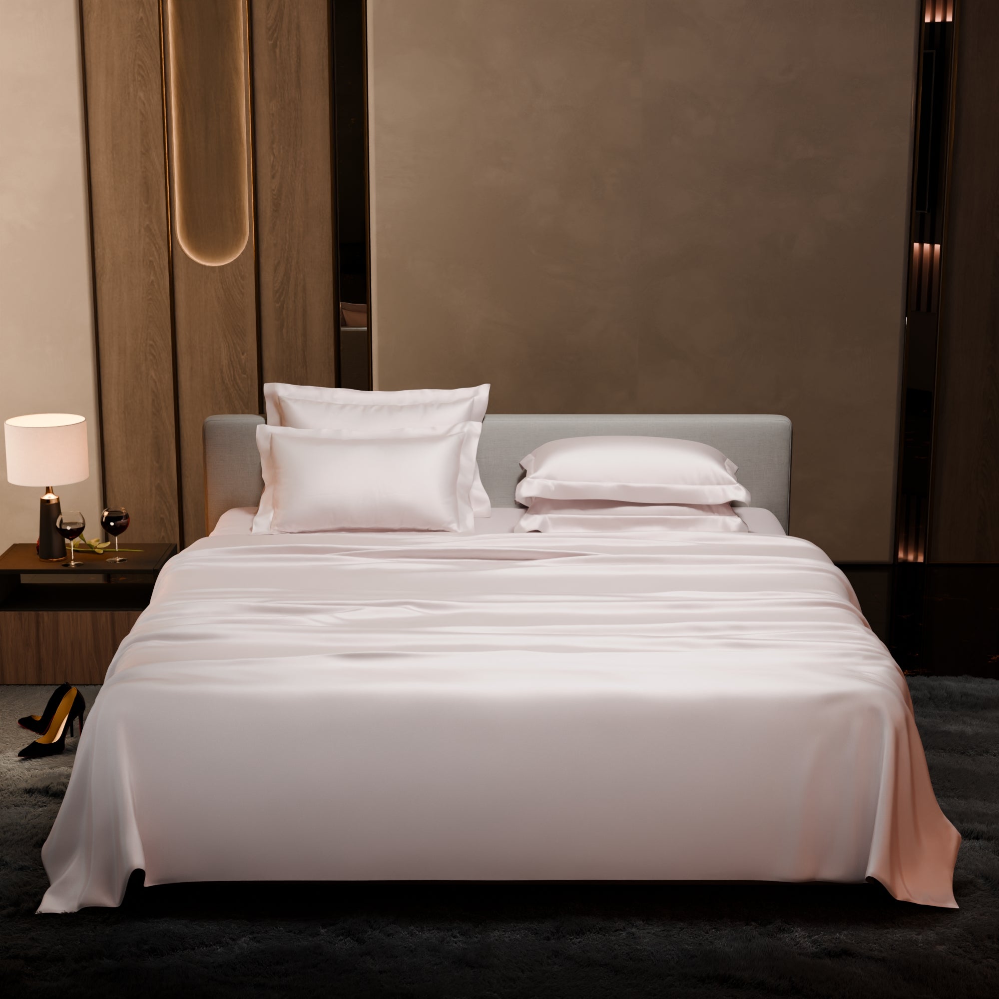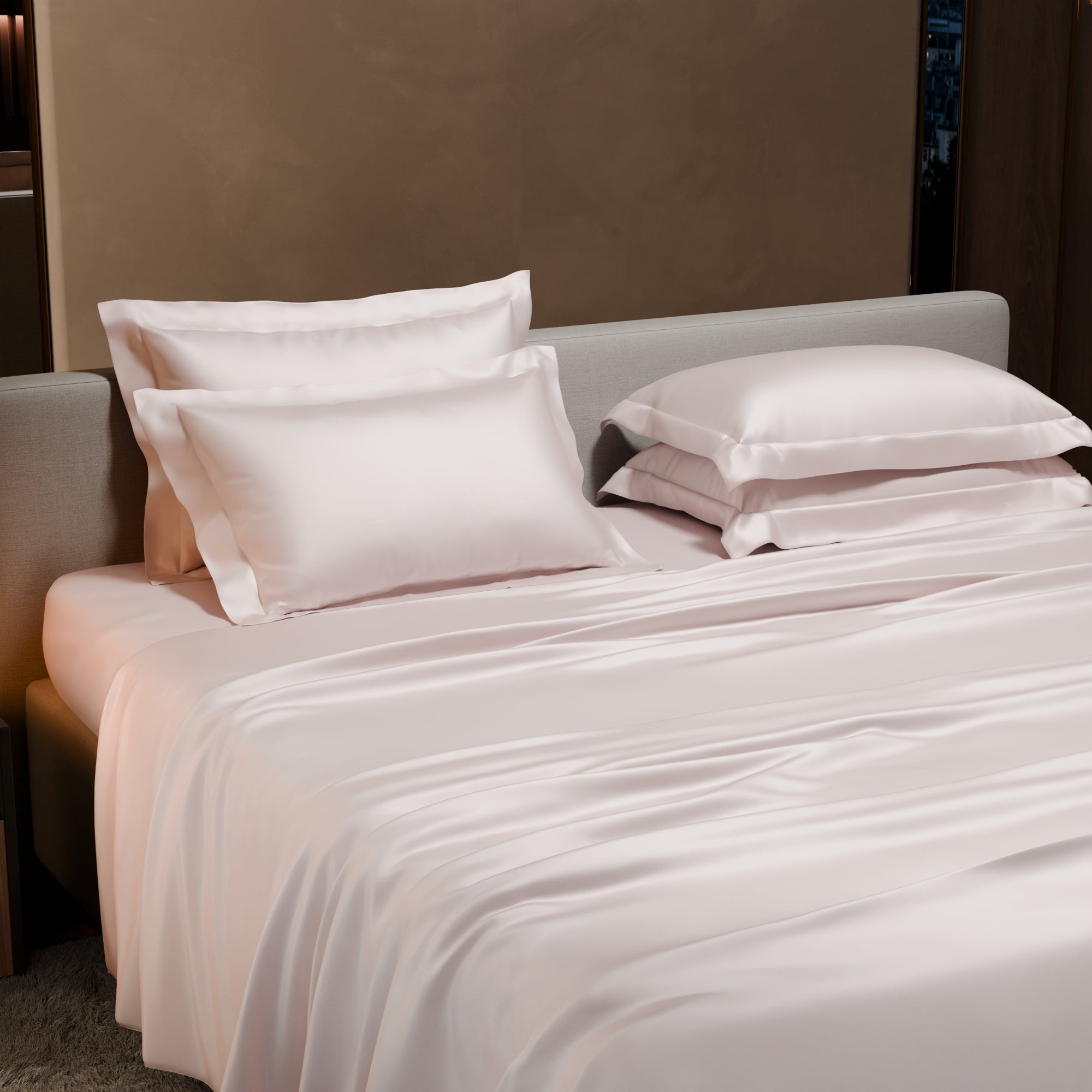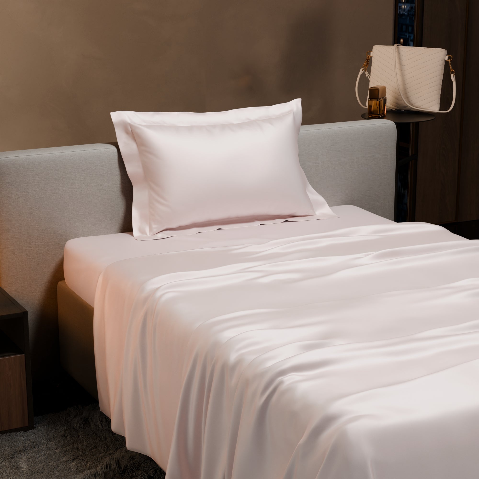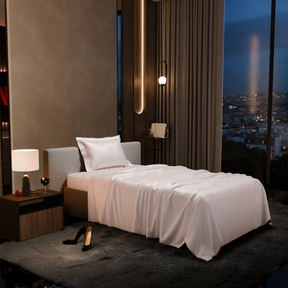 Sink into the rosy and elegant hues of Blushing Pink. These silk-like satin linen bed sets are designed to add a touch of opulence and romance to your intimate moments.