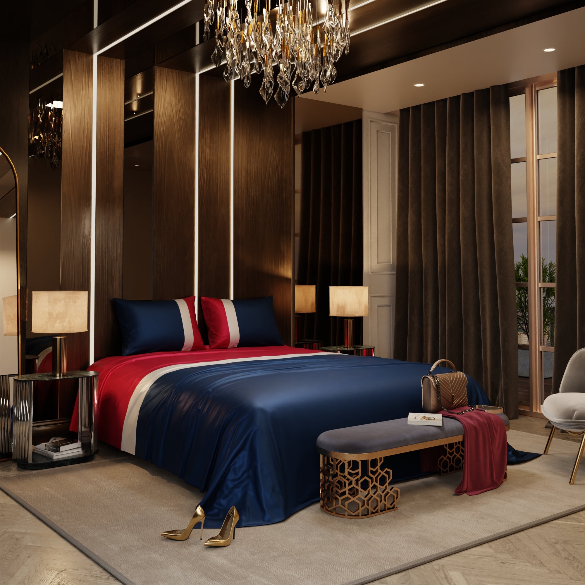 Boulevard Blue is a tribute to the contemporary art scene of Paris, captured in the luxurious weave of our exclusive Vogue satin collection. Its deep blue shades and minimalist design echo the elegance of a modern Parisian gallery, offering a serene yet striking statement in your personal retreat.