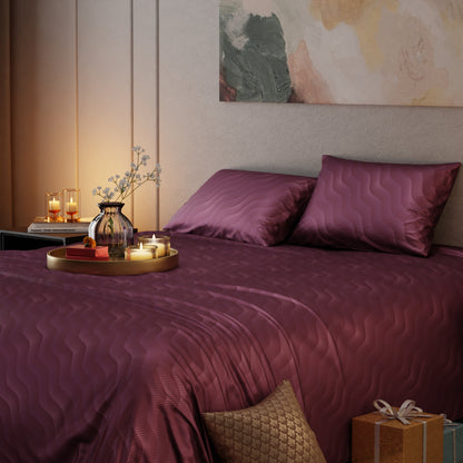 Indulge in the rich sophistication of Burgundy Bliss. This wine-coloured satin bed sheet set exudes an aura of intoxication, with its deep hue and intricate embossed patterns. The sensuous touch of satin coupled with the harmonious wave design creates an ambience of luxury, making every night an exquisite experience.