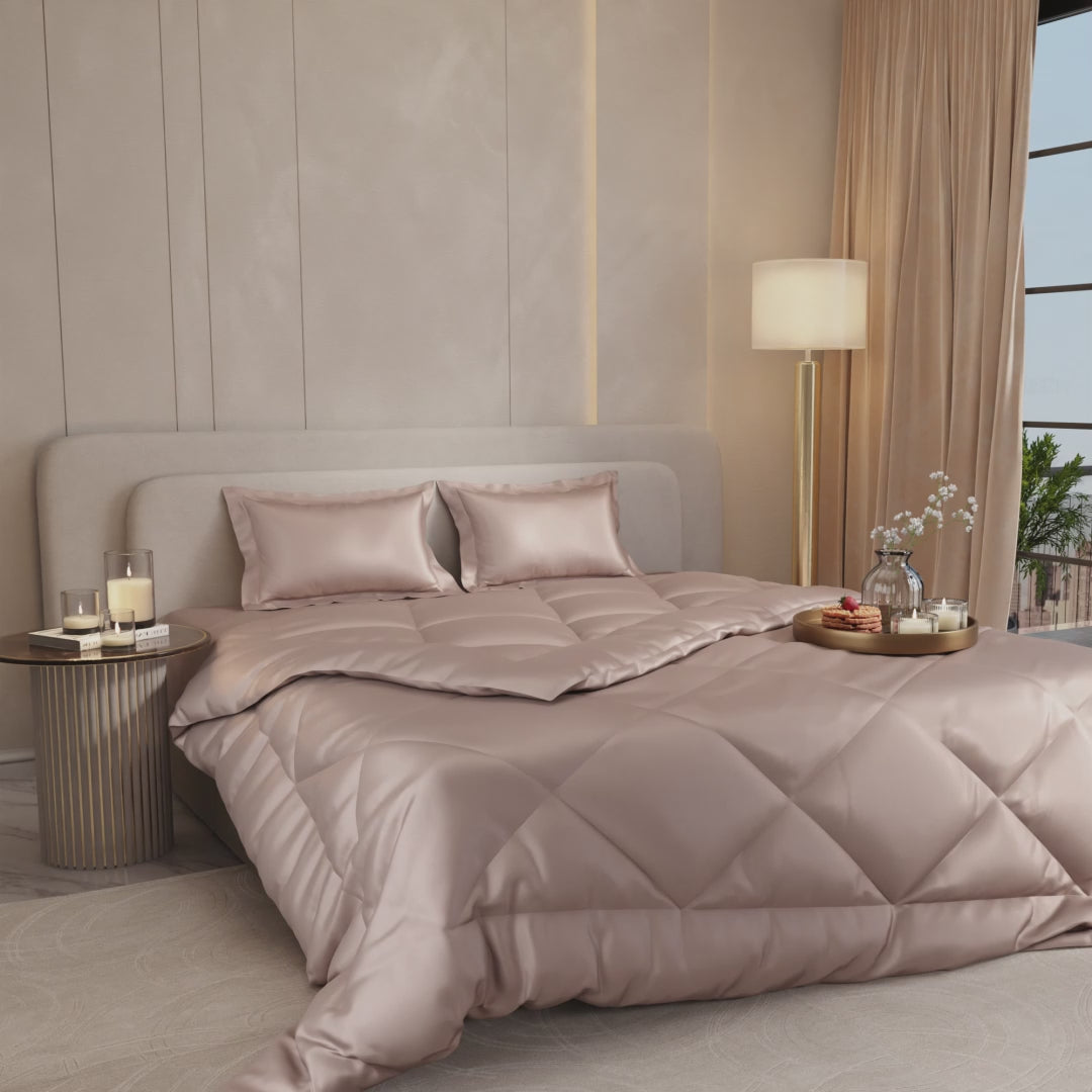 This 100% polyester UltraSatin Comforter can be machine-washed, tumbled dry, or ironed at low temperatures. Do not bleach. Do not dry in direct sunlight. Learn More