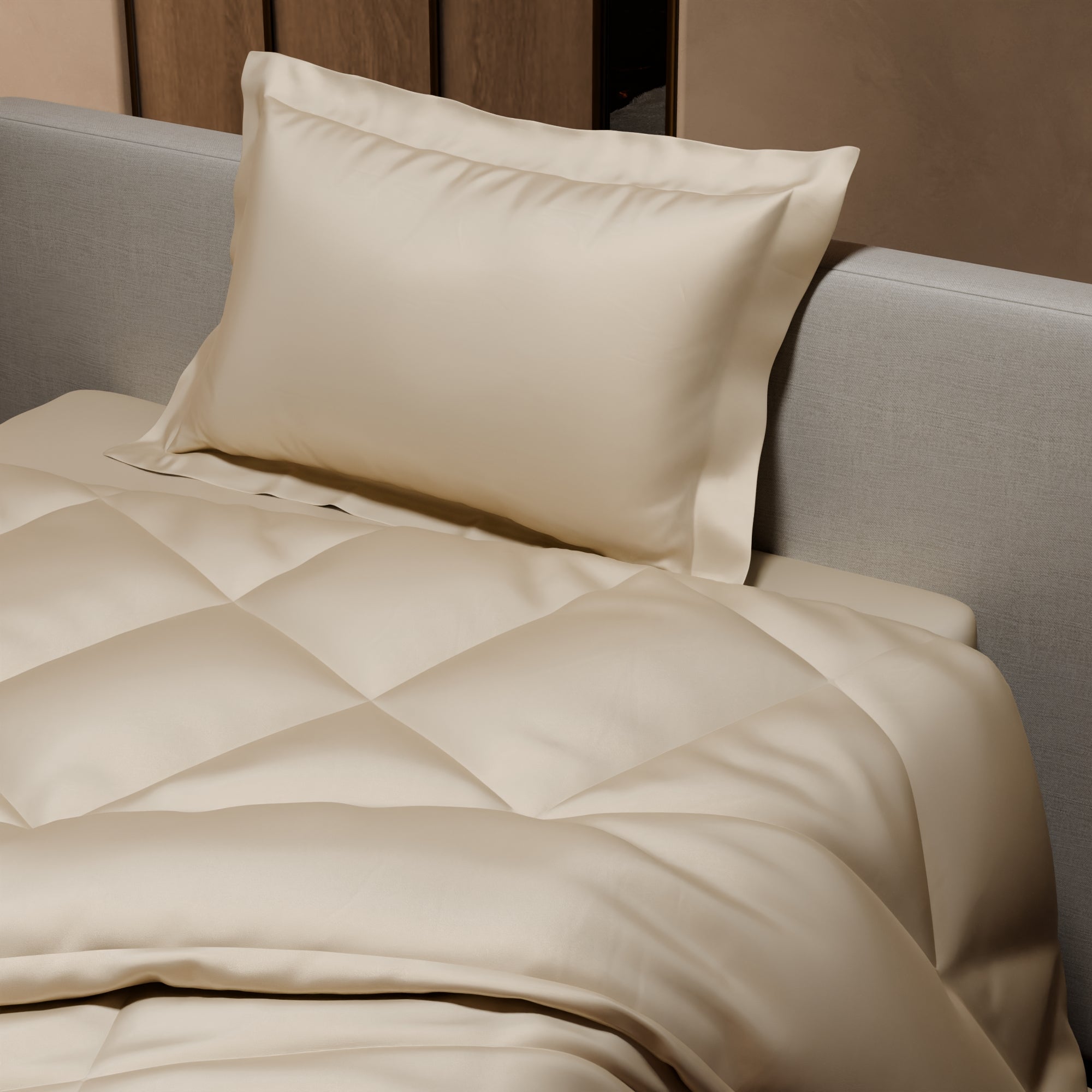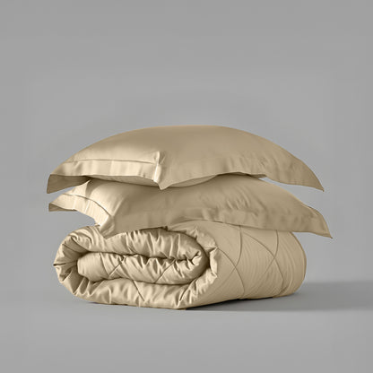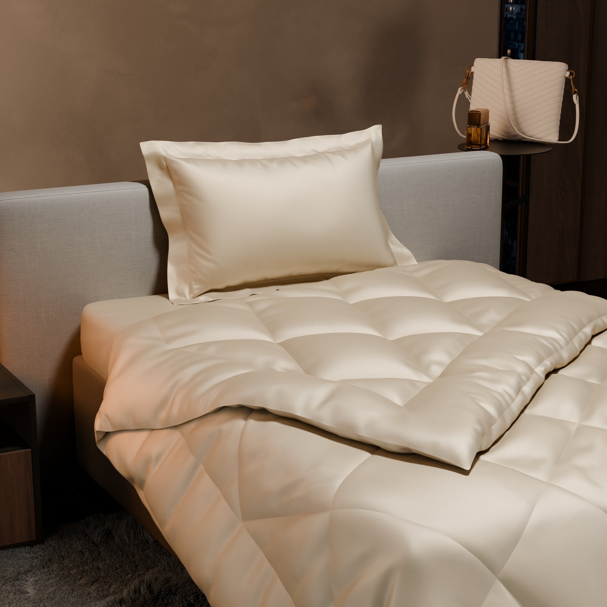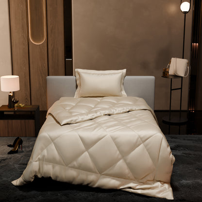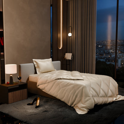 Crafted with premium materials, the soft, cream-coloured comforter offers the perfect balance of warmth and style for your bedroom. The subtle warmth of buttercream hues, combined with the silky smoothness of satin, creates an experience of unparalleled comfort and sophistication. Drift into dreams wrapped in the sumptuous allure of Charming Ivory.