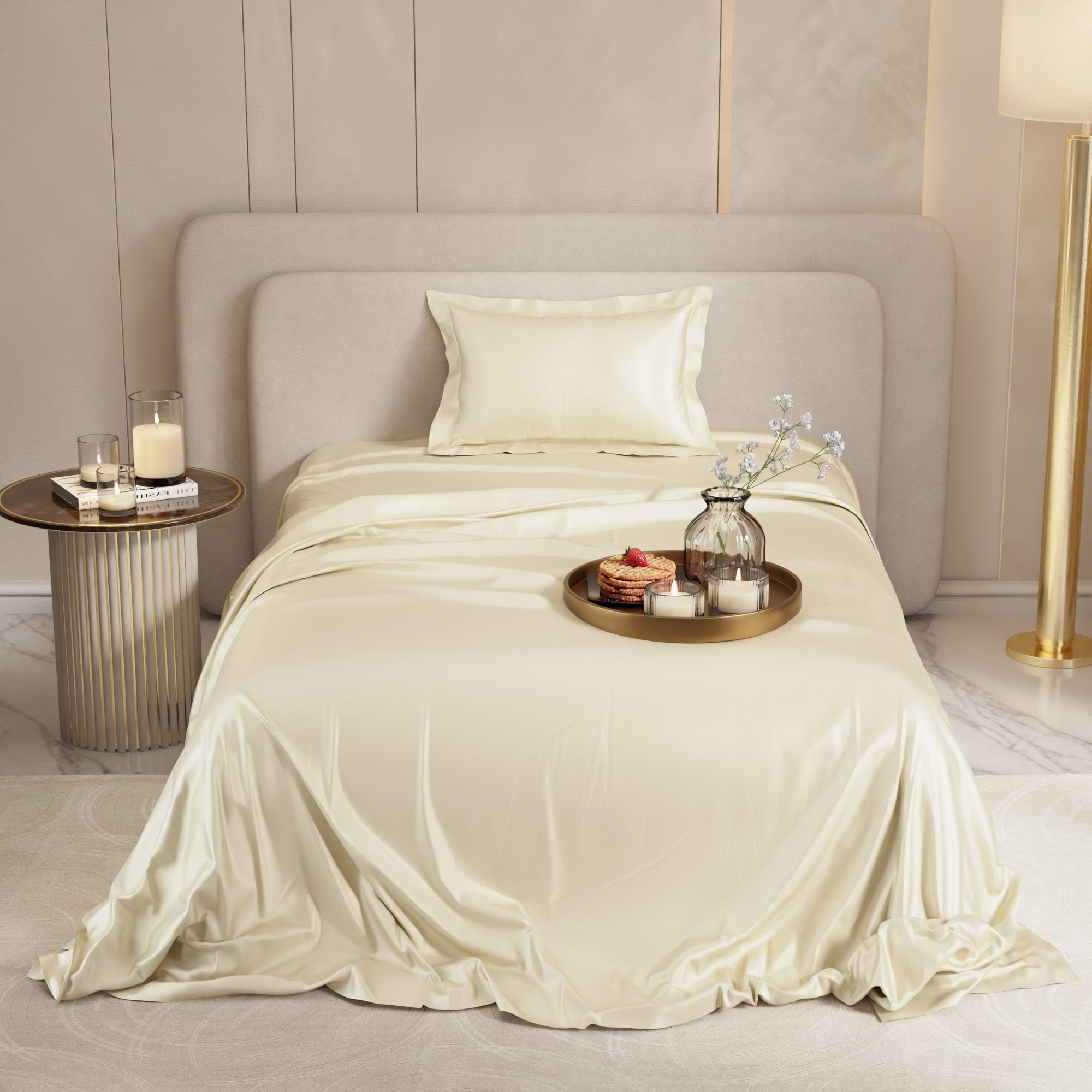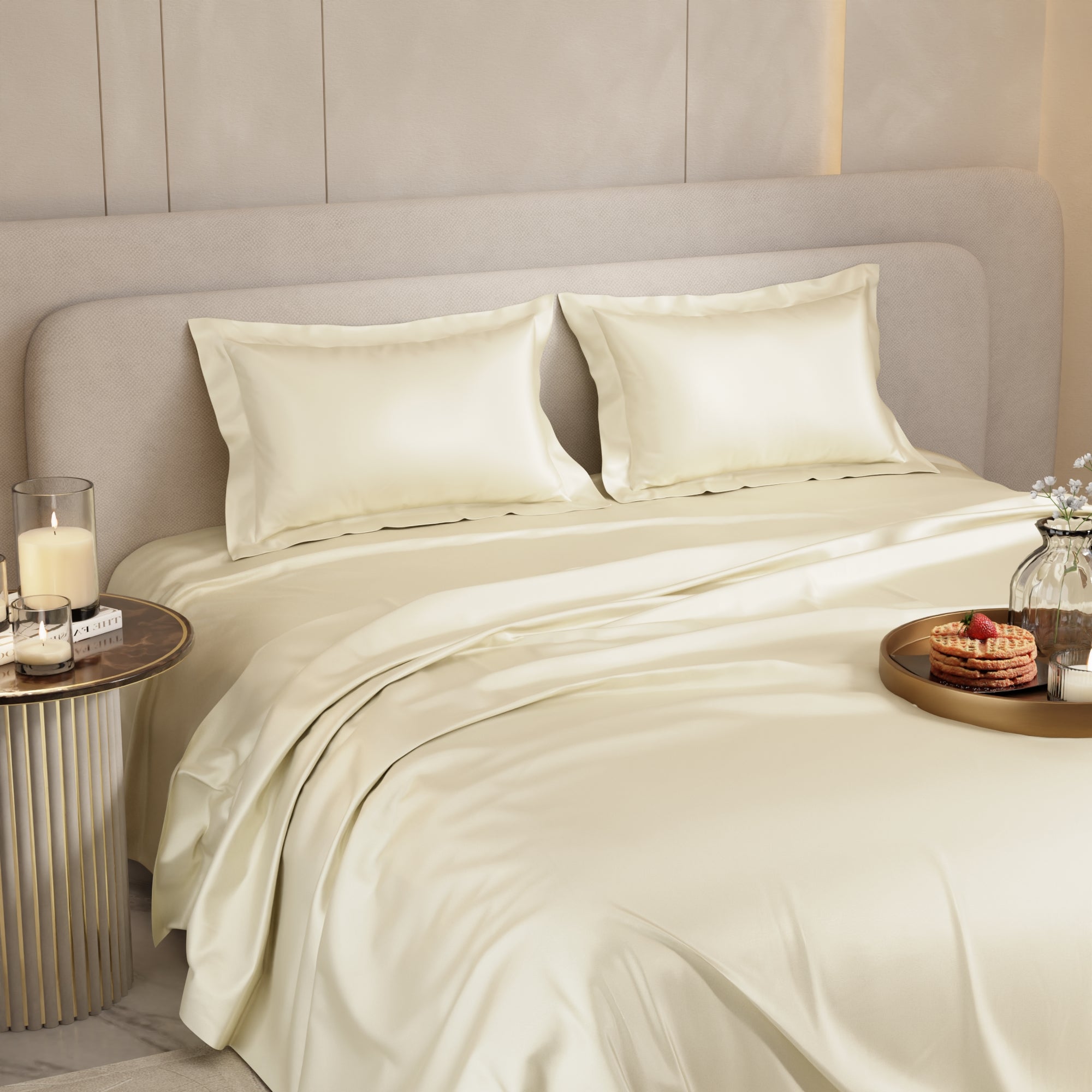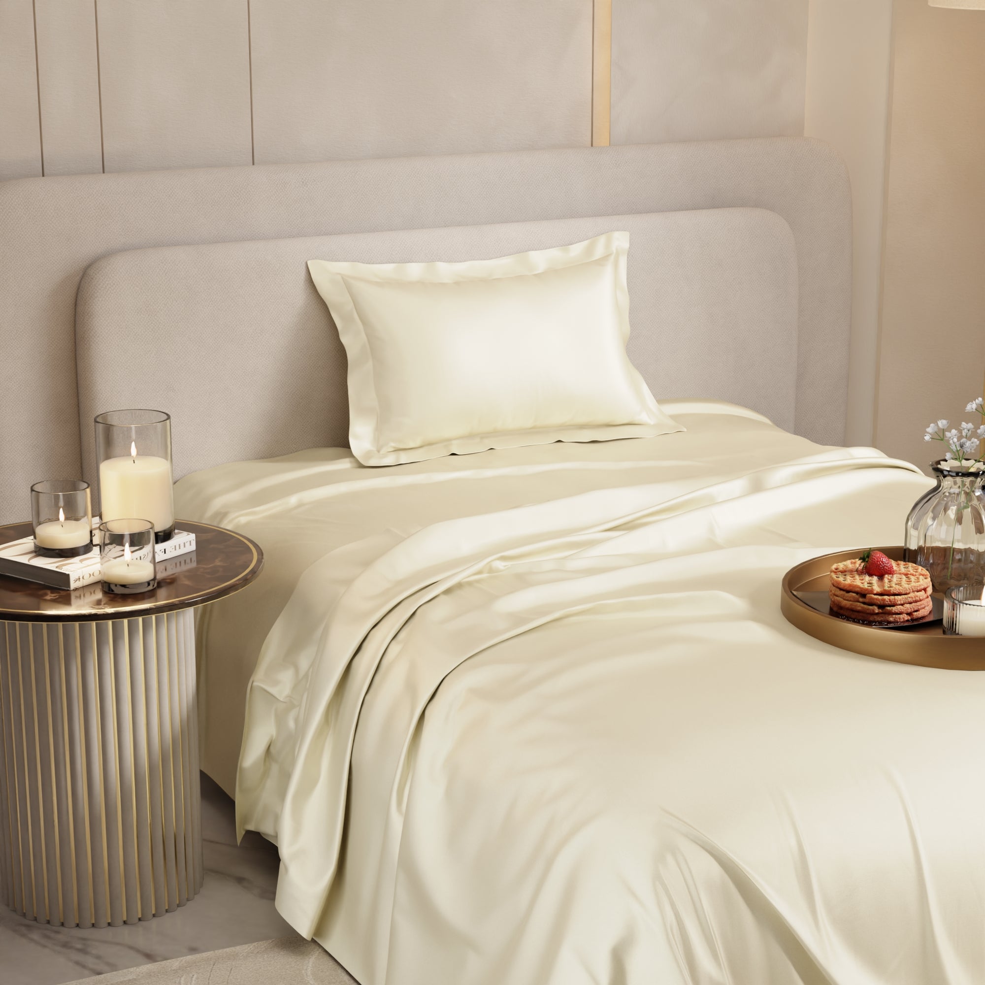 The Charming Ivory is a soft, cream-coloured bed sheet set that uplifts your bedroom's romantic aesthetics with a touch of elegance. The subtle warmth of buttercream hues, combined with the silky smoothness of satin, creates an experience of unparalleled comfort and sophistication. Drift into dreams wrapped in the sumptuous allure of Charming Ivory.