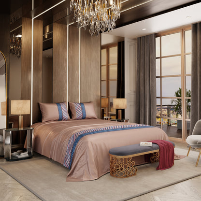 Indulge in the sheer beauty of our Château Charisma Champagne satin bedsheet set. The soft champagne colour perfectly blends luxury and precision, enhancing your bedroom's ambience. Inspired by the grandeur of the Palace of Versailles, this bedsheet boasts a regal printed panel design, transporting you to a world of sophistication and refinement, making it a must-have for those who appreciate the finer things in life.