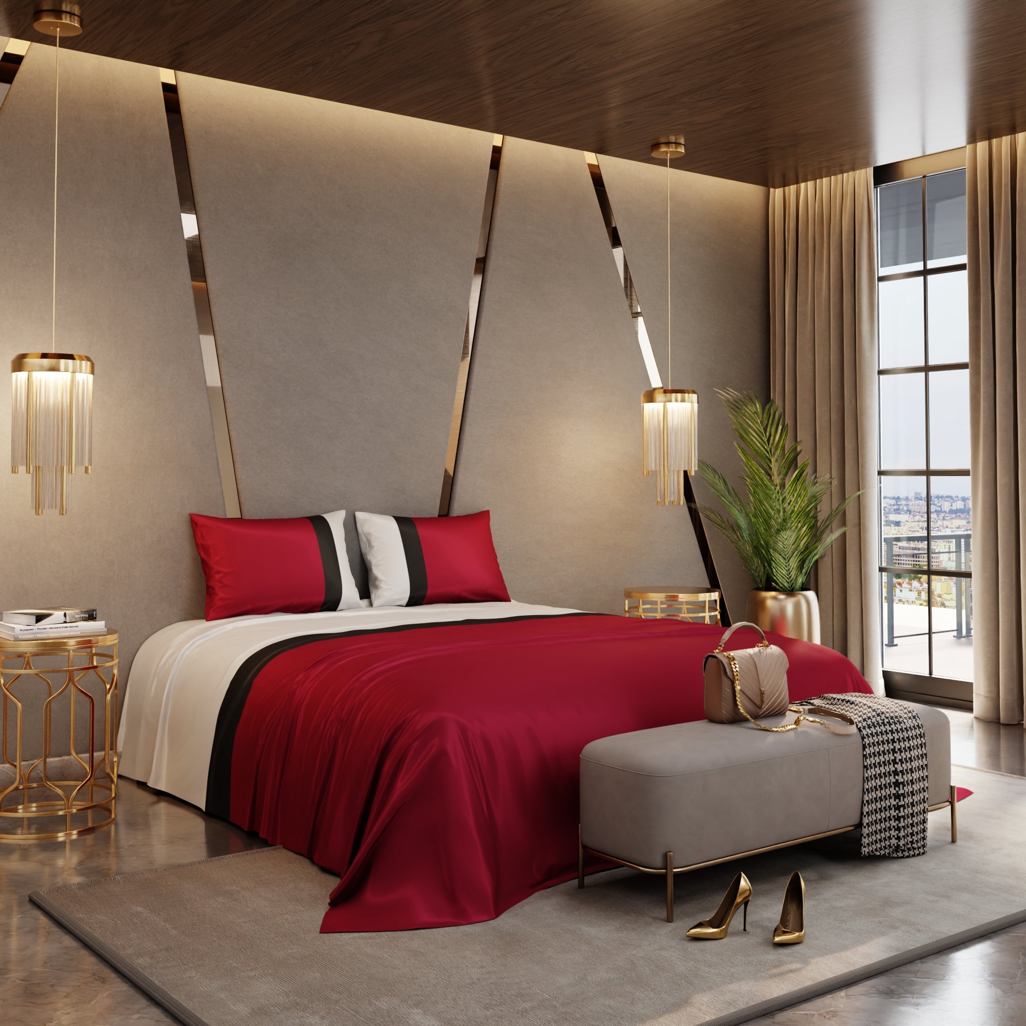 With the Stoa Paris vogue Bedding Collection - Chic Paris Bands, you're not just decorating your bedroom; you're creating a retreat where comfort and style come together. This exquisite satin bedsheet, graced by a combination of white, black, and red tones, envelops your sleeping space in an ambience that radiates modernity and sophistication. Elevate your bedroom decor with this refined bedding collection, where luxury and relaxation converge in perfect harmony.