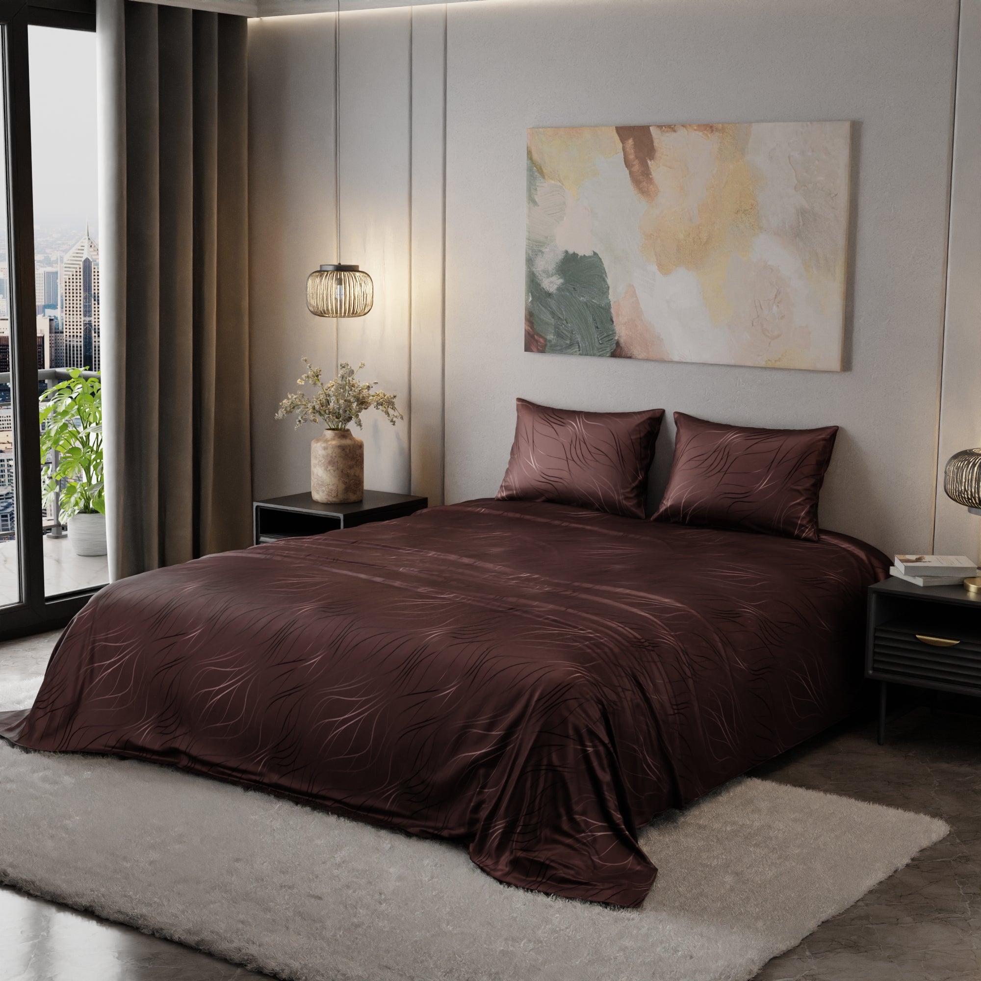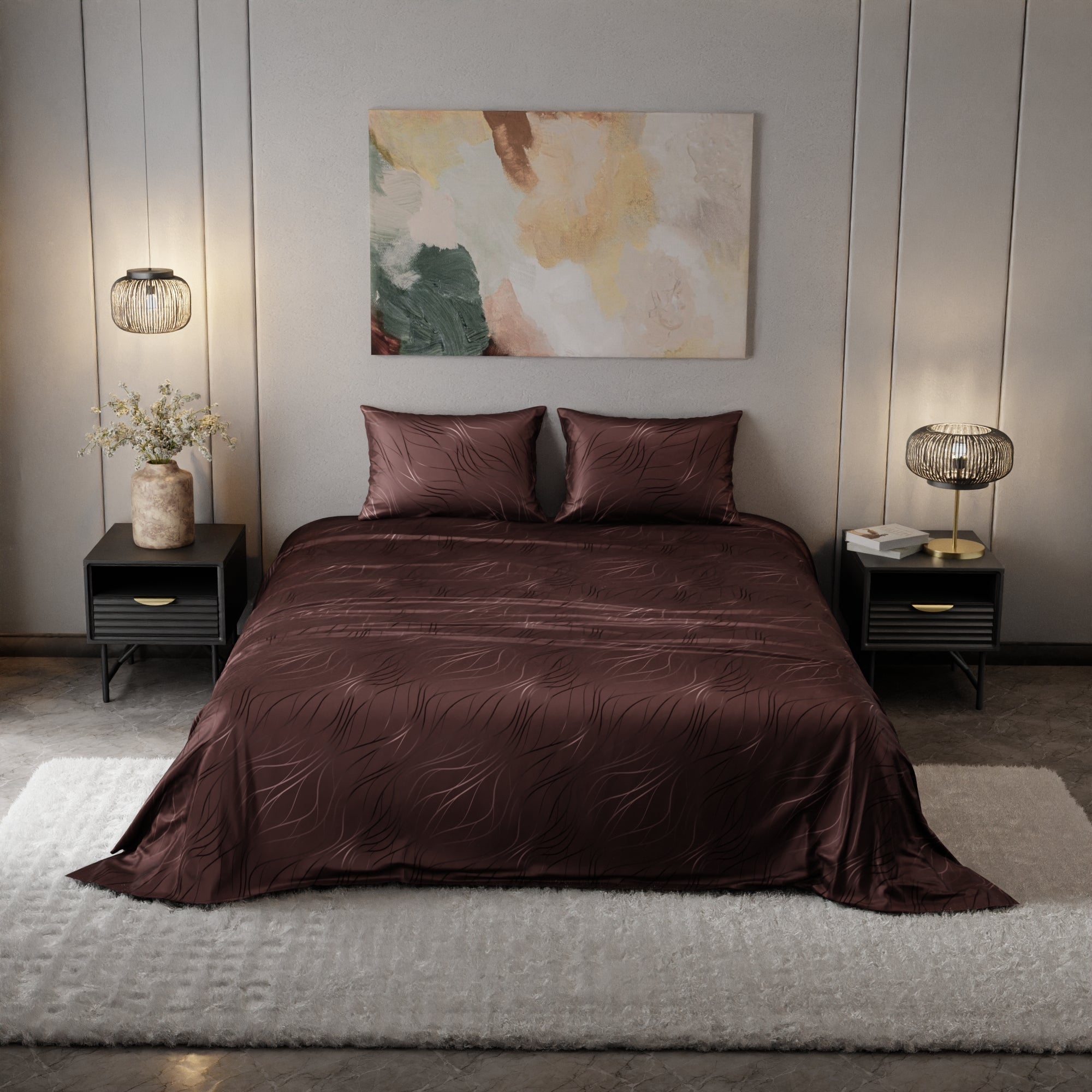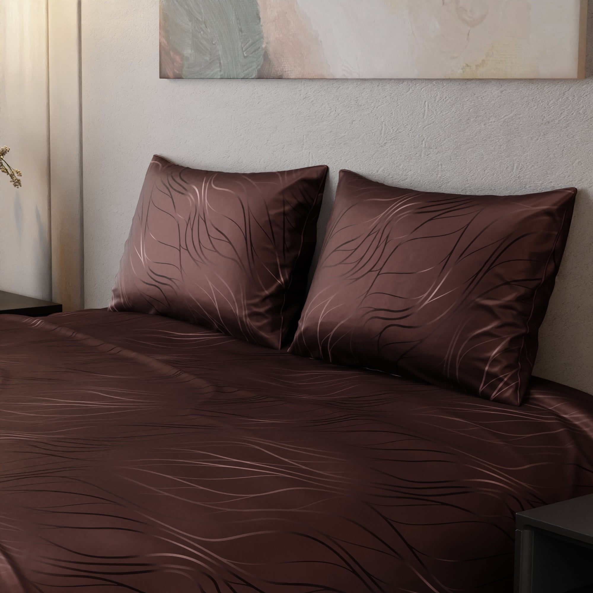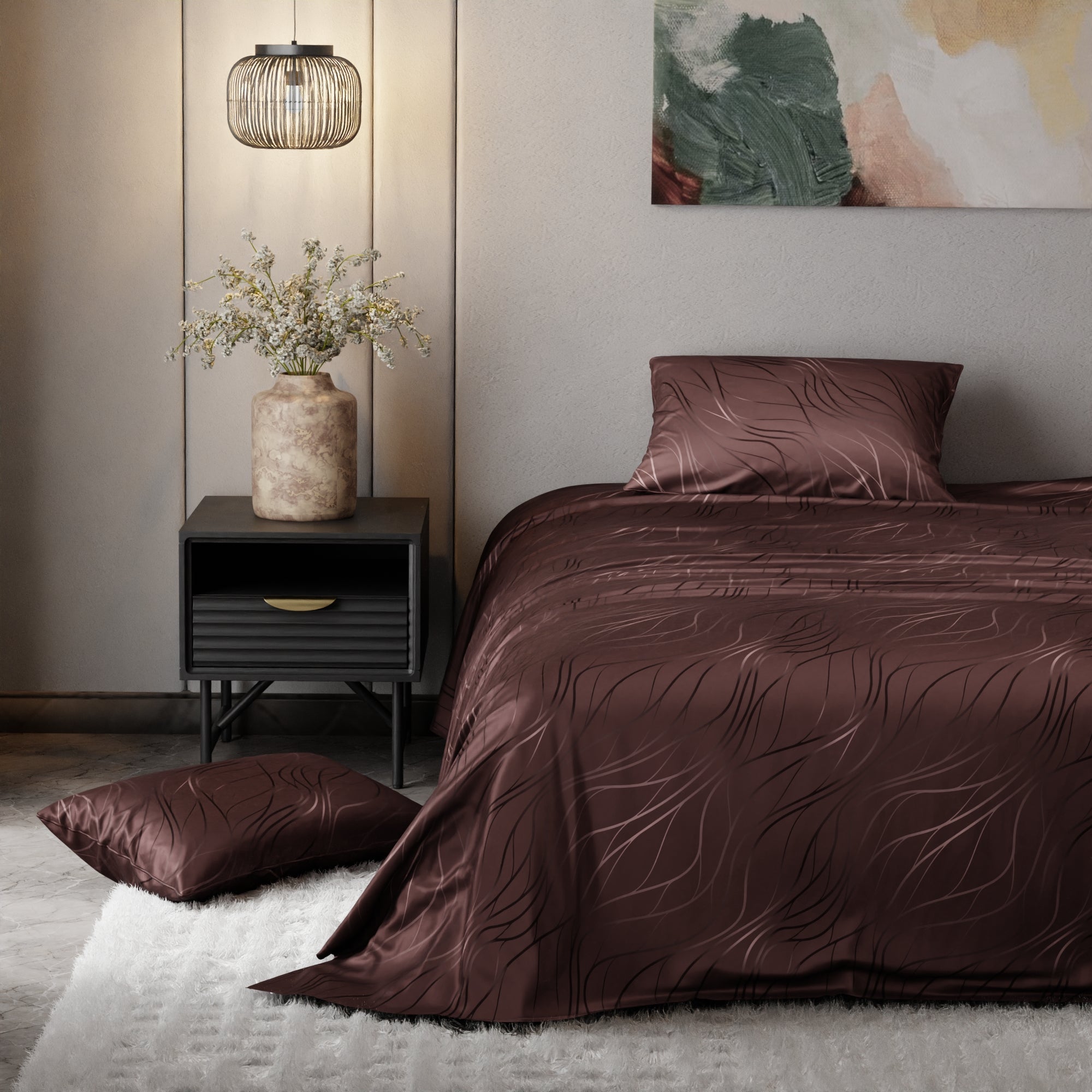 Savour the warmth and indulgence of Chocolat Noir. This chocolate-coloured satin bed sheet features embossed brown stripes, bringing a touch of cosiness to your bedroom. The rich brown tones evoke a sense of soothing relaxation, making Chocolat Noir a delightful choice for those seeking a sumptuous sleep experience.