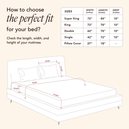 - Super King Fitted Bedsheet Set includes: 1 Bedsheet (72" x 84" + 10" Drop) + 2 Pillow Covers (18" x 27")