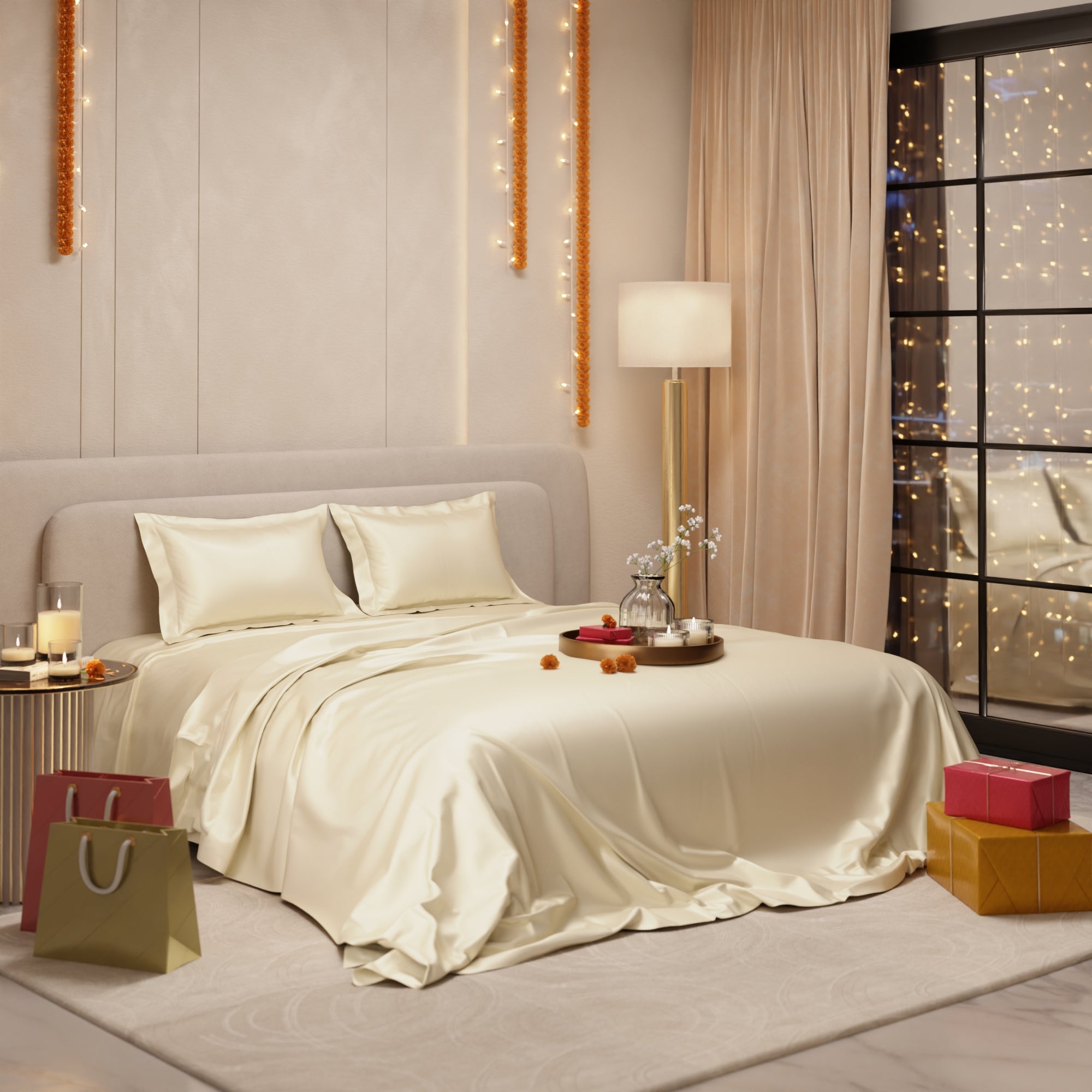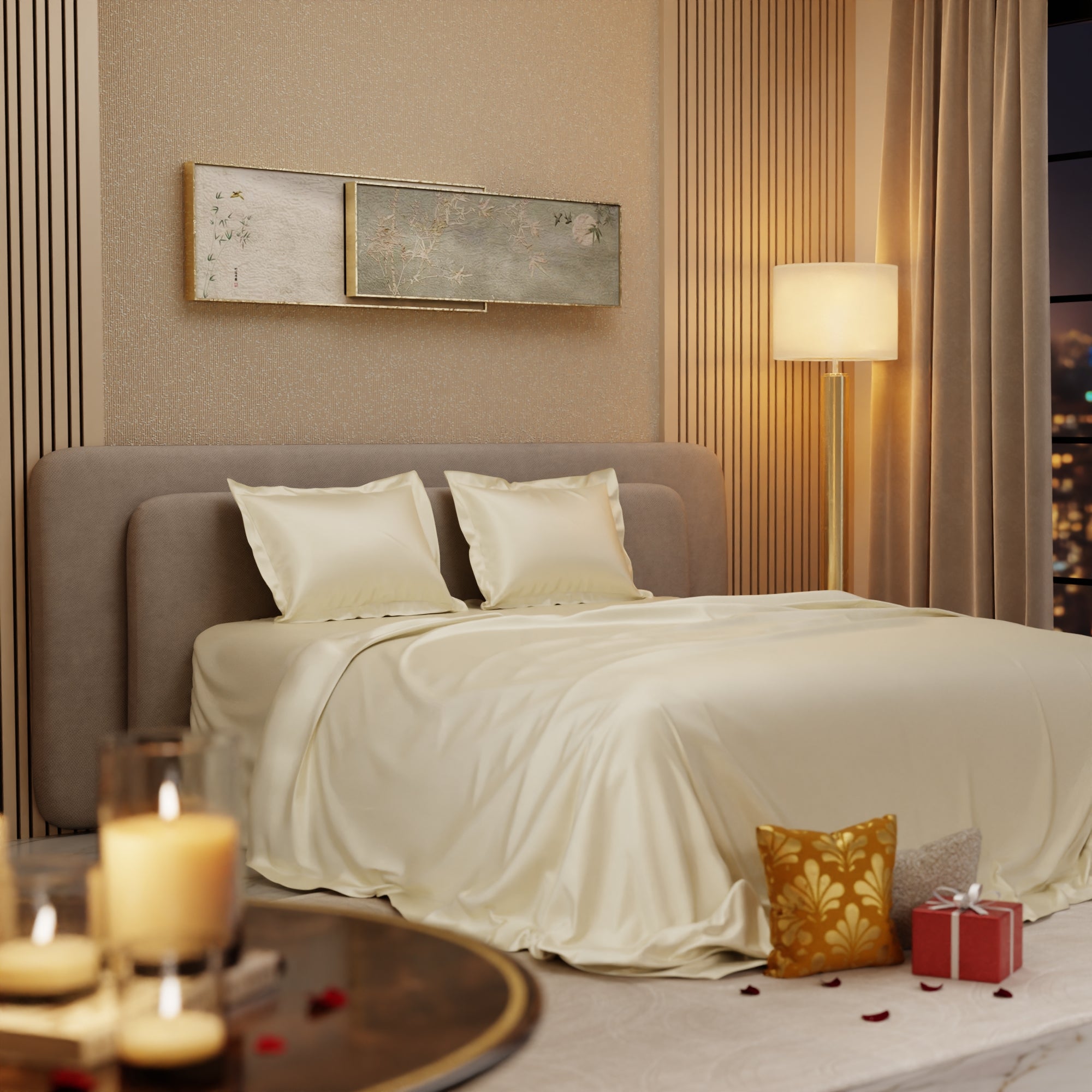 The Charming Ivory is a soft, cream-coloured bed sheet set that uplifts your bedroom's romantic aesthetics with a touch of elegance. The subtle warmth of buttercream hues, combined with the silky smoothness of satin, creates an experience of unparalleled comfort and sophistication. Drift into dreams wrapped in the sumptuous allure of Charming Ivory.
