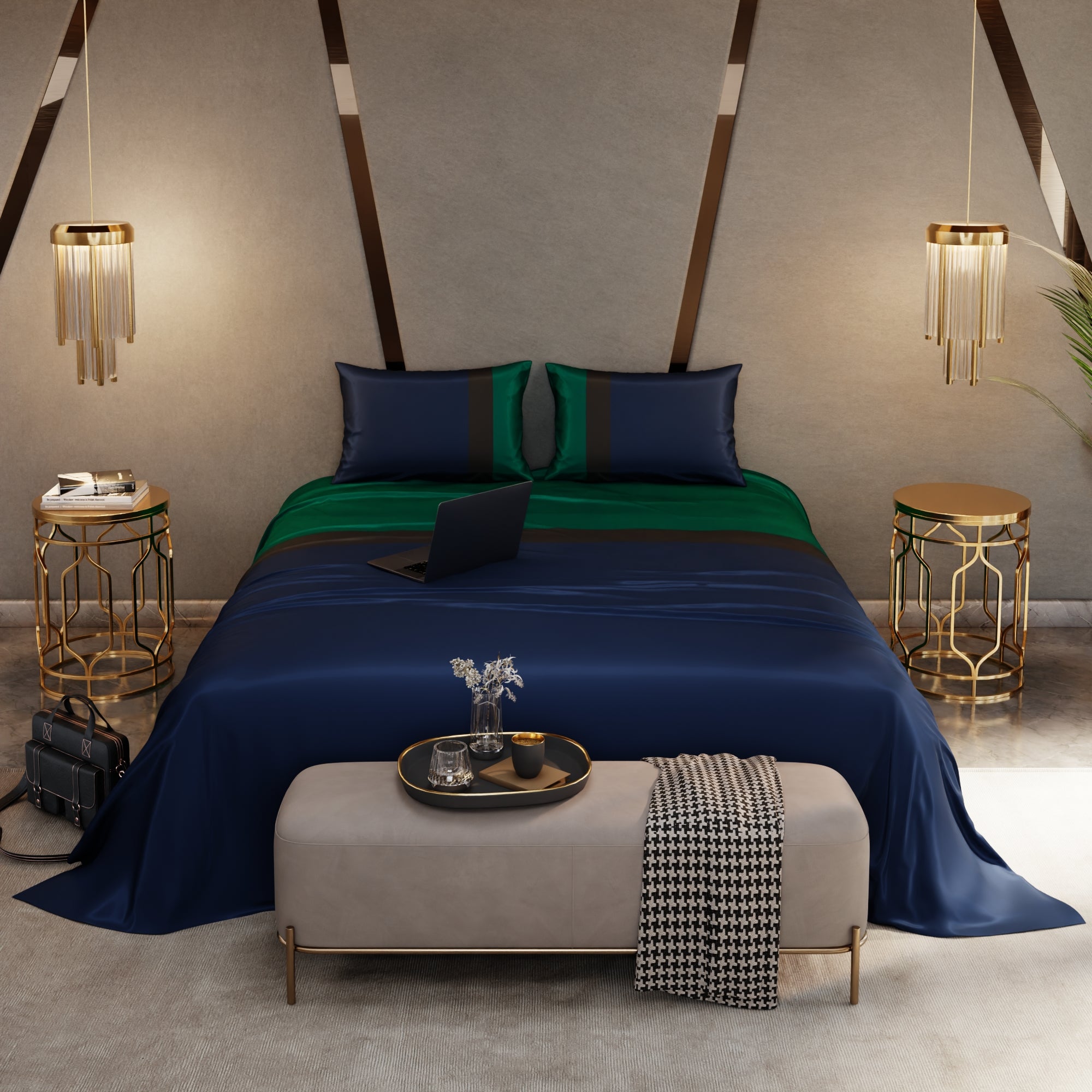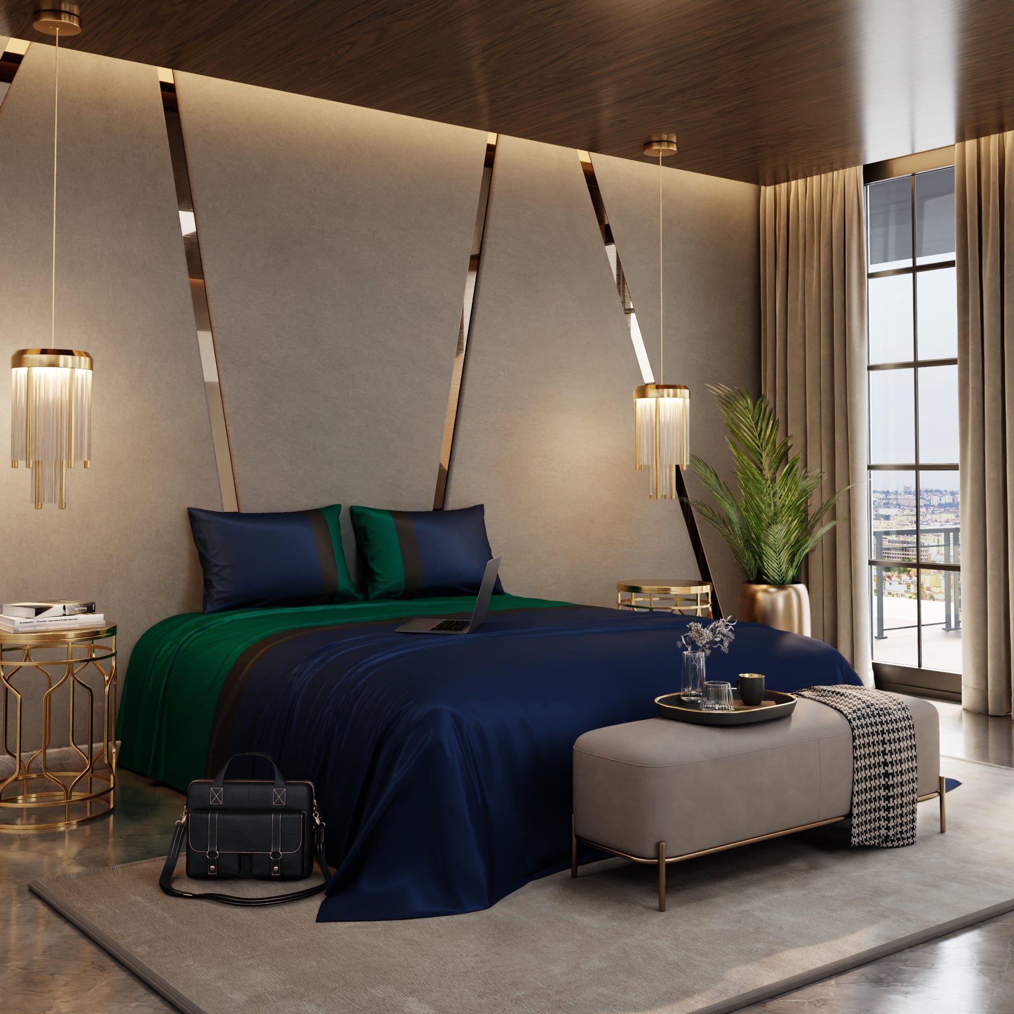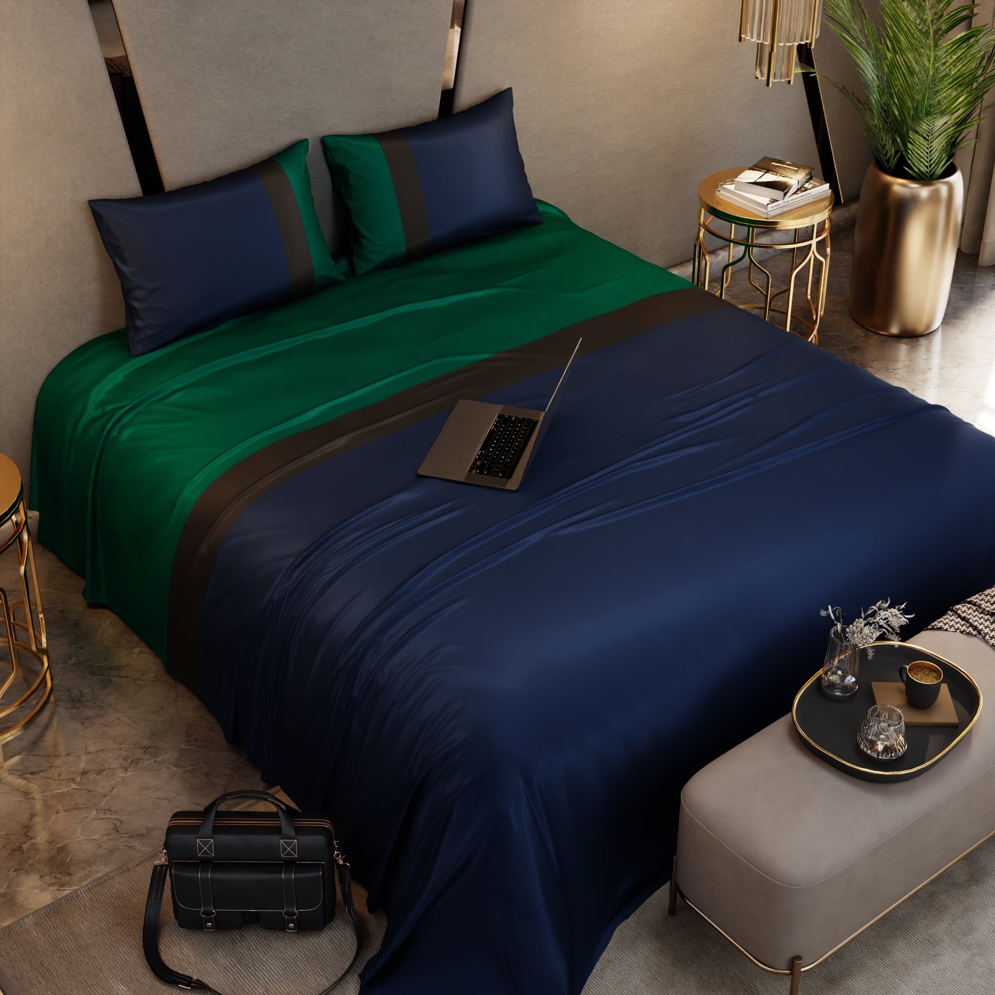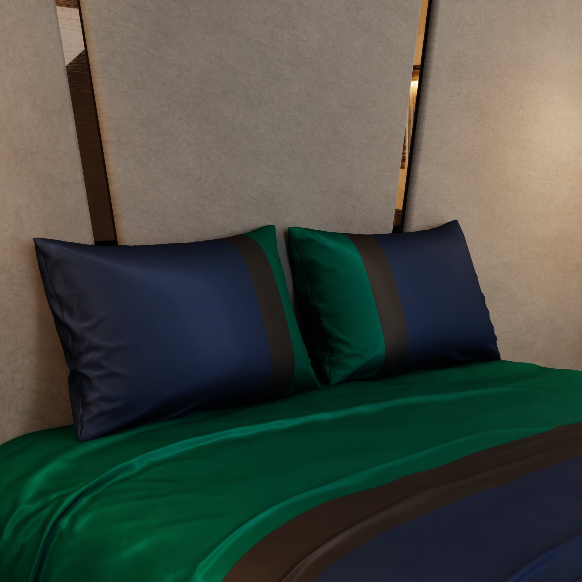 The 'Eiffel Edge' bedding captures the modern spirit of Paris with its crisp lines and contemporary colour block design. Merging the deep navy of the Parisian night with the lush greens of the Tuileries and the stark sophistication of architectural black, this collection is a tribute to the city's fusion of nature and urban elegance. Ideal for the avant-garde at heart, this bedding set brings an edge of Paris-inspired contemporary art and fashion right into your bedroom.