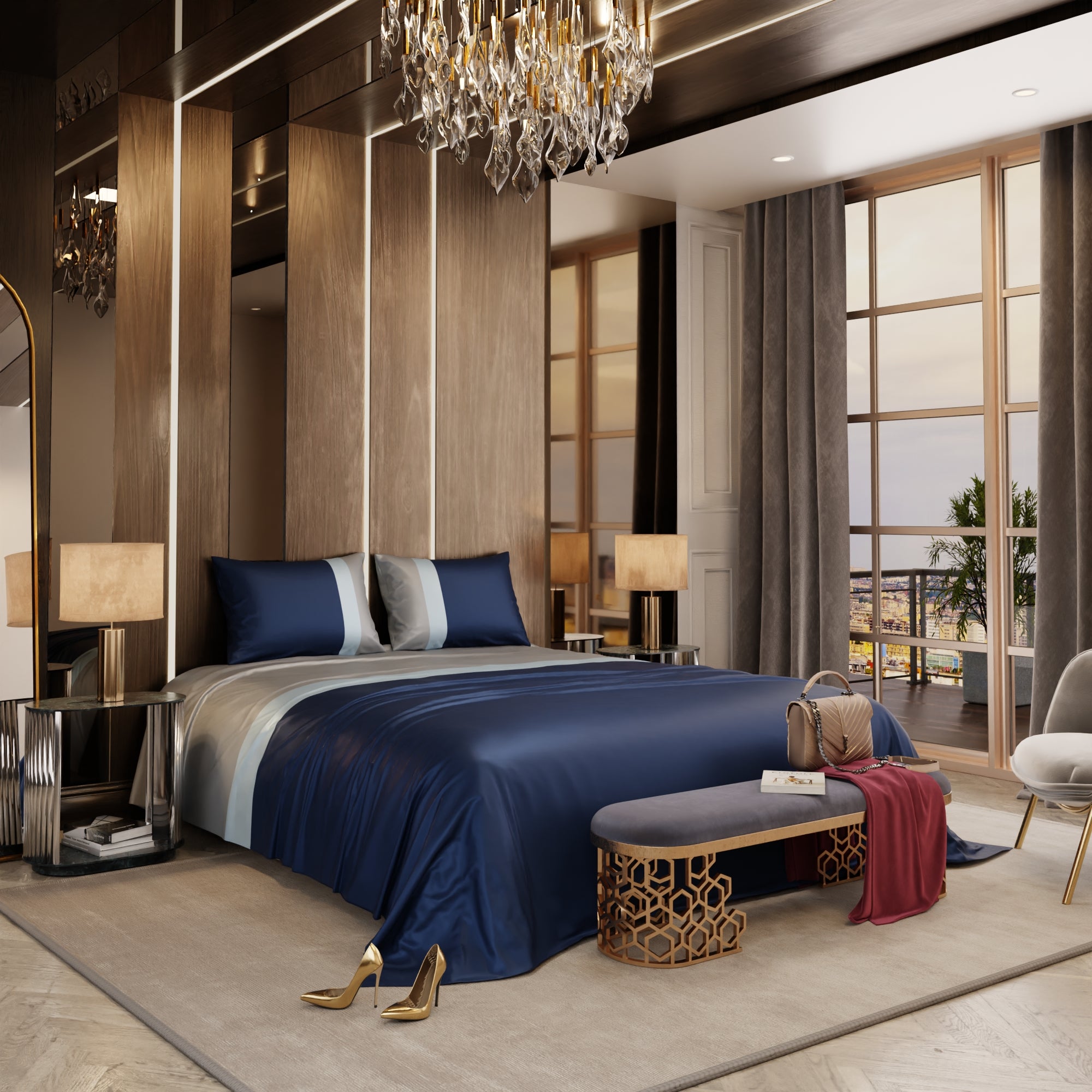 With the Stoa Paris Vogue Bedding Collection - Elegant Tri-Stripes, you're not just decorating your bedroom; you're creating a retreat where comfort and style come together. This delightful satin bedsheet, featuring a harmonious mix of harbour mist grey, dreamy blue, and mystique blue hues, infuses your sleeping space with coastal charm, creating a soothing and inviting atmosphere. Redefine your bedroom decor with this elegant bedding collection where luxury and relaxation come together.