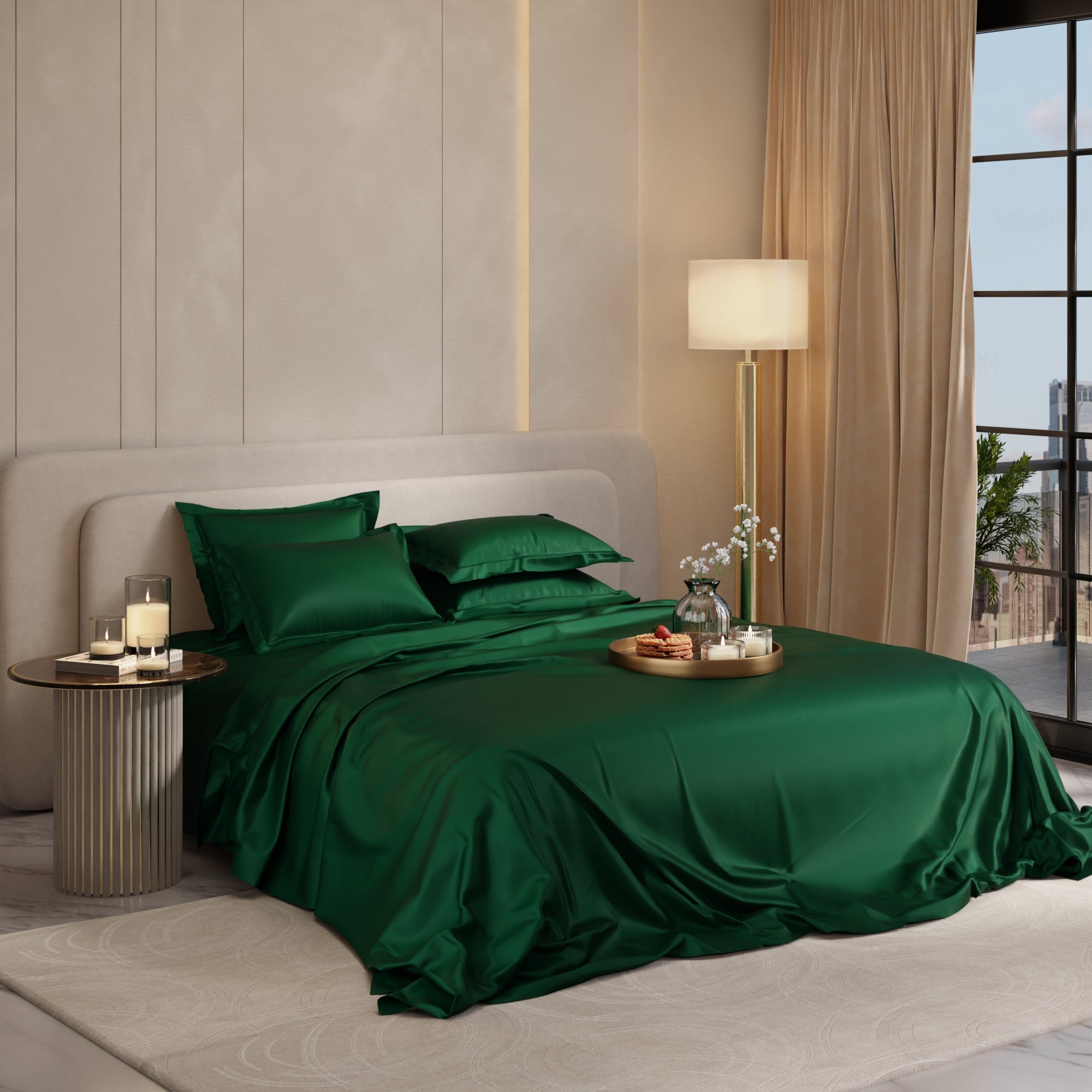 The deeply captivating hue of Emerald Green creates an allure reminiscent of the lushness of nature. These silky smooth satin linen bed sets are designed to add a touch of opulence and romance to your intimate moments.