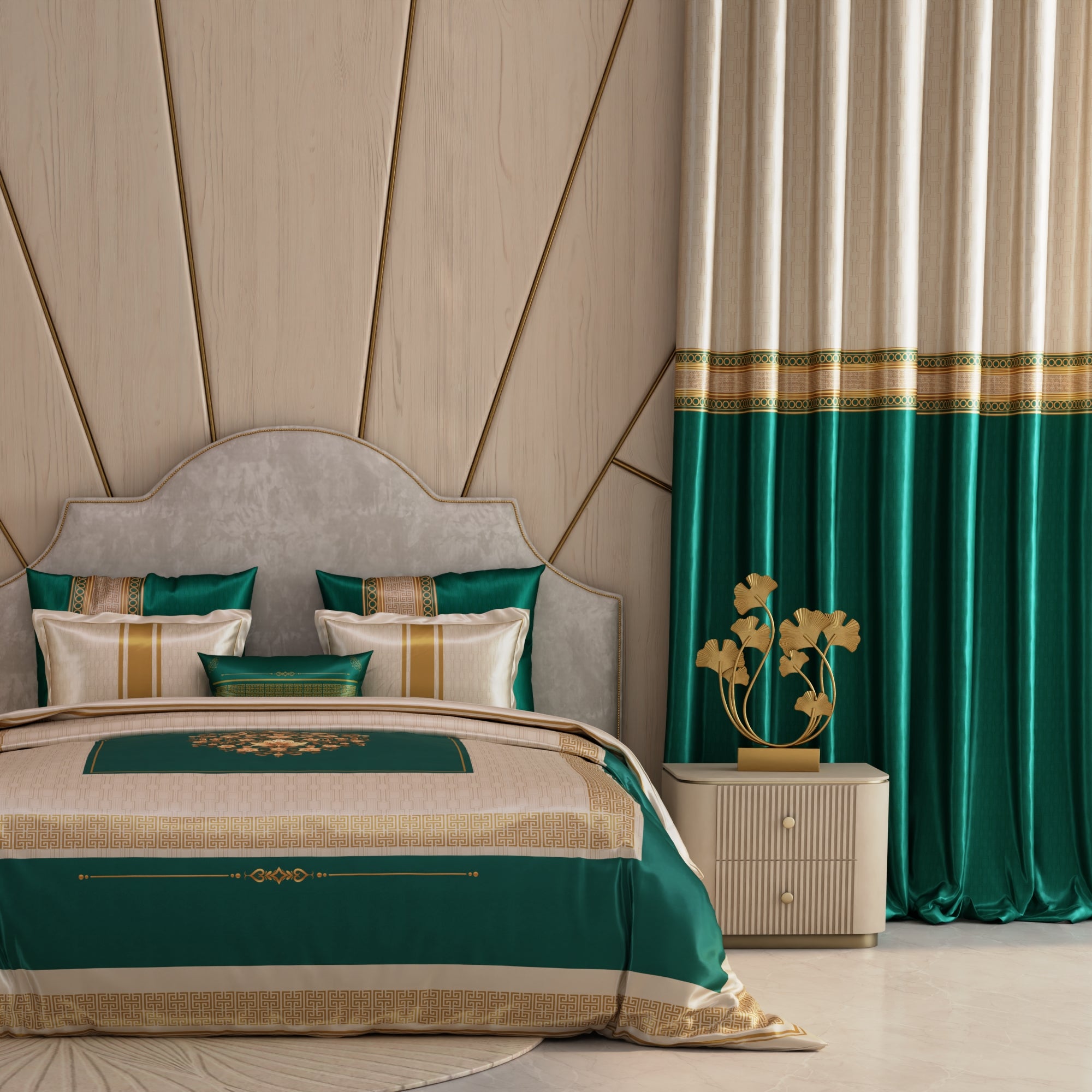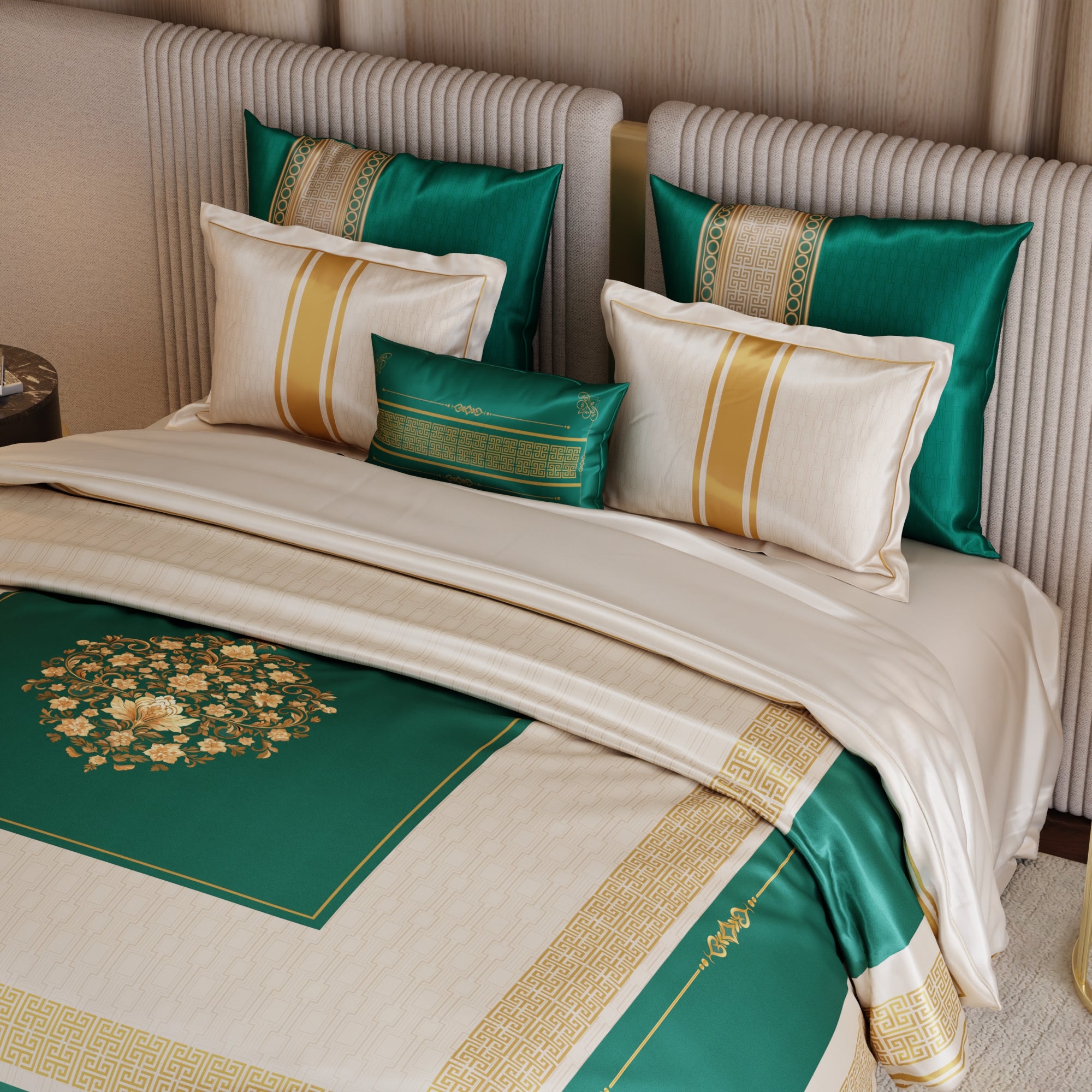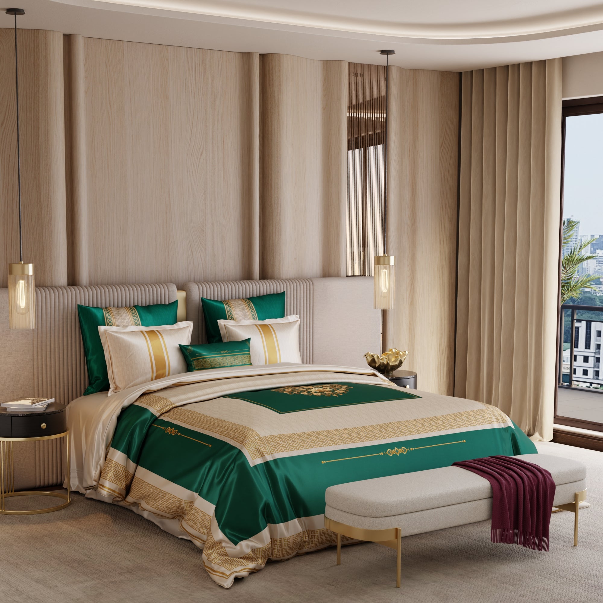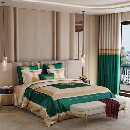 Green like a grove at dusk, ivory like moonlight, and gold like memory—The Emerald's Grace ensemble brings the outside in, but elevated for ceremony. The design feels rooted and romantic, like something meant for a new beginning or a moment of return. Laid out across the room in full coordination, it creates a rhythm of calm and richness, the way a raga sets the tone for an evening. Whether for vows, homecomings, or the quiet unfolding of ritual, this is a room that speaks in softness—and holds presence like a prayer.