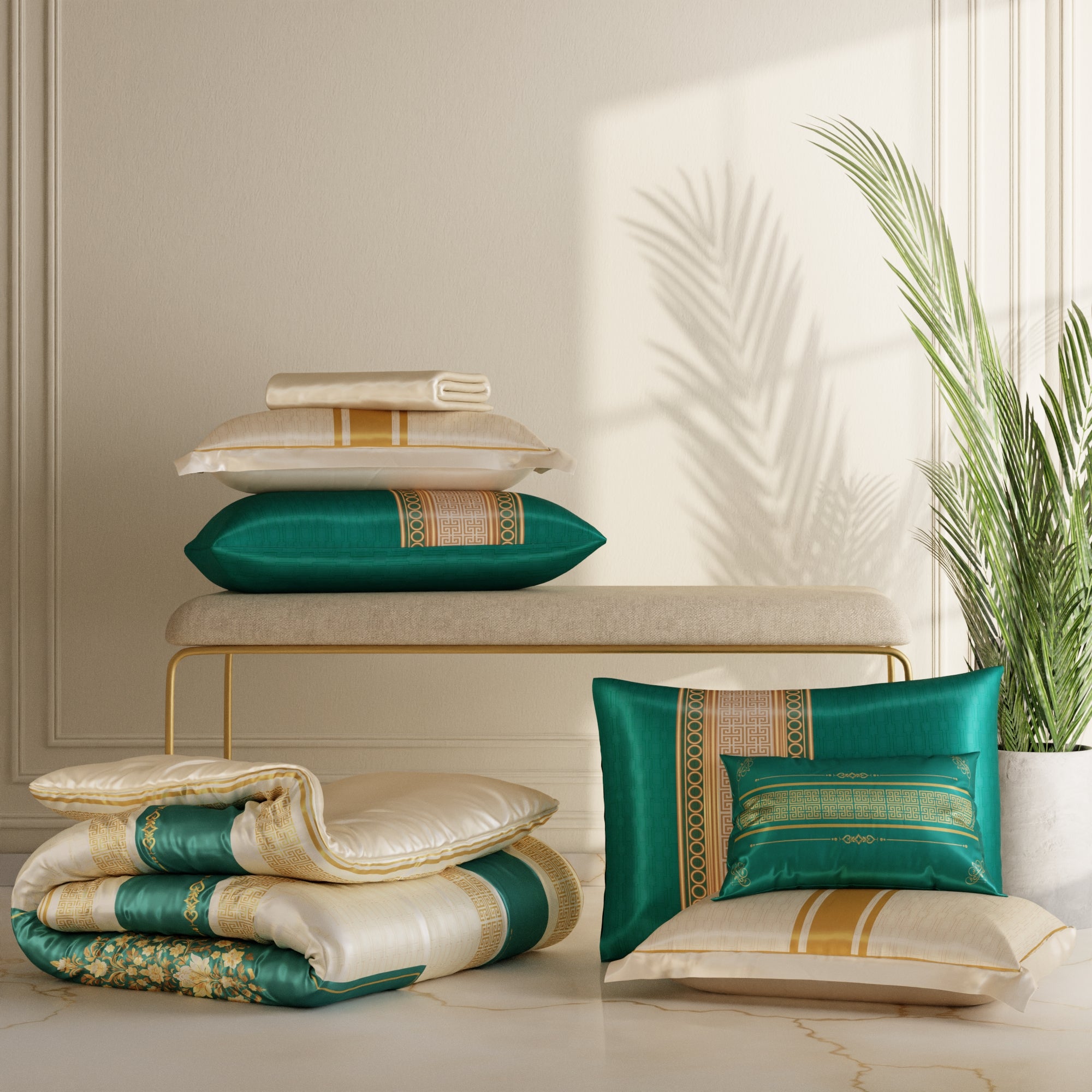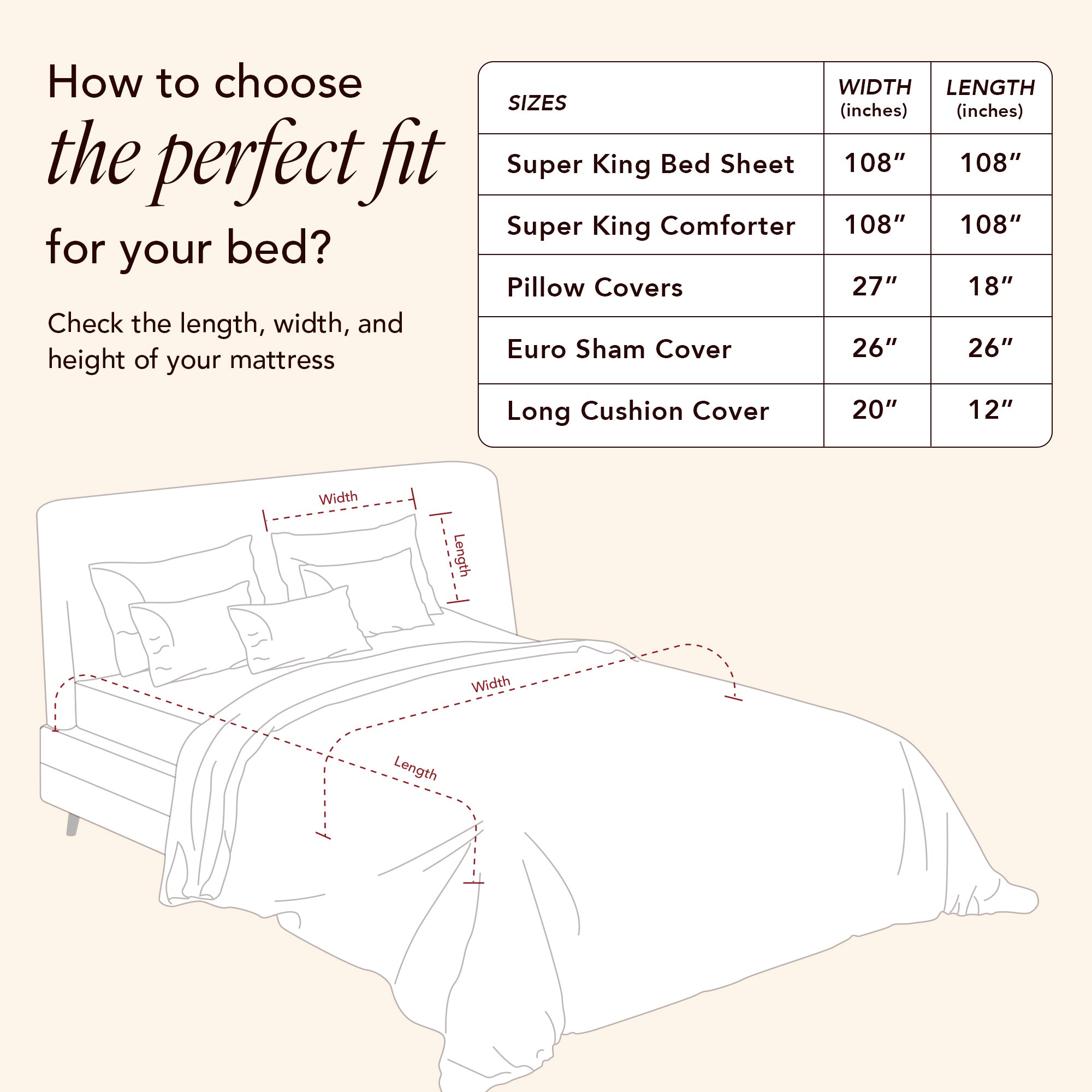 - Super King 7 Piece Bed In A Bag Set includes: 1 Bedsheet (108" x 108") + 1 Comforter (108" x 108") + 2 Pillow Covers (18" x 27")+ 2 Euro Shams (25" x 25")+1 Long Cushion (11" x 19")