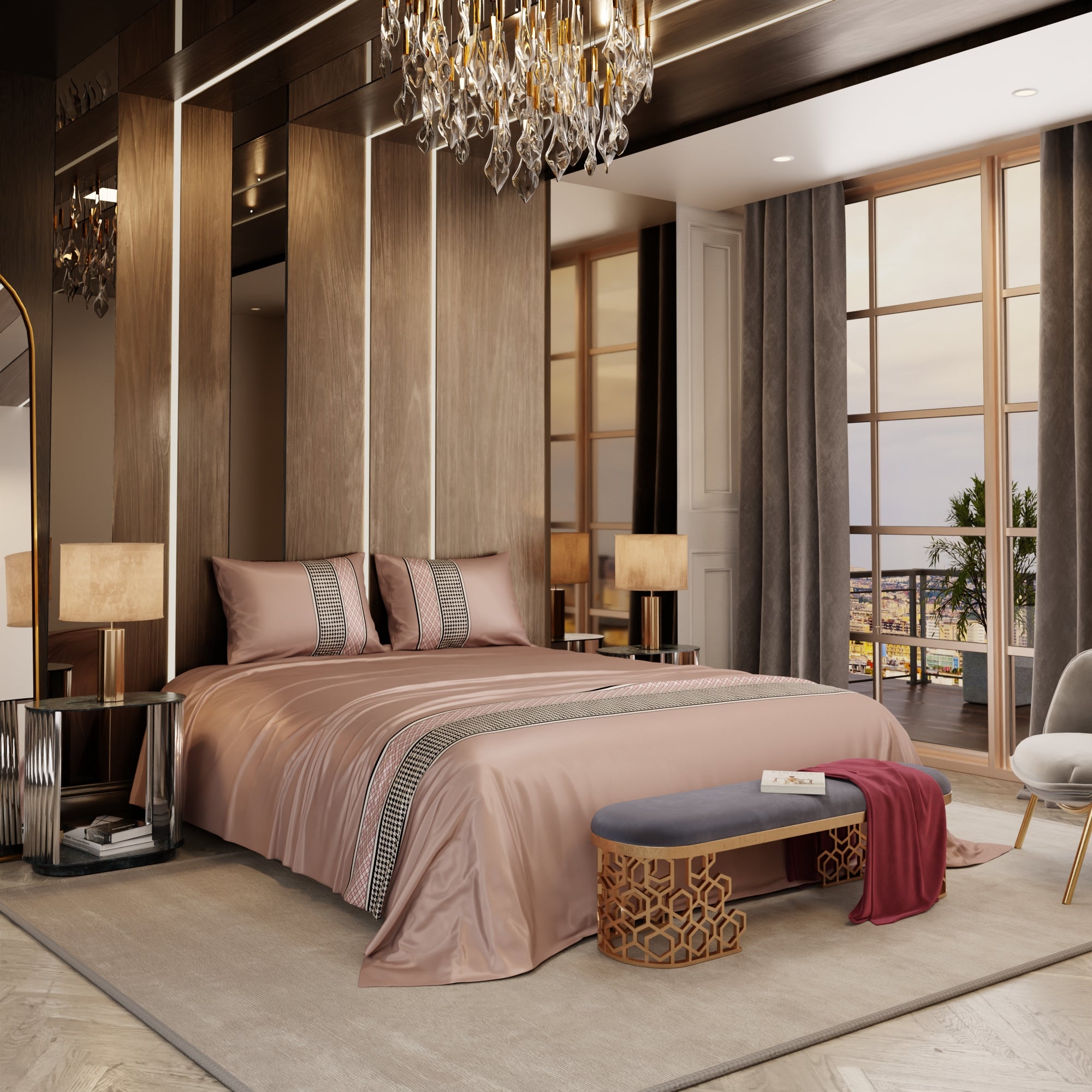 Dive into the pure elegance of our Estate of Kings satin bedsheet set. The champagne colour accentuates the satin's inherent sheen, creating a truly luxurious ambience. Inspired by the grandeur of the Palace of Versailles, this bedsheet boasts a regal printed panel design, transporting you to a world of sophistication and refinement, making it a must-have for those who appreciate the finer things in life.