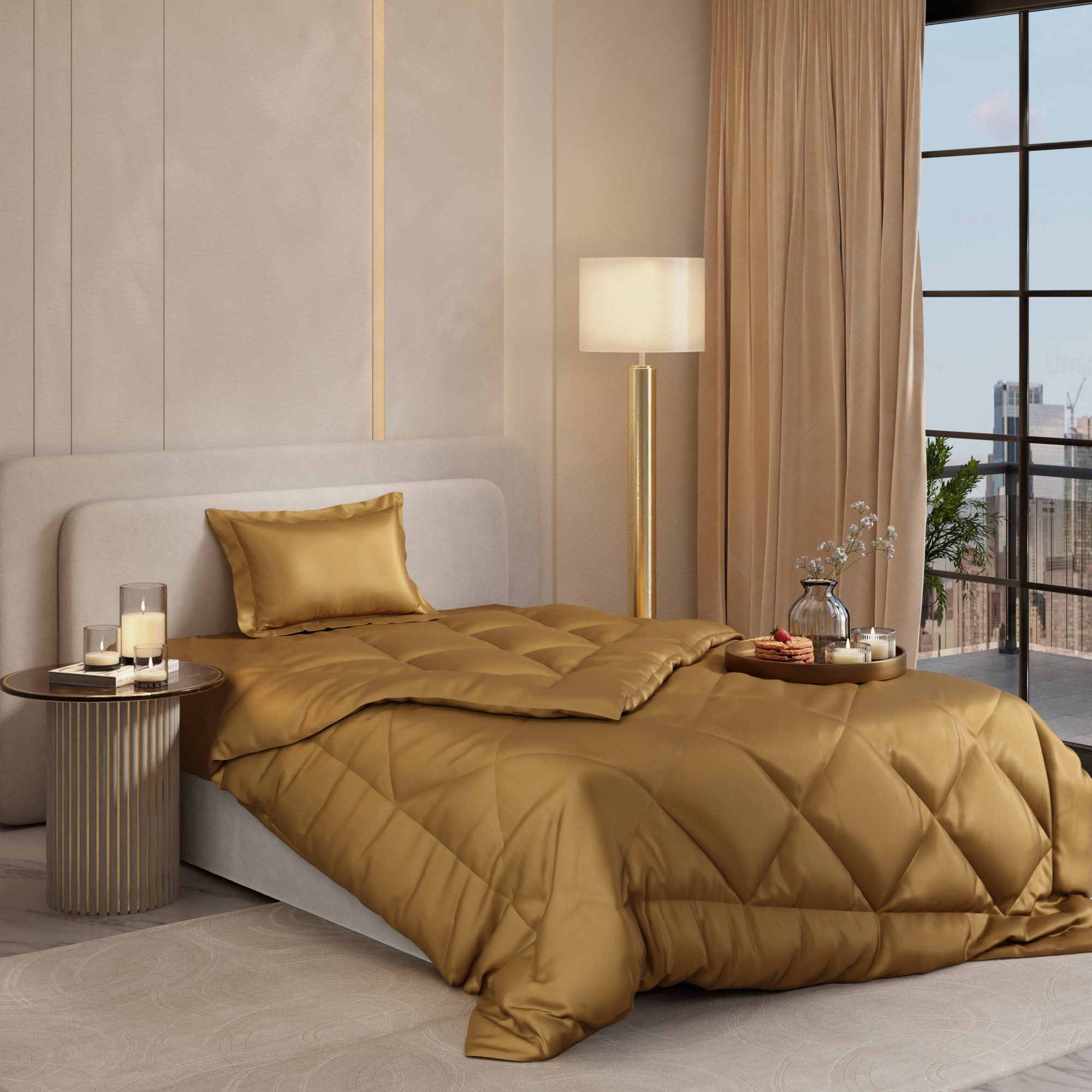 This 100% polyester UltraSatin Comforter can be machine-washed, tumbled dry, or ironed at low temperatures. Do not bleach. Do not dry in direct sunlight. Learn More