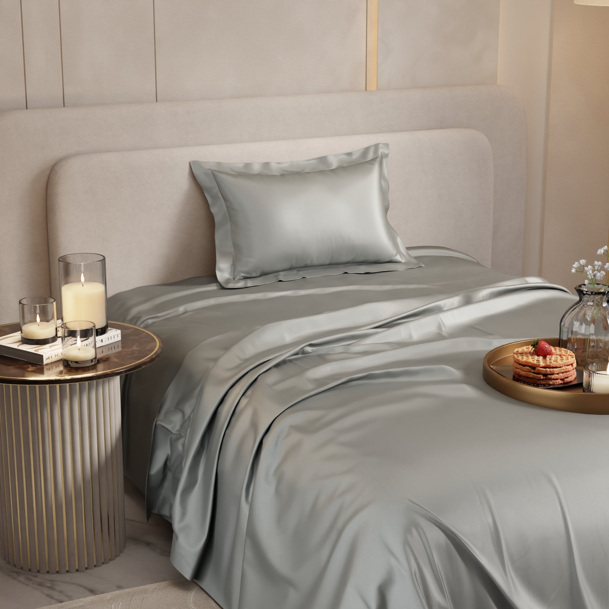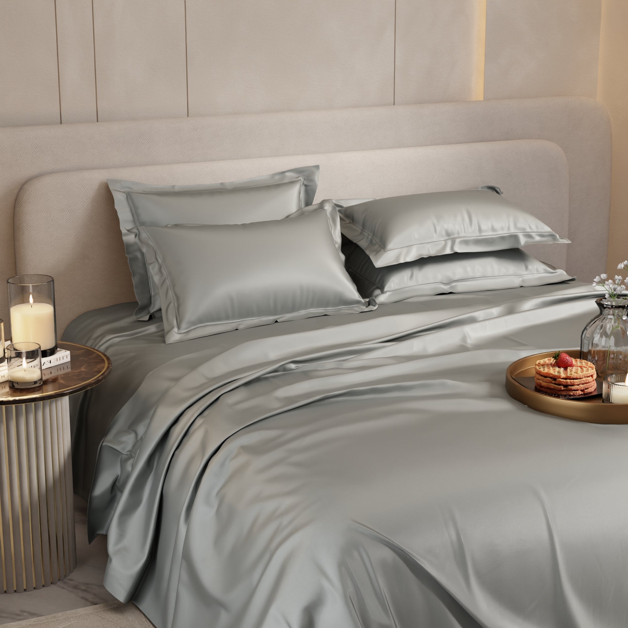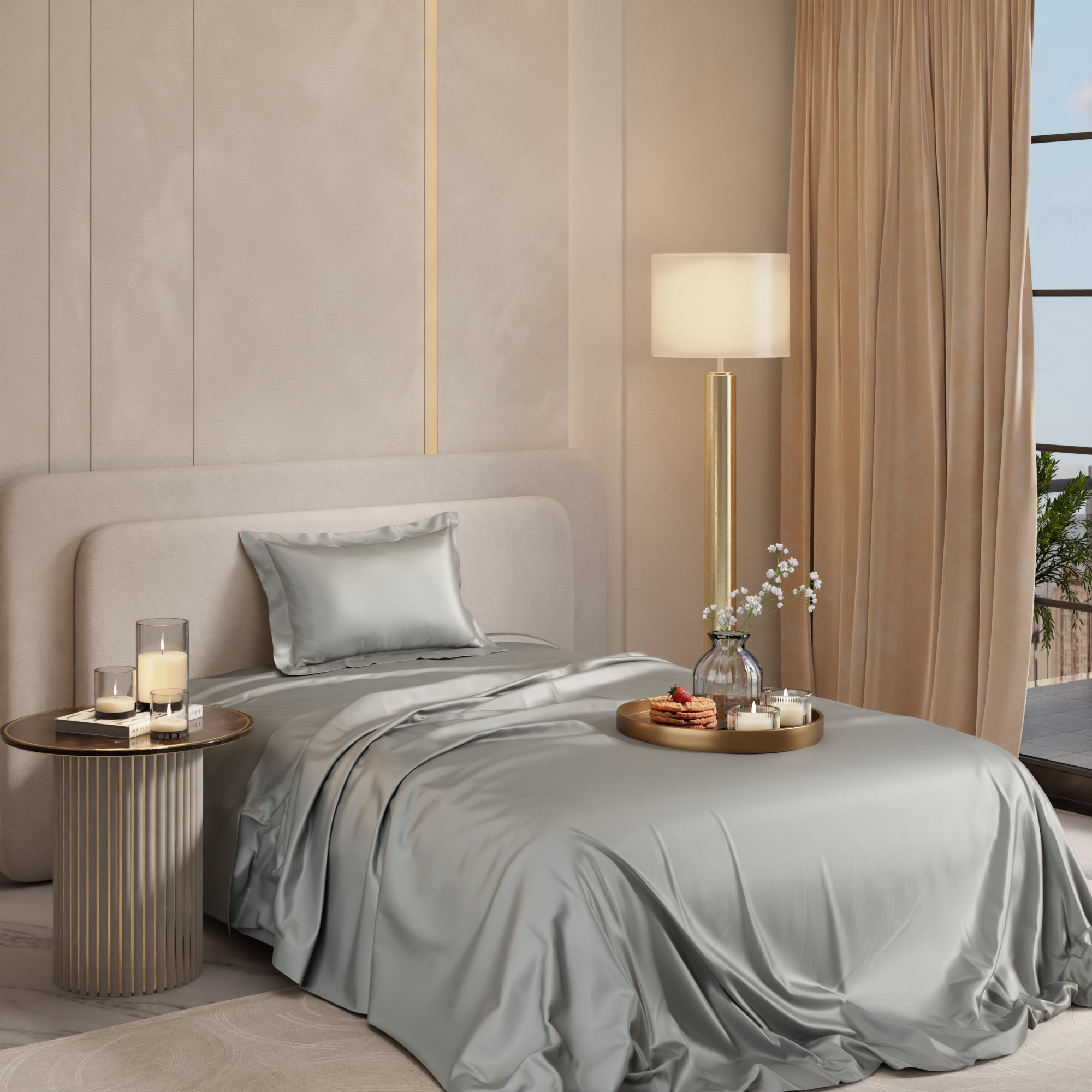 Invoke a soul soothing aura with the deep hue of Harbour Mist Grey. These silk-like satin linen bed sets are designed to add a touch of opulence and romance to your intimate moments.