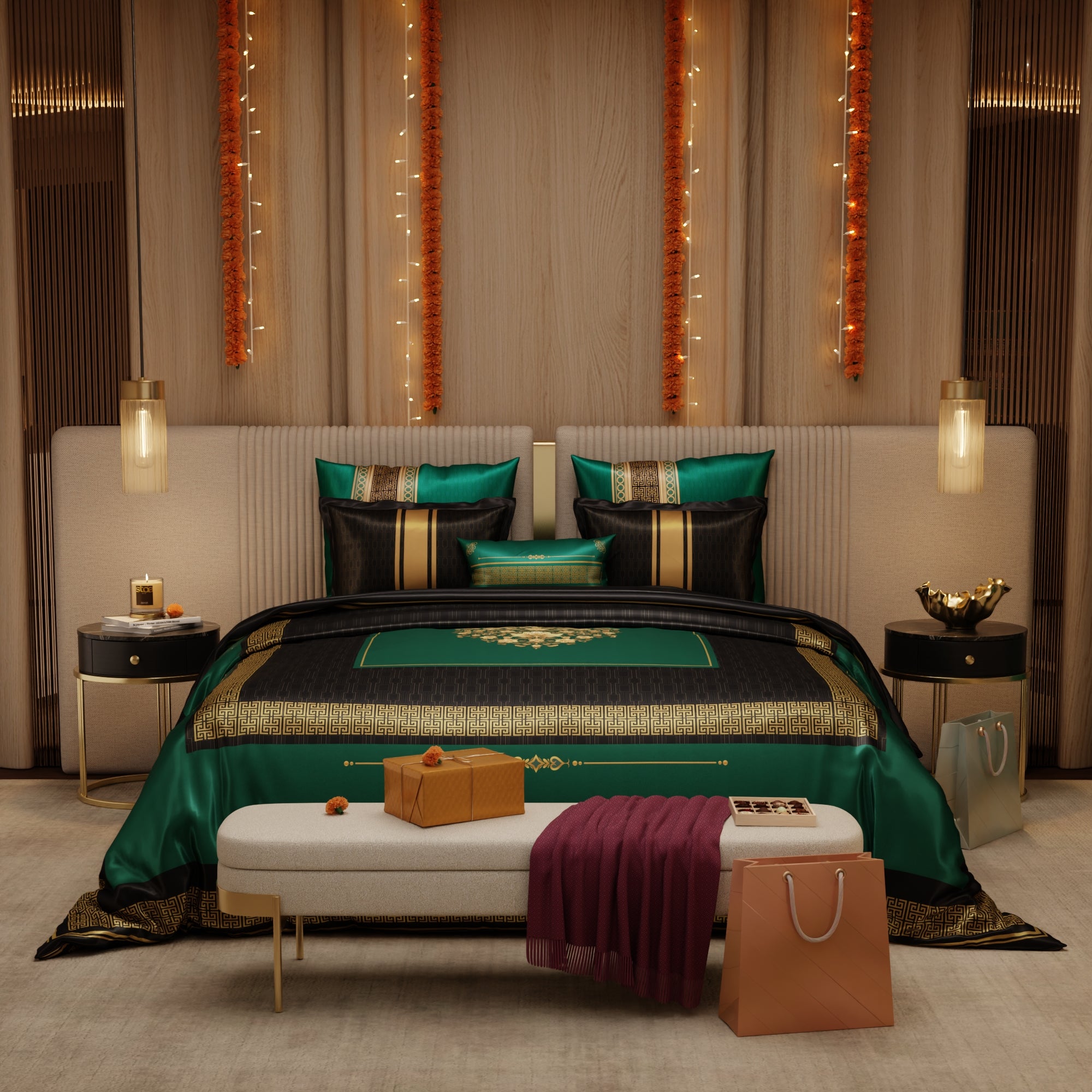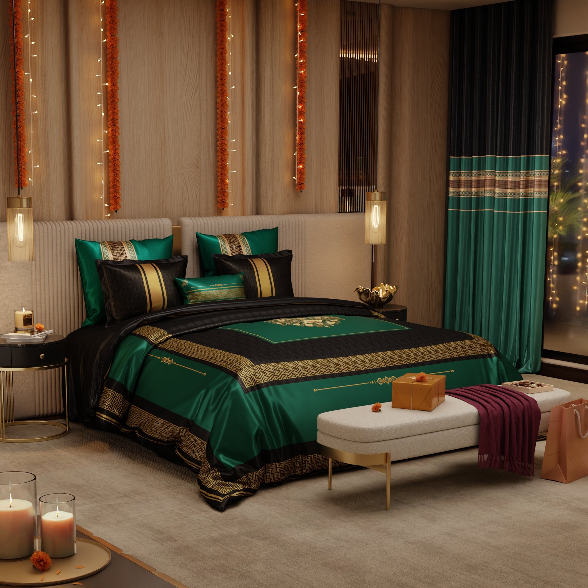 With its structured contrast and weight of colour, the Jade's Crown ensemble feels like it was made for rituals. Not just the ones you inherit, but the ones you create. The green steadies the space, the black deepens it, and the gold elevates each corner with quiet richness. This is where new beginnings are held, old traditions are revisited, and the act of spreading the ensemble becomes a prelude to something meaningful.