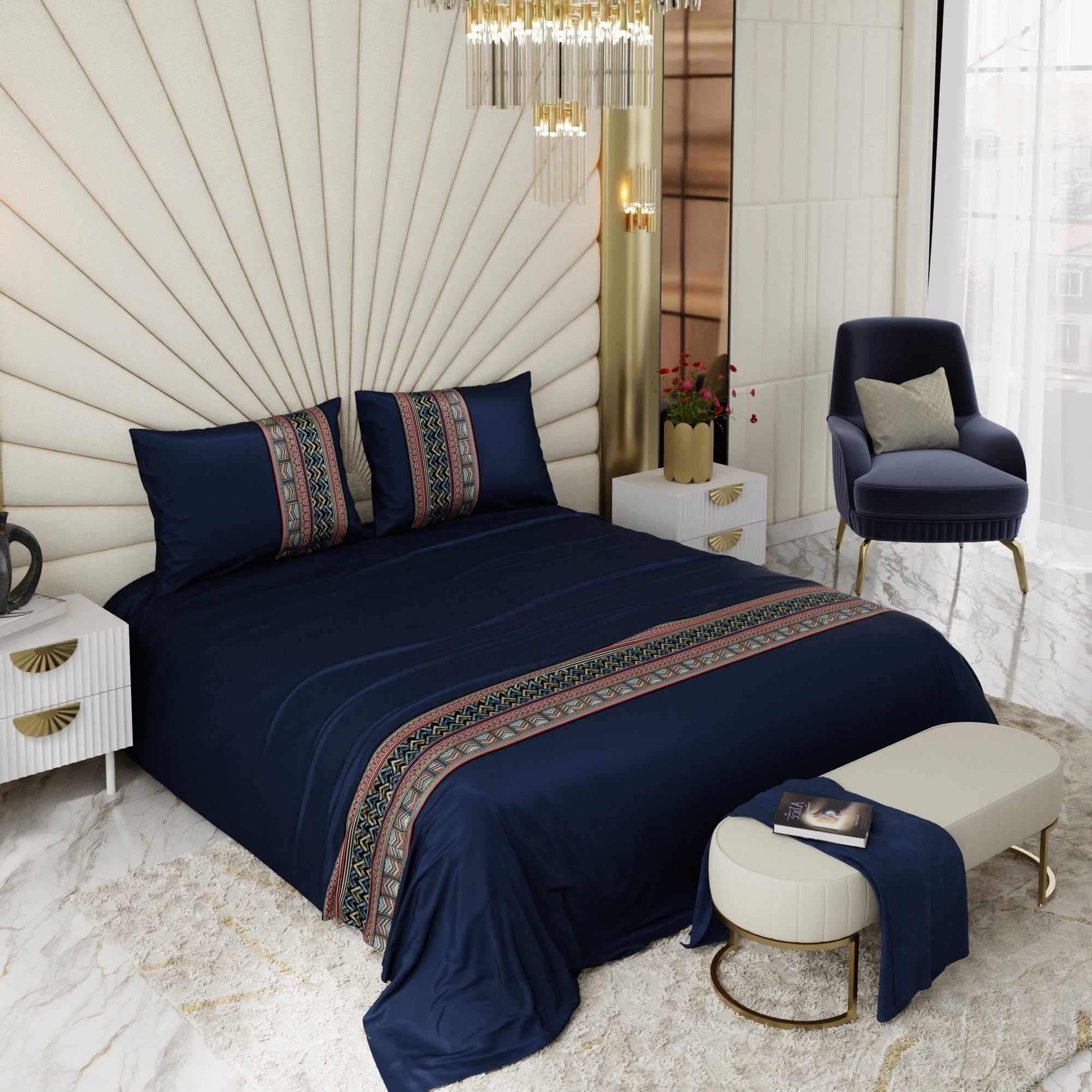 Experience the charm of our Regal Renaissance satin bedsheet set. With its deep and calming undertones, the soft mystic blue hue gracefully enriches the satin fabric's natural lustre and elevates your bedroom's ambience. Inspired by the grandeur of the Palace of Versailles, this bedsheet boasts a regal printed panel design, transporting you to a world of sophistication and refinement, making it a must-have for those who appreciate the finer things in life.