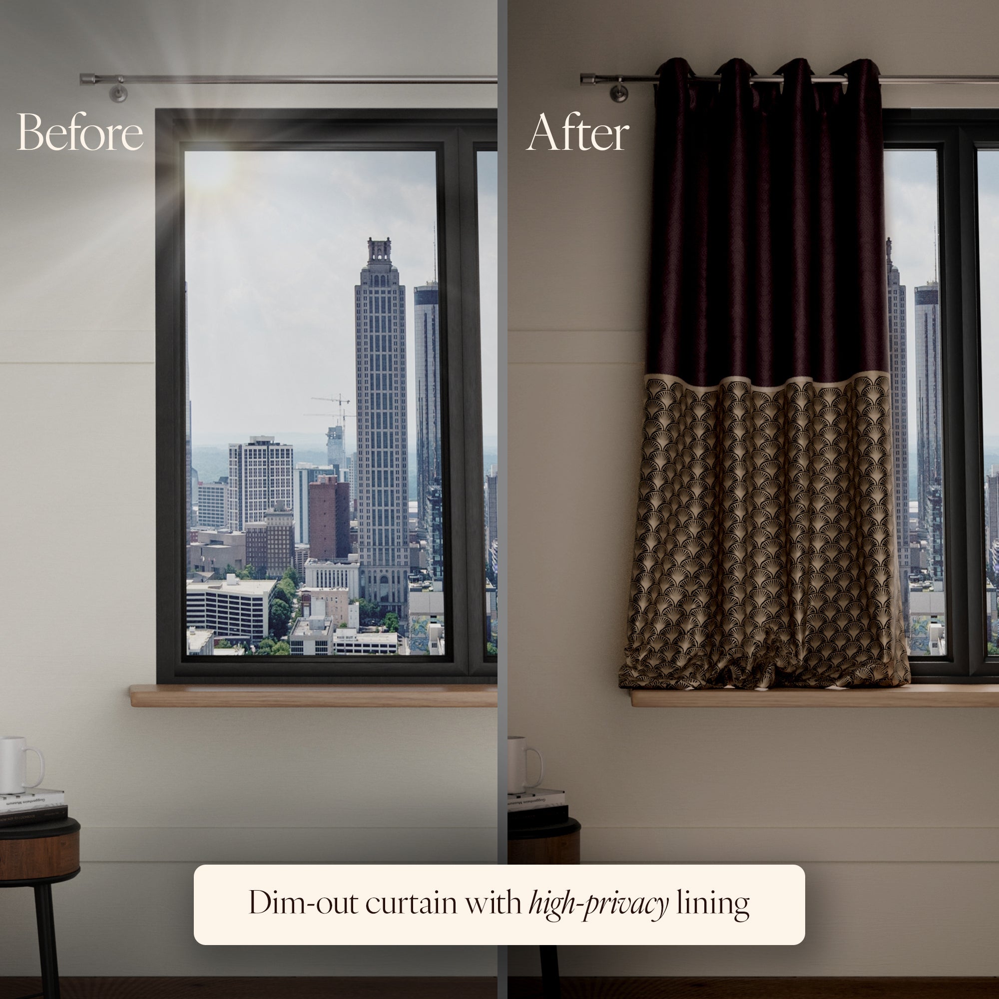 With a functional high-privacy lining, these dim-out curtains ensure privacy, block unwanted light, and deliver a seamless blend of bold style to your home.