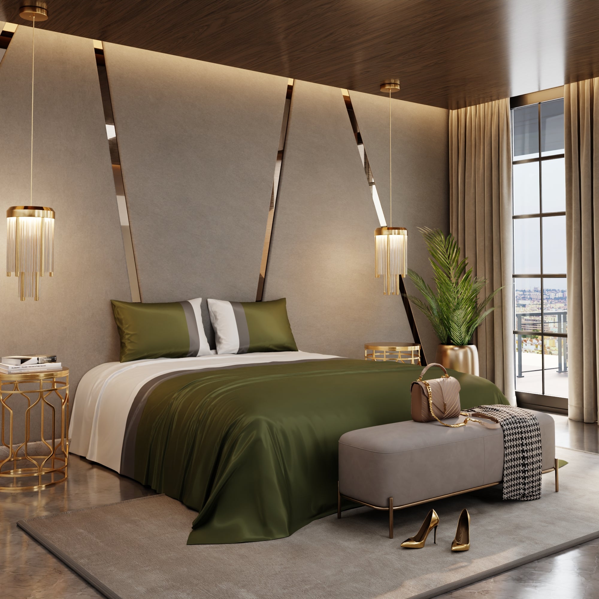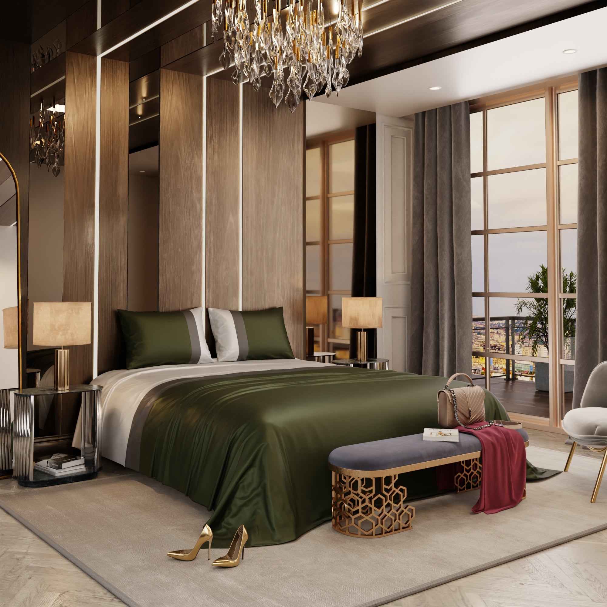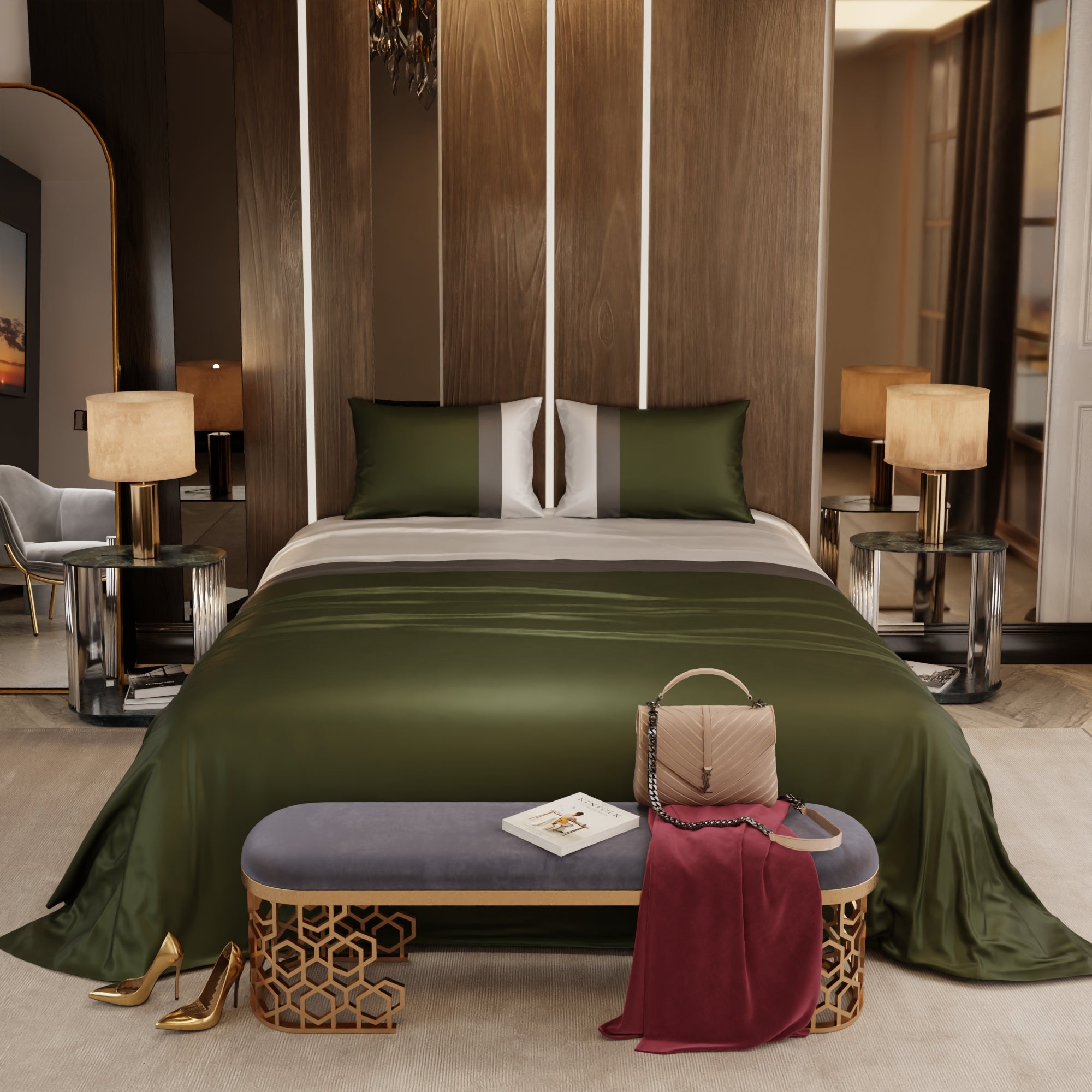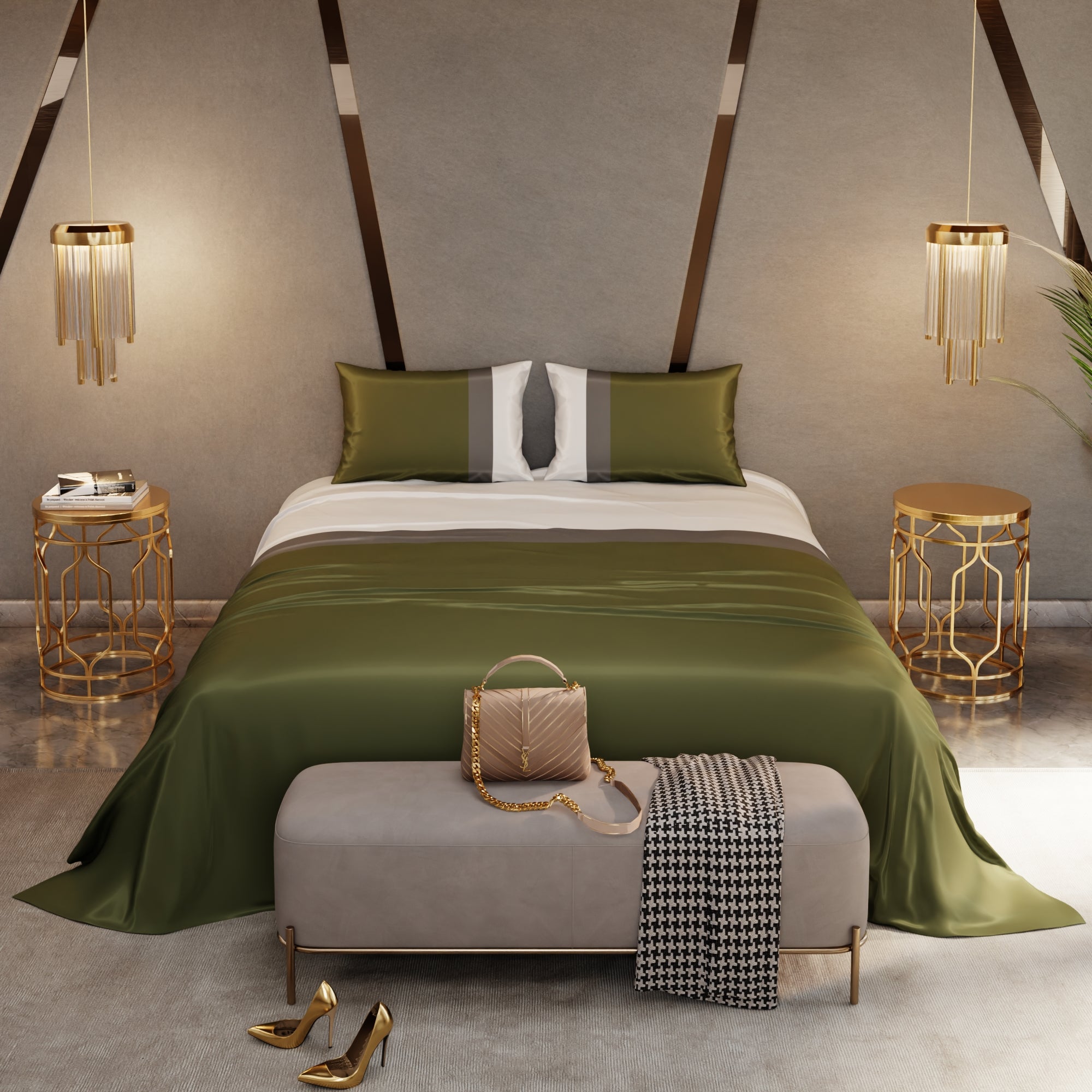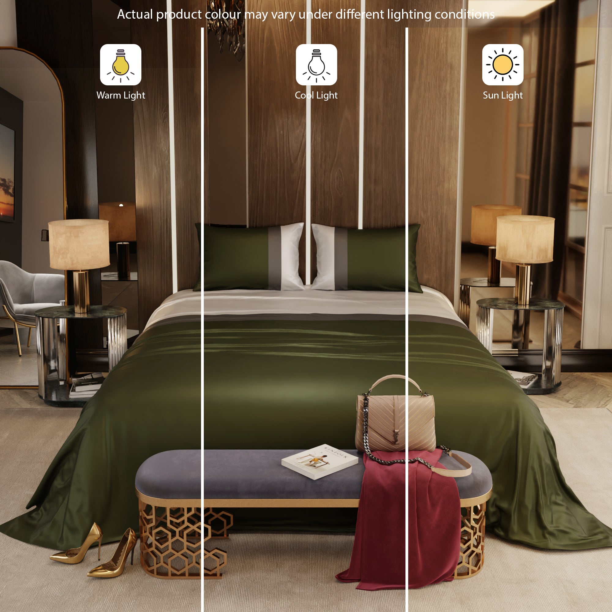 With the Stoa Paris Vogue Bedding Collection - Seine Side Stripes, you're not just decorating your bedroom; you're creating a retreat where comfort and style come together. This exquisite satin bedsheet, featuring a blend of white, dark grey, and olive green tones, envelops your sleeping space in an ambience reminiscent of the serene and grounding elements of the natural world. Redefine your bedroom decor with this elegant bedding collection where luxury and relaxation unite.