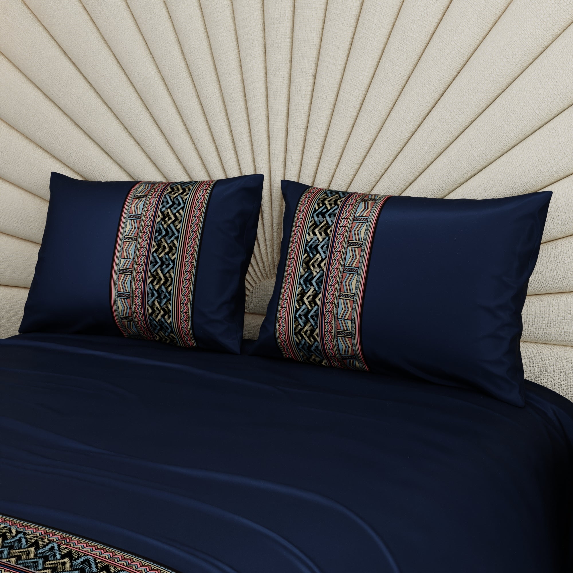 Experience the charm of our Regal Renaissance satin bedsheet set. With its deep and calming undertones, the soft mystic blue hue gracefully enriches the satin fabric's natural lustre and elevates your bedroom's ambience. Inspired by the grandeur of the Palace of Versailles, this bedsheet boasts a regal printed panel design, transporting you to a world of sophistication and refinement, making it a must-have for those who appreciate the finer things in life.