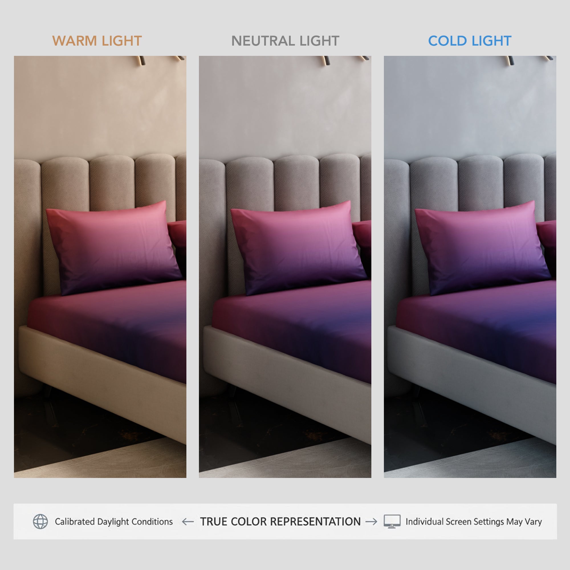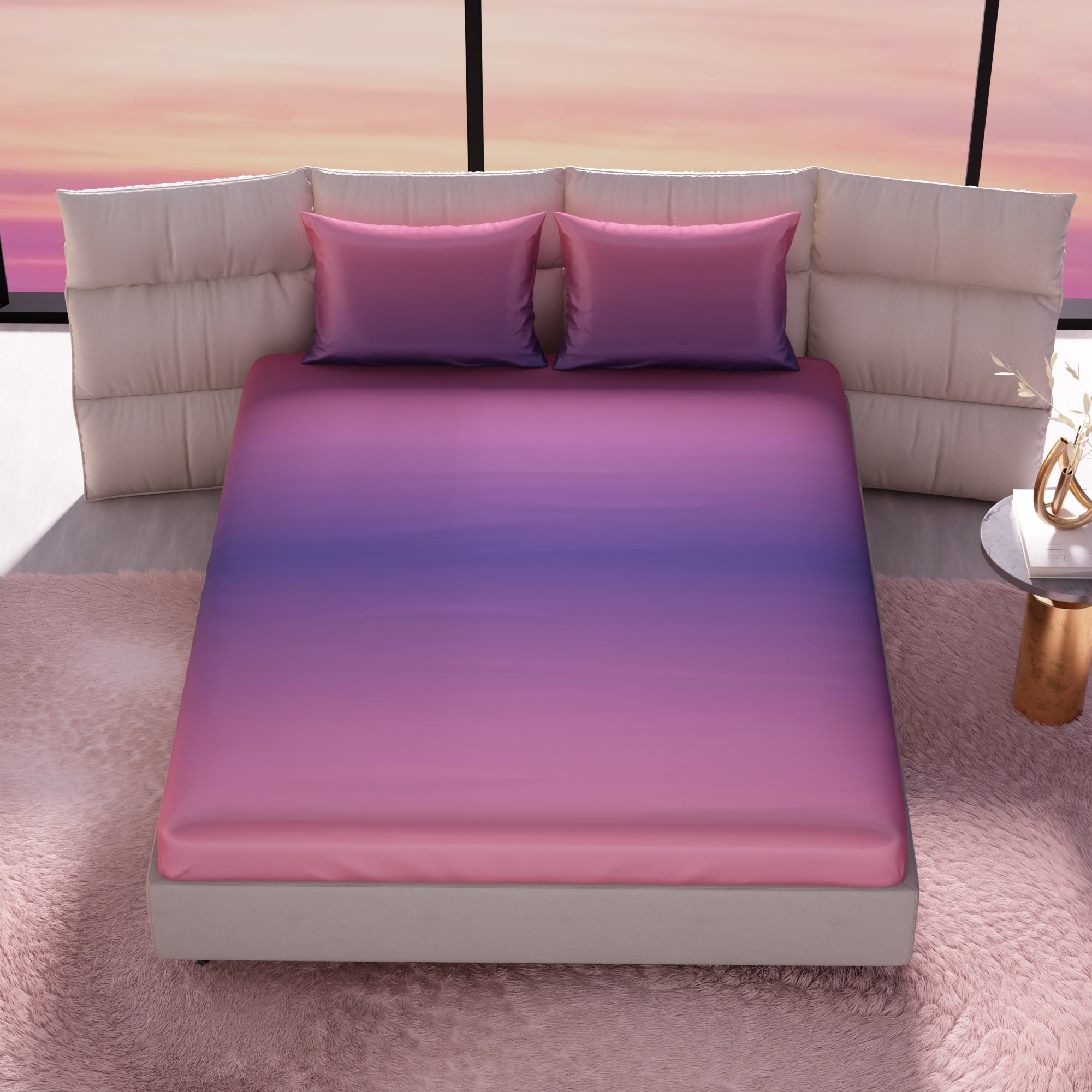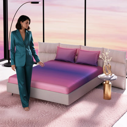 Drinks in hand, the sky putting on a show, and the feeling of a night that's just getting started—Sundowner Affair bedsheet set is made for the ones who never call it early. With a rich ombré that shifts from vibrant pinks to deep indigos, this ultrasatin bedding set turns your bedroom into a stylish afterparty. Because some nights are too good to end.