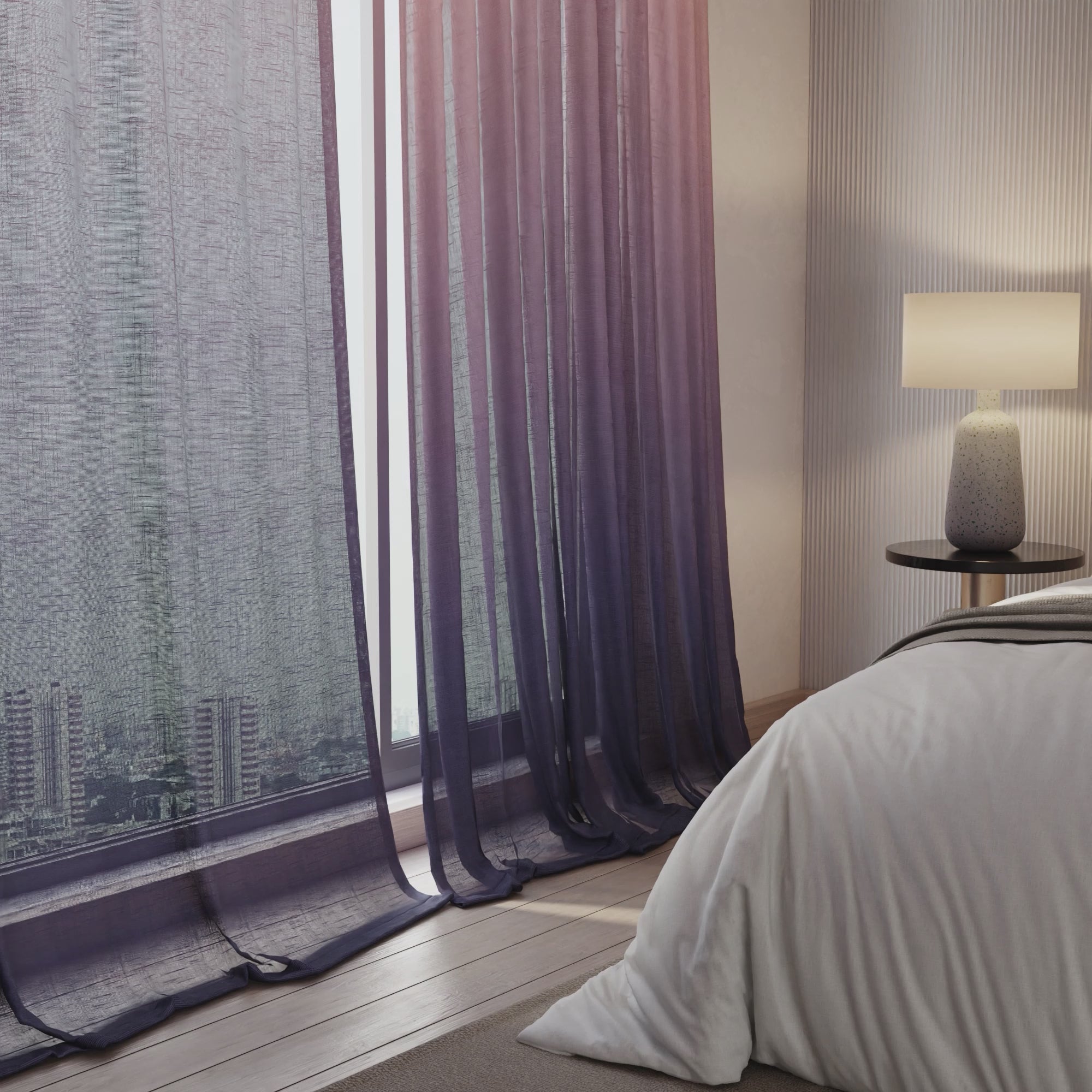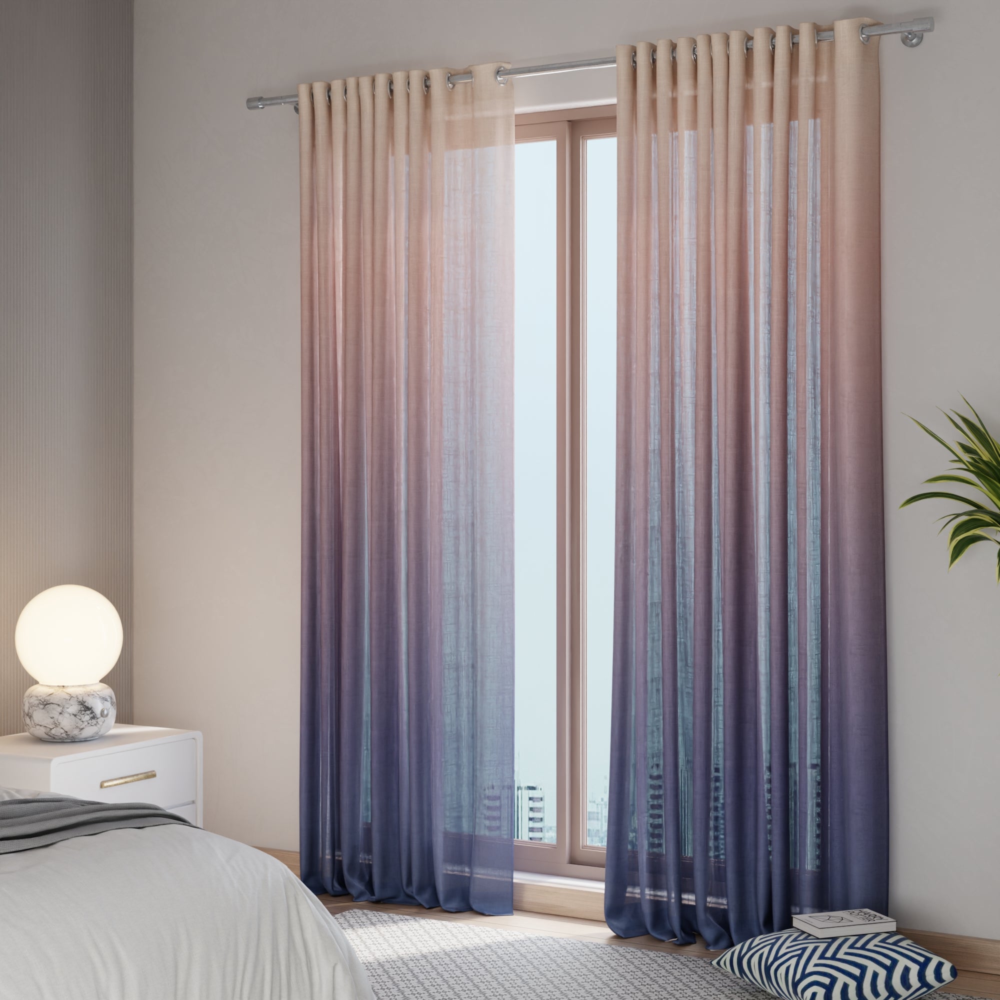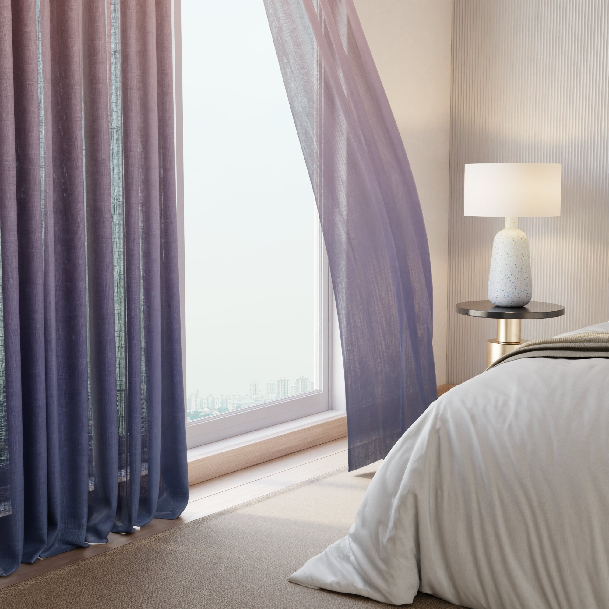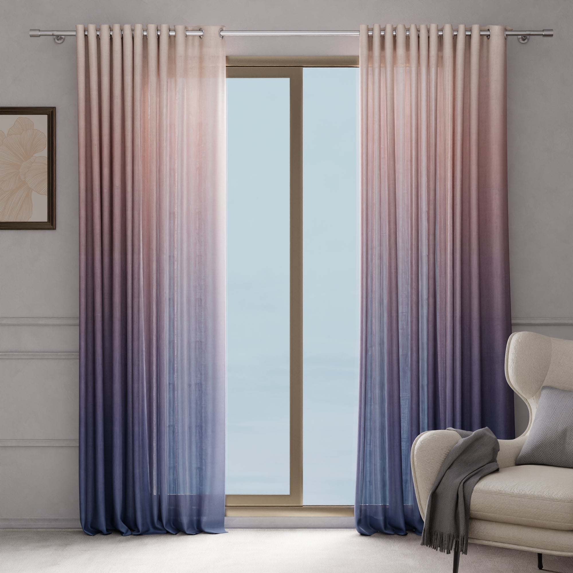 A refined interplay of dusky warmth and cooling twilight hues, Sunset Kiss brings a harmonious, fluid transition of colour — elevating layered curtain styling with a soft yet striking gradient that feels both modern and poetic.