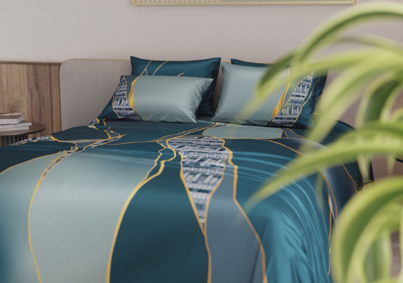 Teal and aqua tones create a cool foundation, traced with golden lines that weave like pathways of light. The geometry feels fluid, almost aquatic, balancing freshness with refinement. Teal Trace captures the quiet luxury of fragments arranged with care — a harmony of cool depth and luminous warmth.
