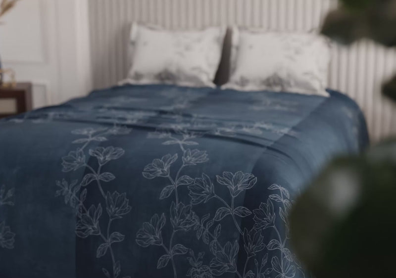 Truffle Canopy creates drama in hushed tones. A deep charcoal base carries subtle geometric textures, while pale florals rise like silhouettes against twilight. The design balances richness with restraint, giving the bed a sense of Parisian poise. Printed on 100% cotton, it pairs natural comfort with quiet grandeur, transforming the bedroom into a space of depth and distinction.