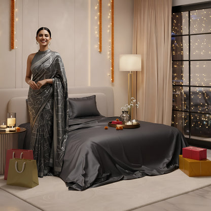 Uplift your room with an element of grace with the subtle grey tones of Twilight Embrace. These silky smooth satin linen bed sets are designed to add a touch of opulence and romance to your intimate moments.