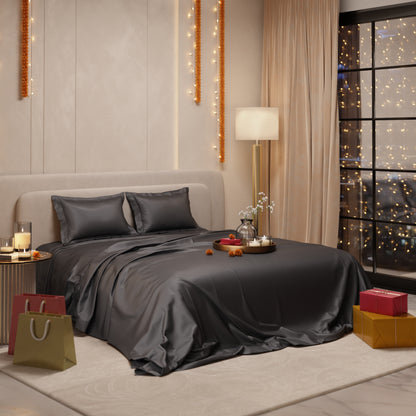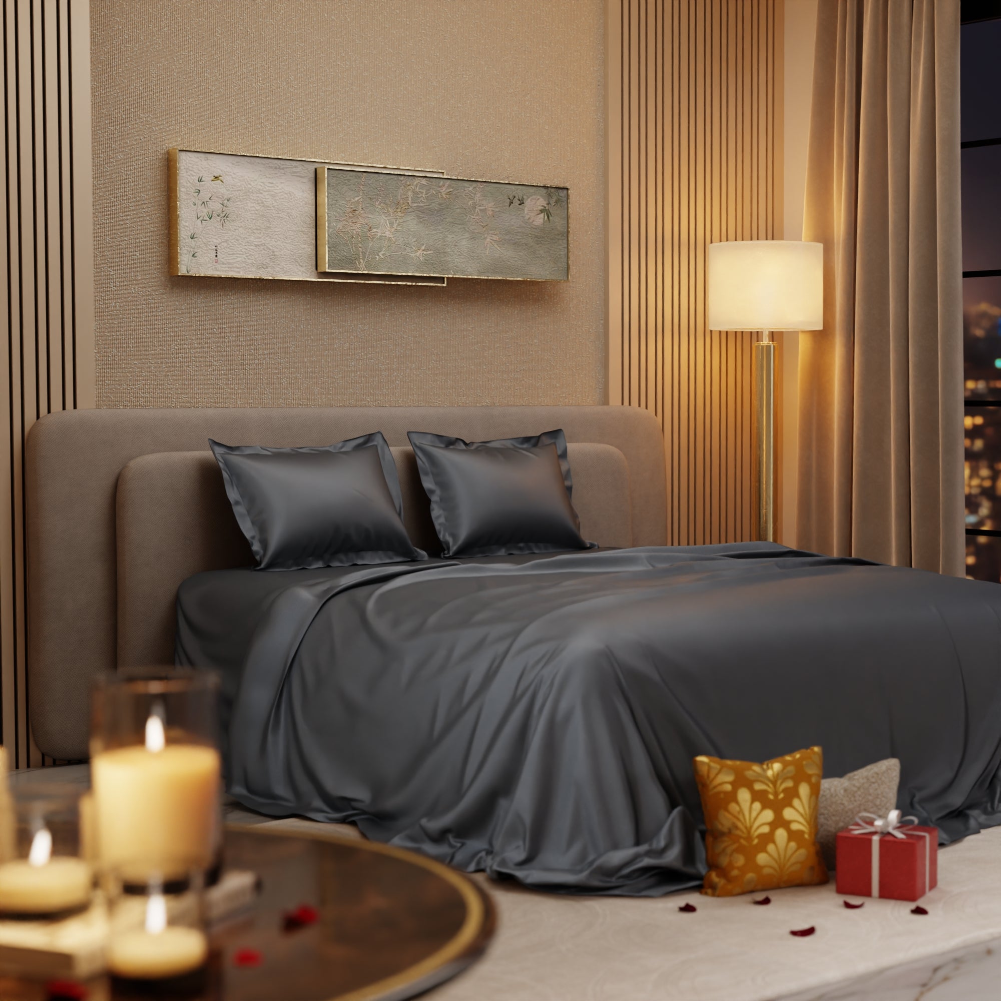Uplift your room with an element of grace with the subtle grey tones of Twilight Embrace. These silky smooth satin linen bed sets are designed to add a touch of opulence and romance to your intimate moments.