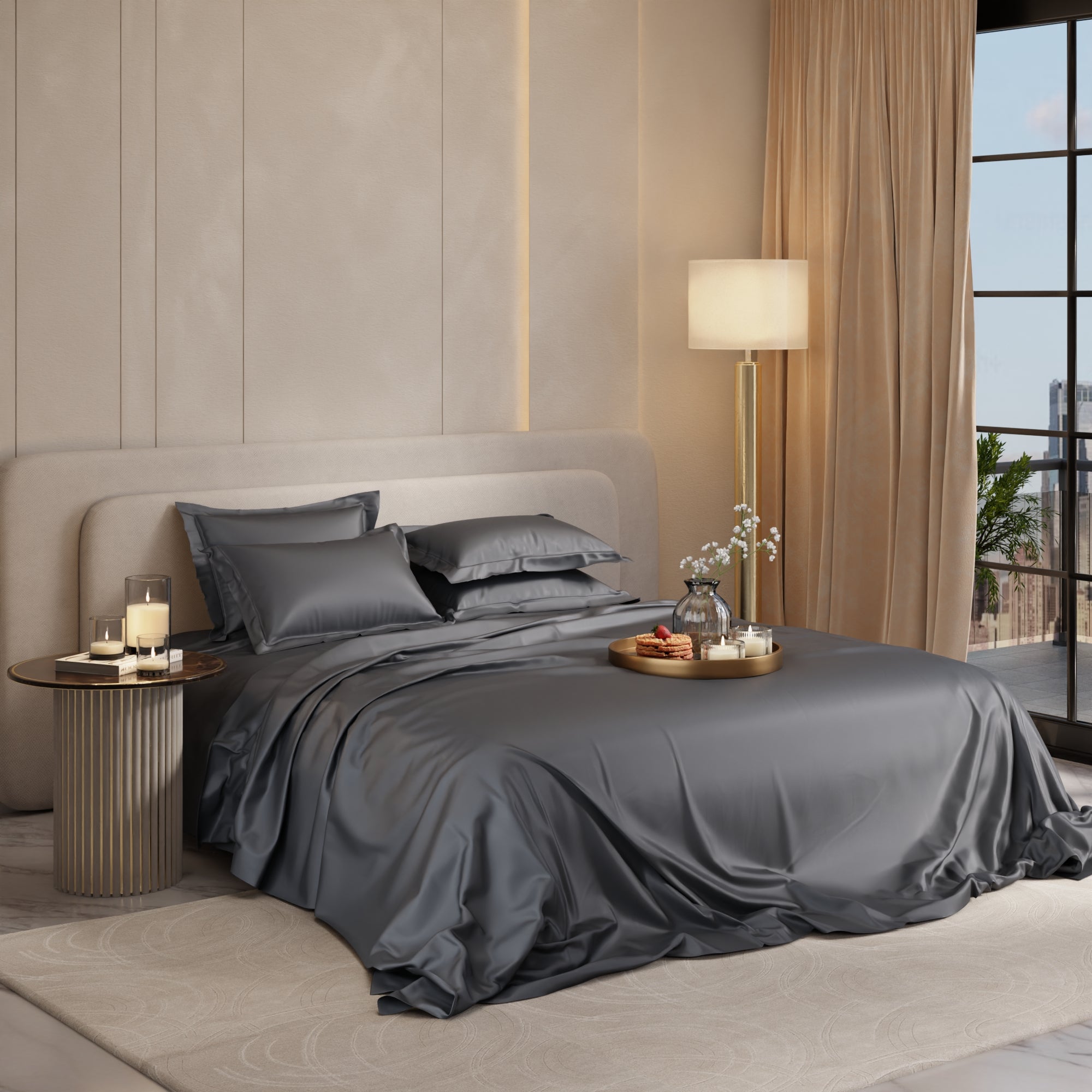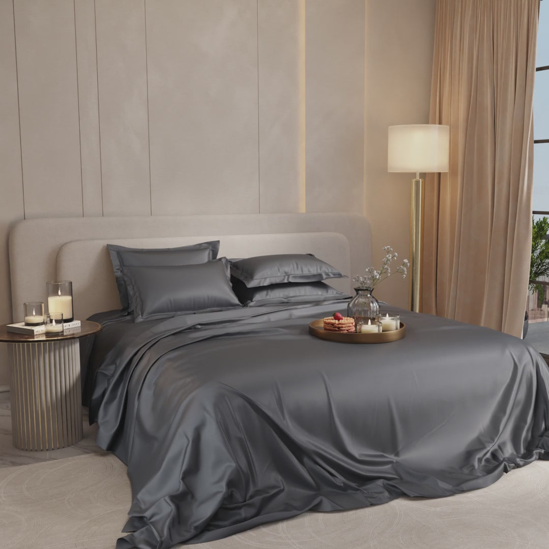 Uplift your room with an element of grace with the subtle grey tones of Twilight Embrace. These silky smooth satin linen bed sets are designed to add a touch of opulence and romance to your intimate moments.