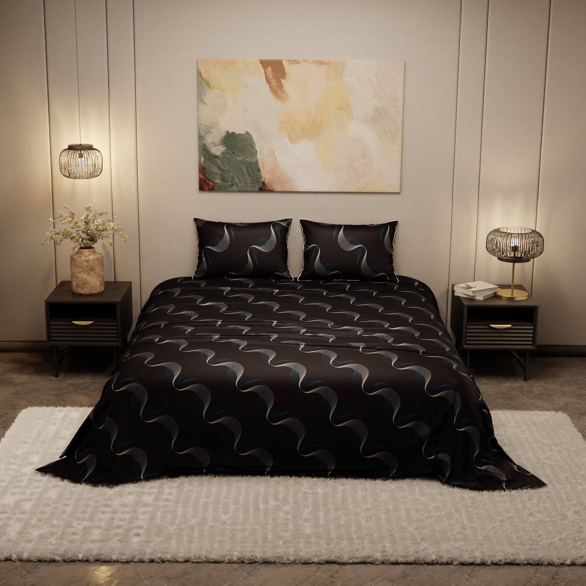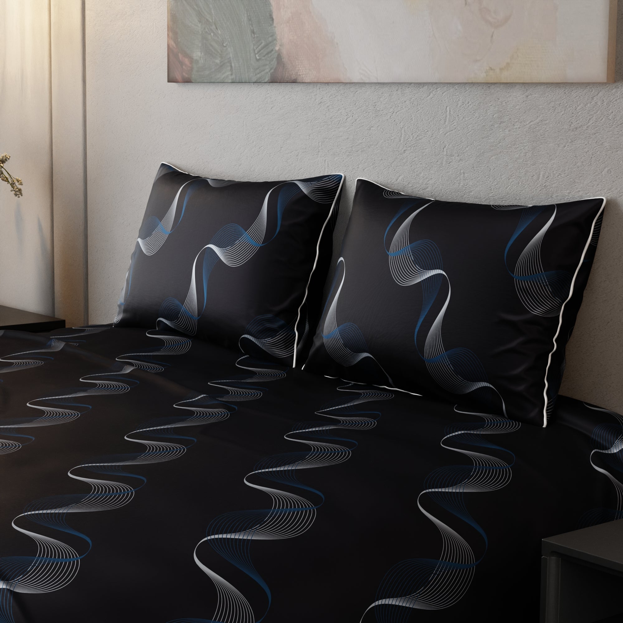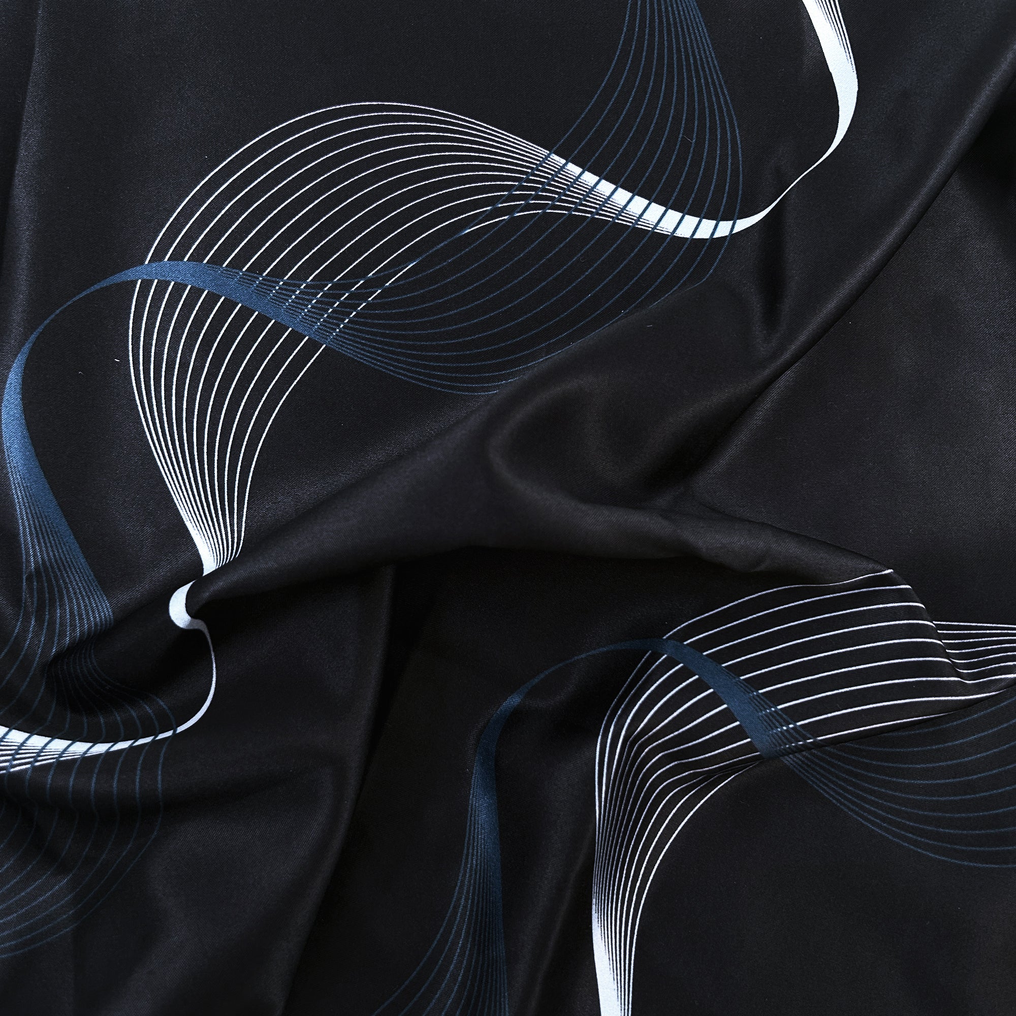 Dive into the enchanting depths of Twilight Rhapsody. This navy blue satin bed sheet showcases intricate blue and white wave patterns, creating an enchanting and serene atmosphere. The interweaving waves add an artistic dimension, turning your bed into a canvas of relaxation.