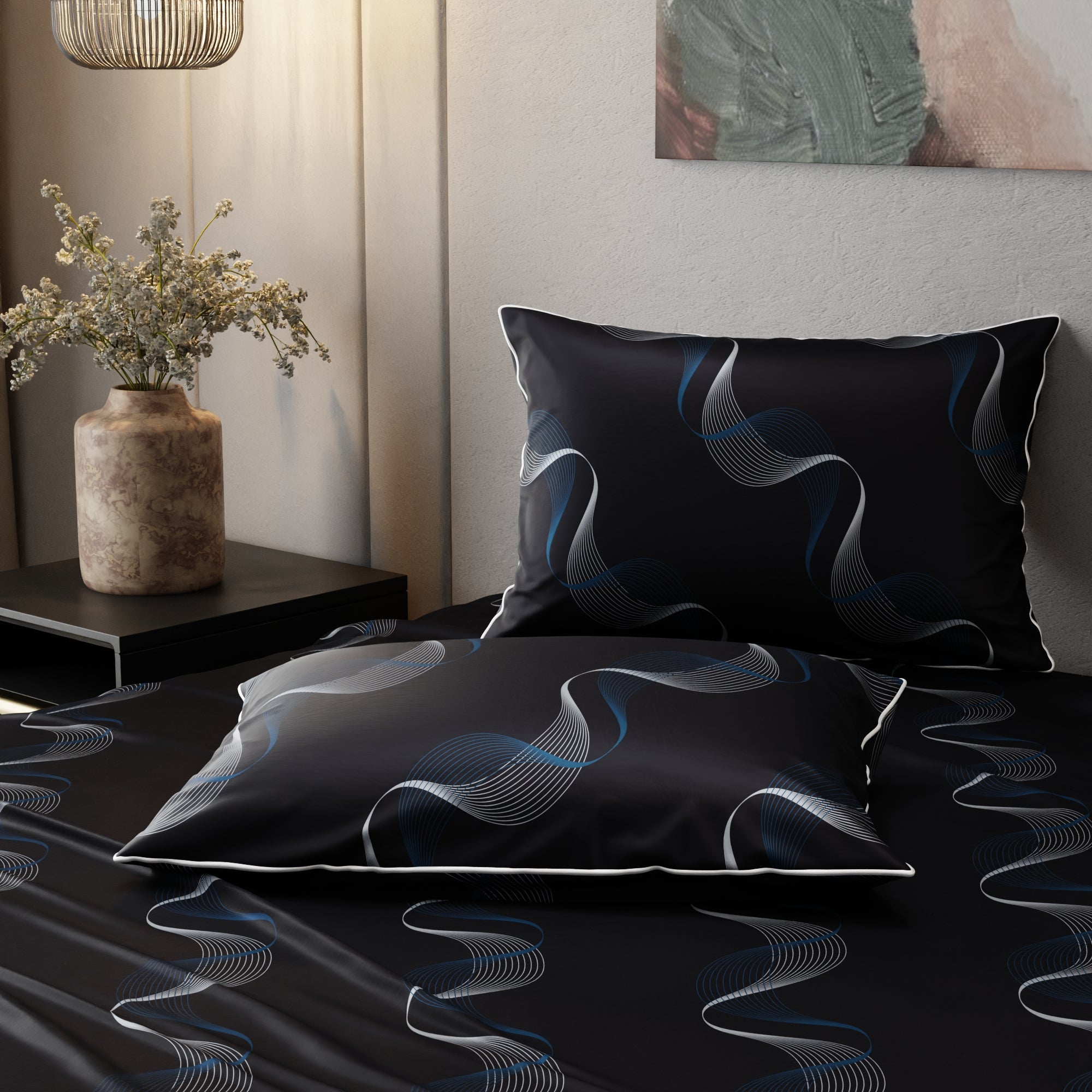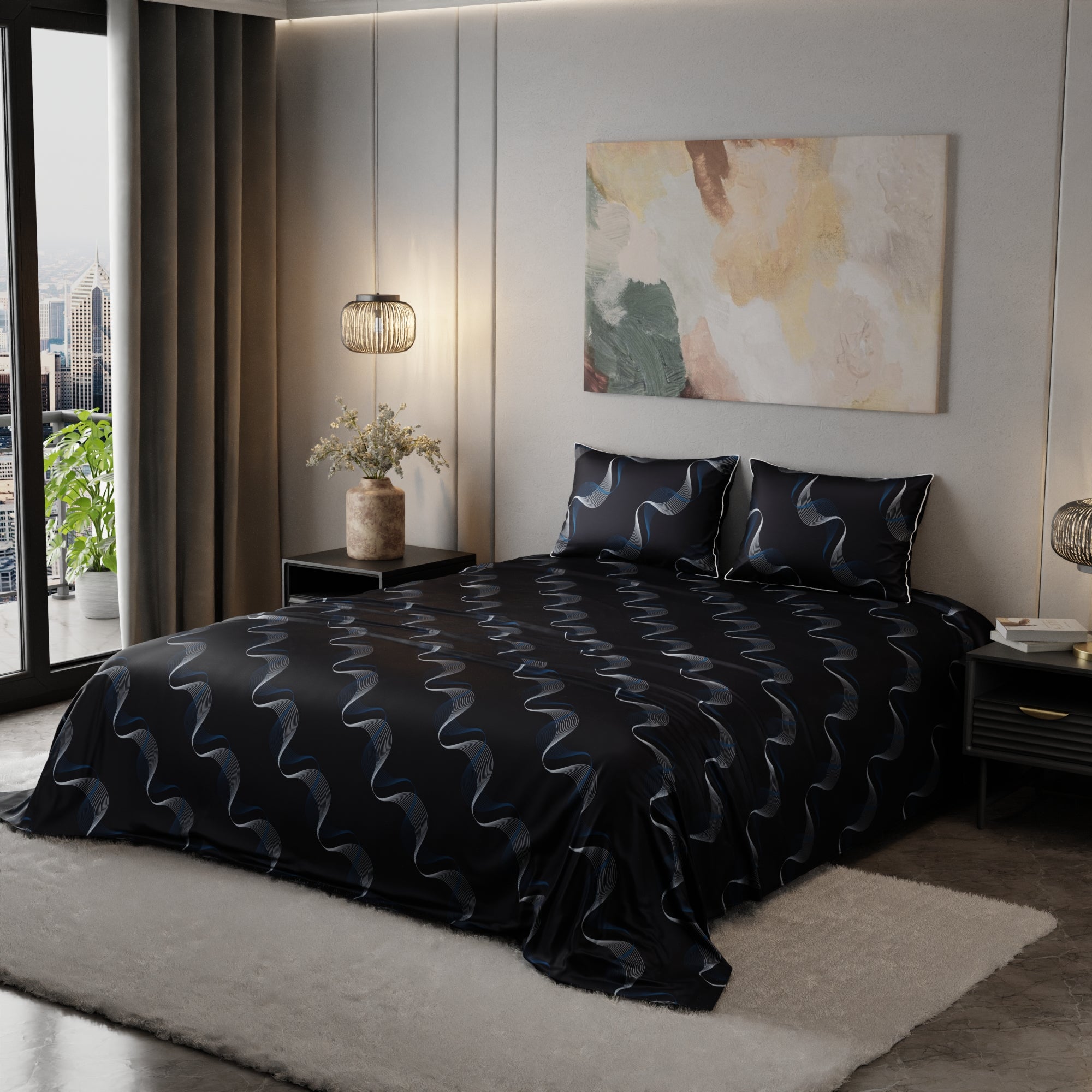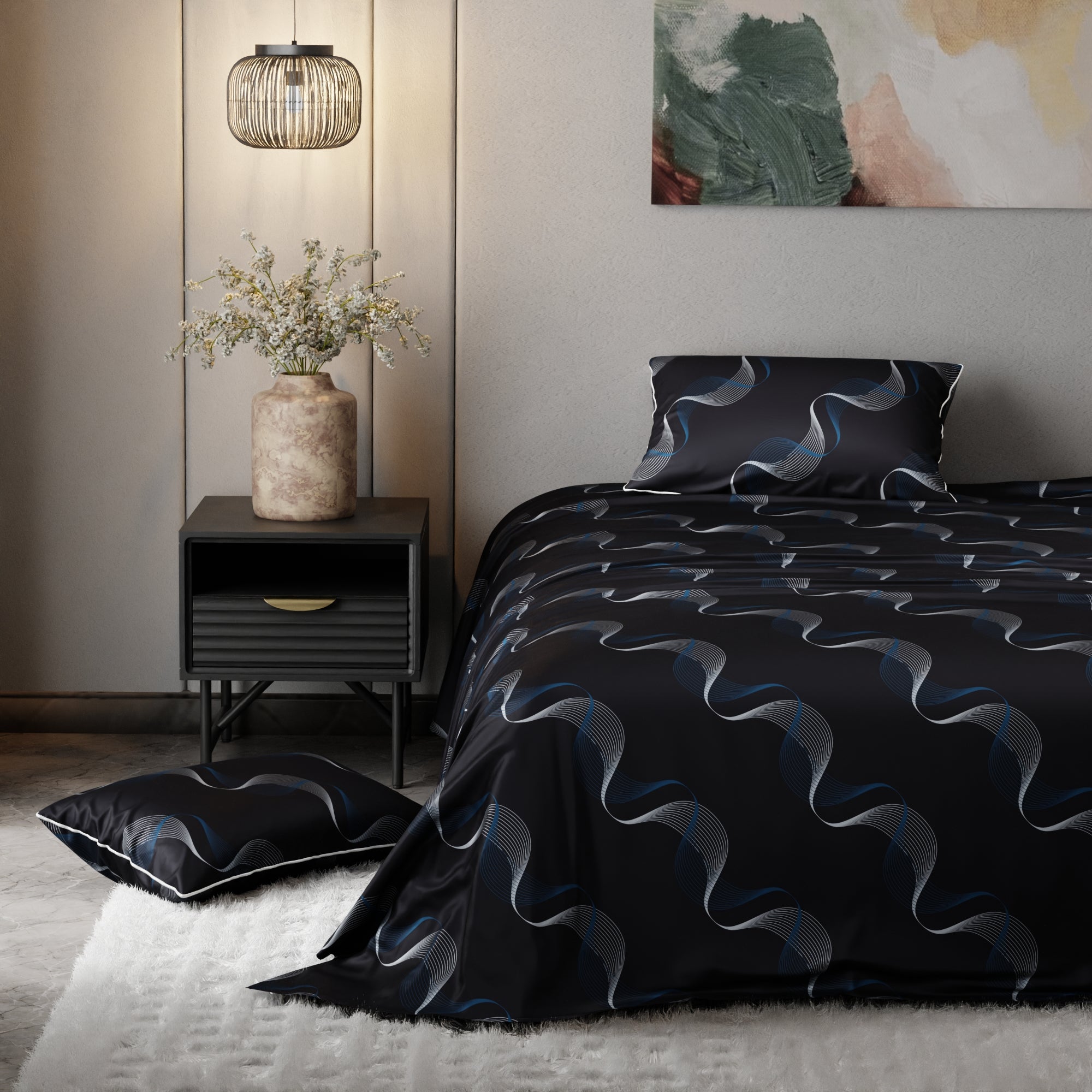 Dive into the enchanting depths of Twilight Rhapsody. This navy blue satin bed sheet showcases intricate blue and white wave patterns, creating an enchanting and serene atmosphere. The interweaving waves add an artistic dimension, turning your bed into a canvas of relaxation.