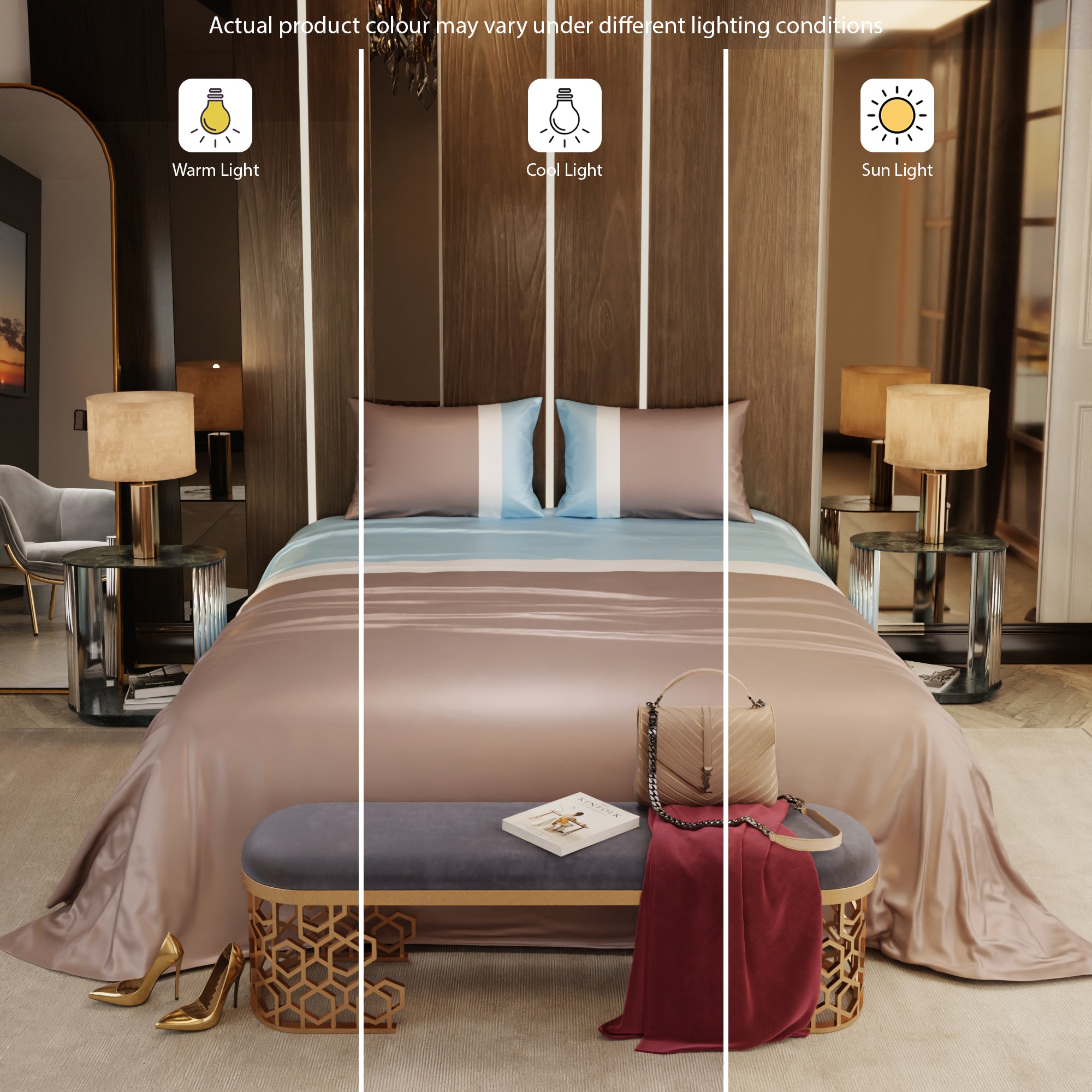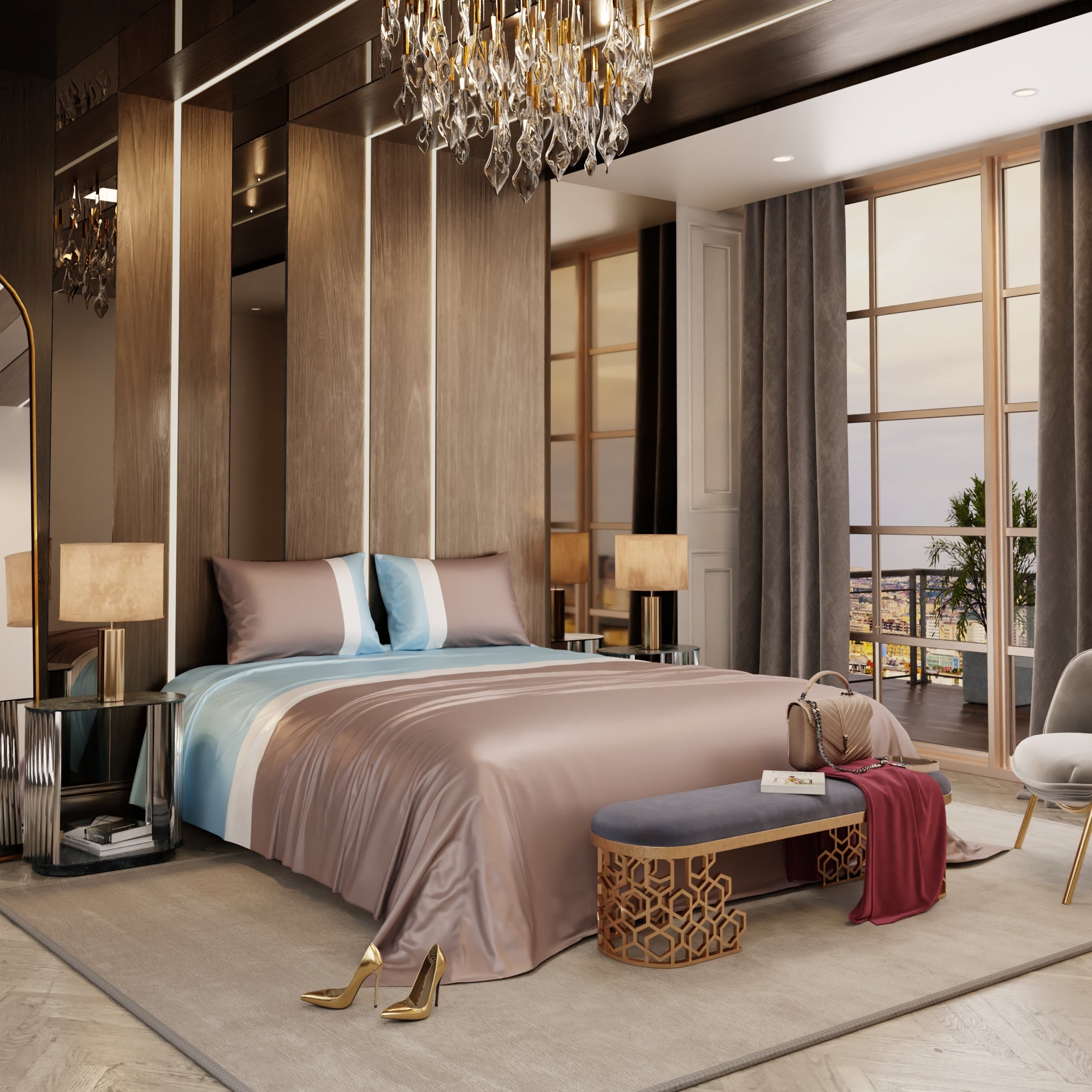 With the Stoa Paris Vogue Bedding Collection - Urban Elegance Bands, you're not just decorating your bedroom; you're creating a retreat where comfort and style come together. This exquisite satin bedsheet, graced by a blend of dreamy blue, white, and champagne tones, envelops your sleeping space in an atmosphere of serenity and purity. Elevate the aesthetics of your bedroom with this sophisticated bedding collection, where luxury and relaxation unite.