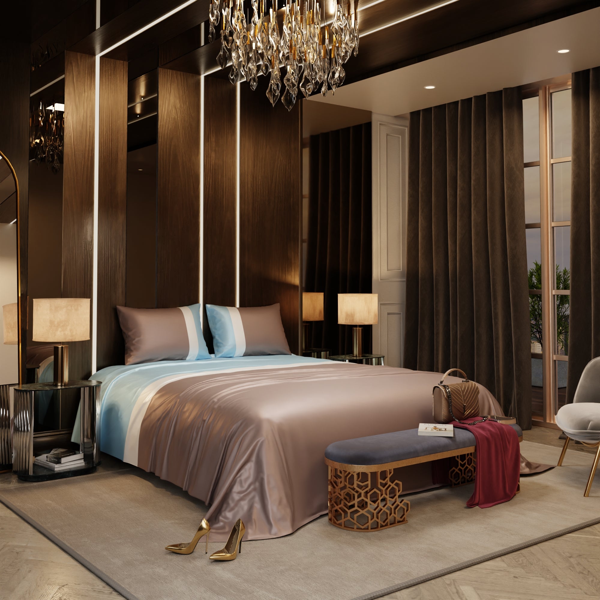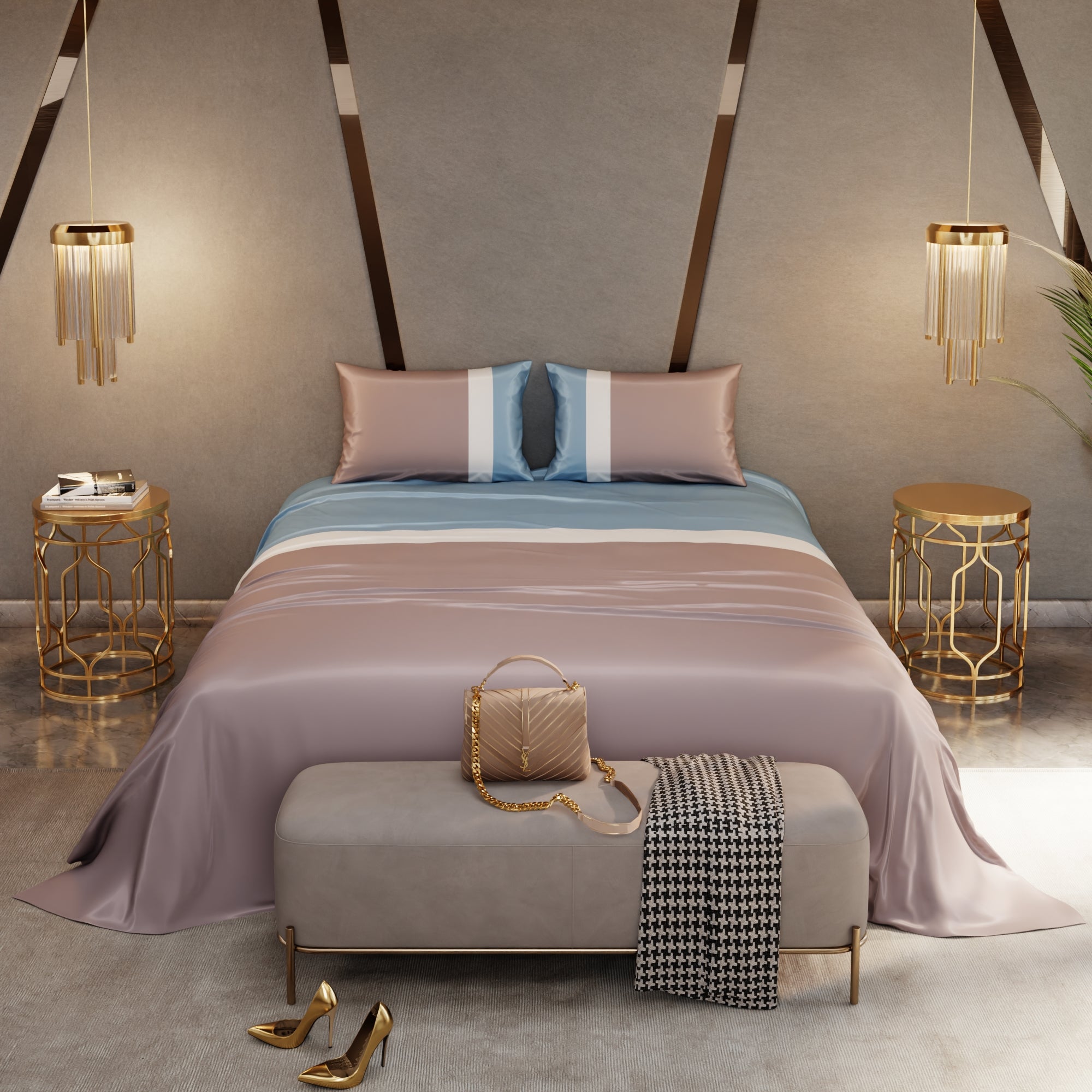 With the Stoa Paris Vogue Bedding Collection - Urban Elegance Bands, you're not just decorating your bedroom; you're creating a retreat where comfort and style come together. This exquisite satin bedsheet, graced by a blend of dreamy blue, white, and champagne tones, envelops your sleeping space in an atmosphere of serenity and purity. Elevate the aesthetics of your bedroom with this sophisticated bedding collection, where luxury and relaxation unite.