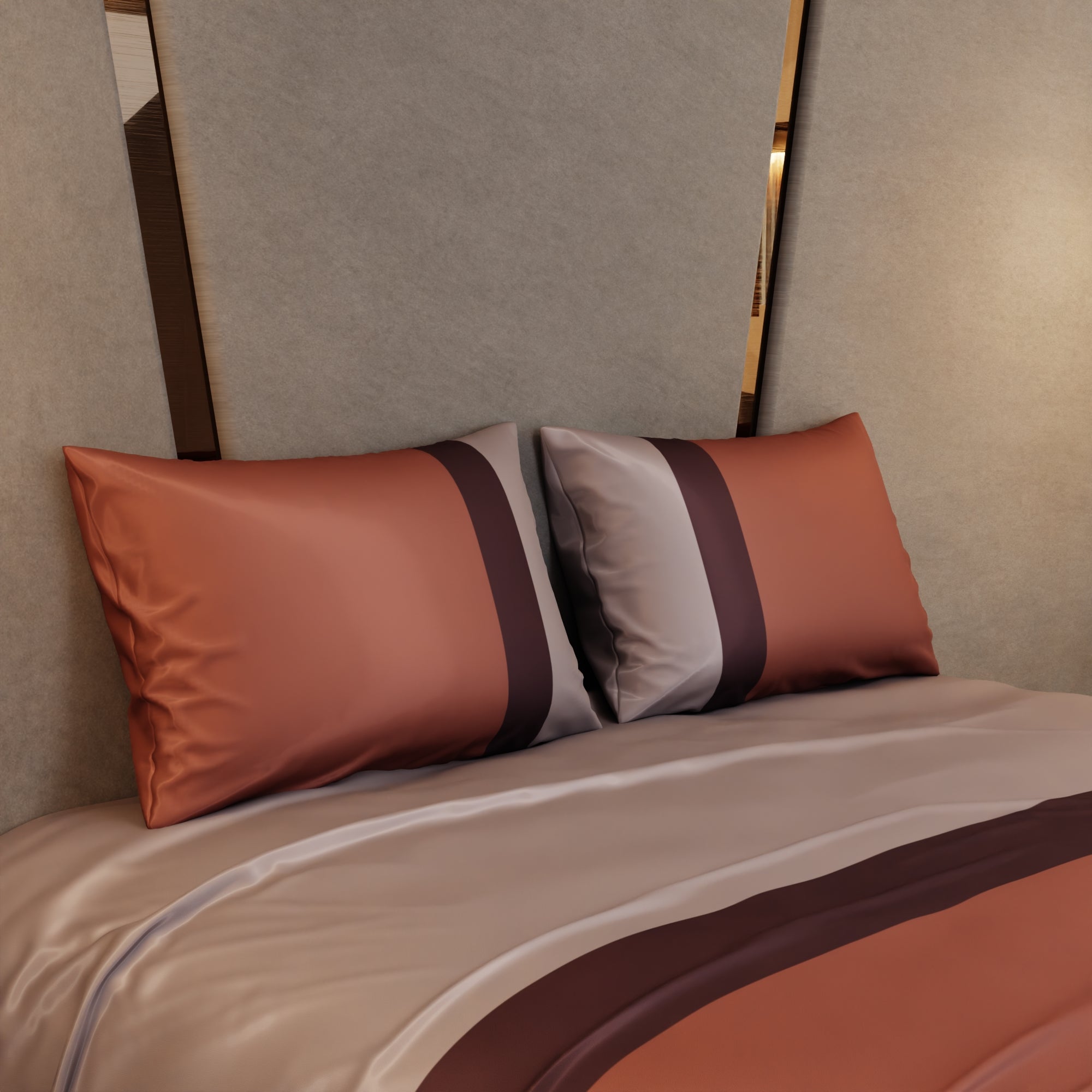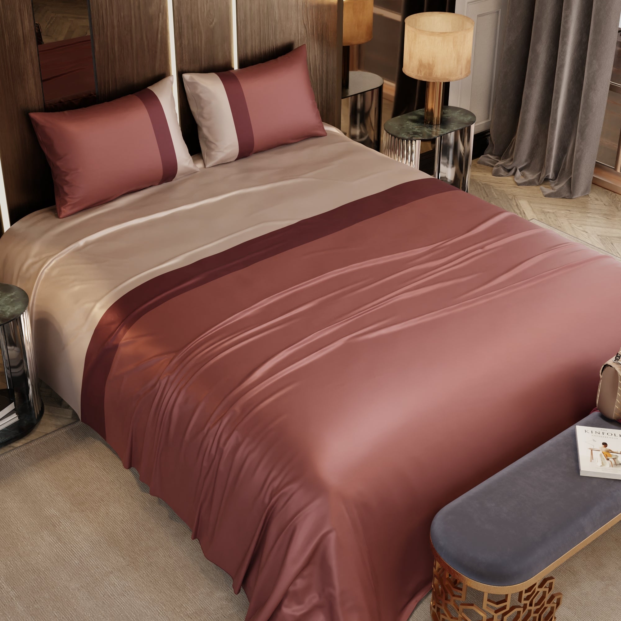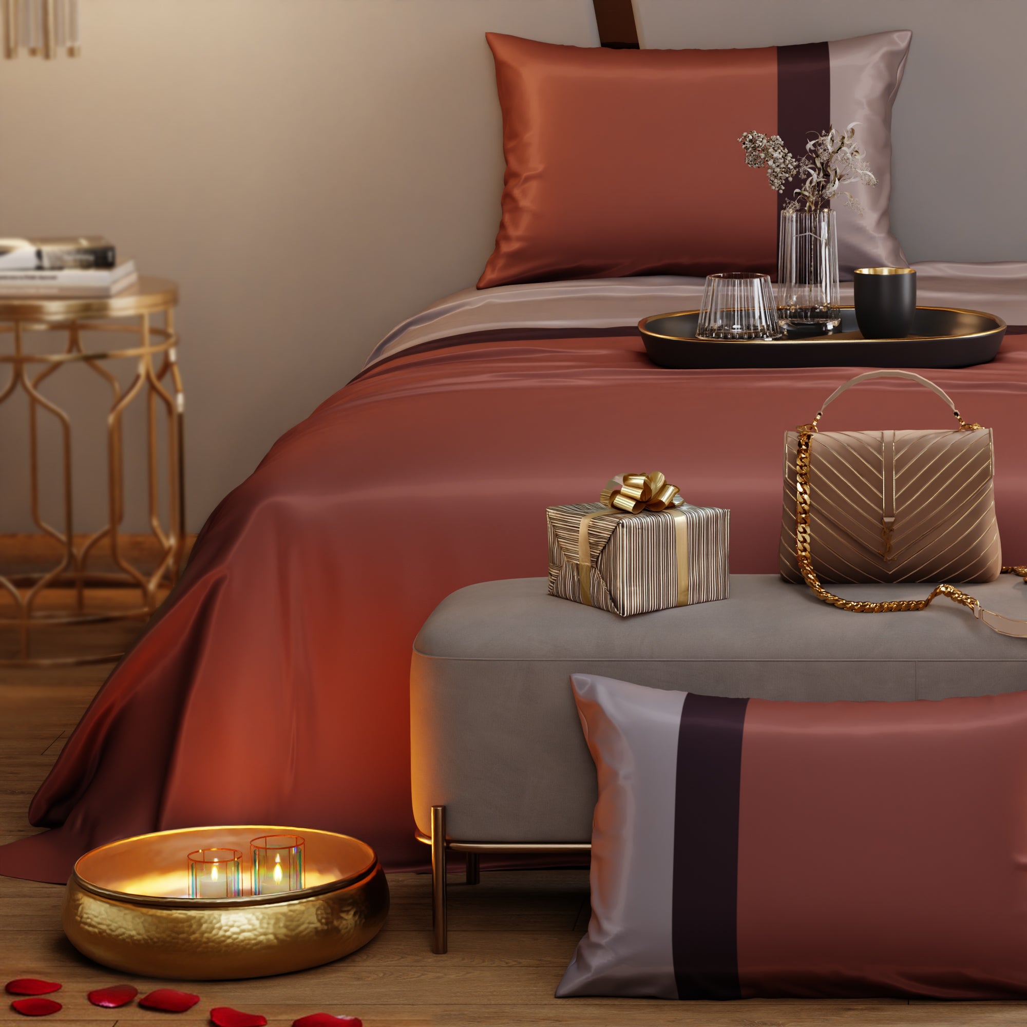 With the Stoa Paris Vogue Bedding Collection - Urban Tri-Bands, you're not just decorating your bedroom; you're creating a retreat where comfort and style come together. This exquisite satin bedsheet, graced by a harmonious blend of champagne, wine, and melted caramel hues, imbues your sleeping area with a blend of sophistication, passion, and comfort. Elevate your bedroom decor with this elegant bedding collection, where luxury and relaxation seamlessly converge.