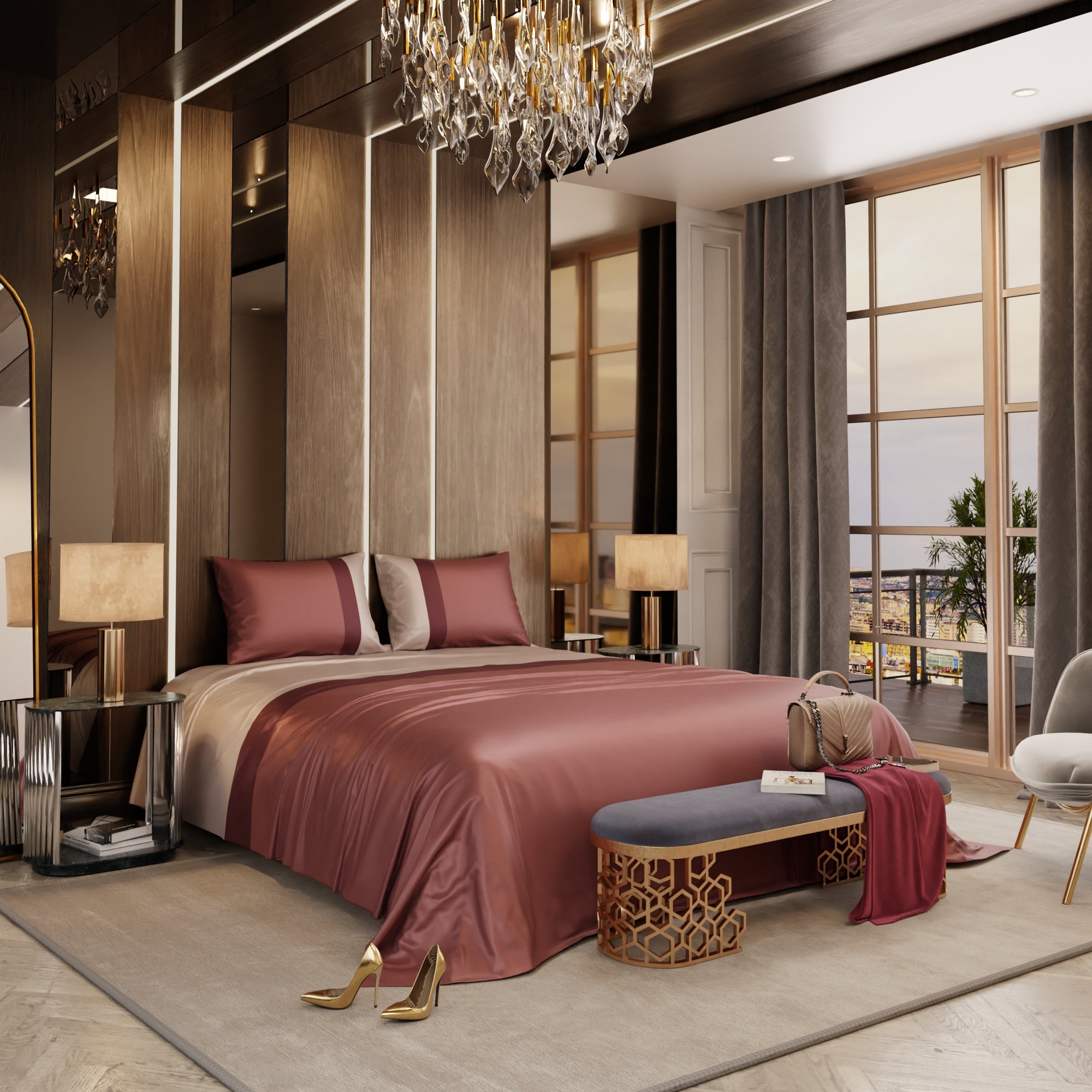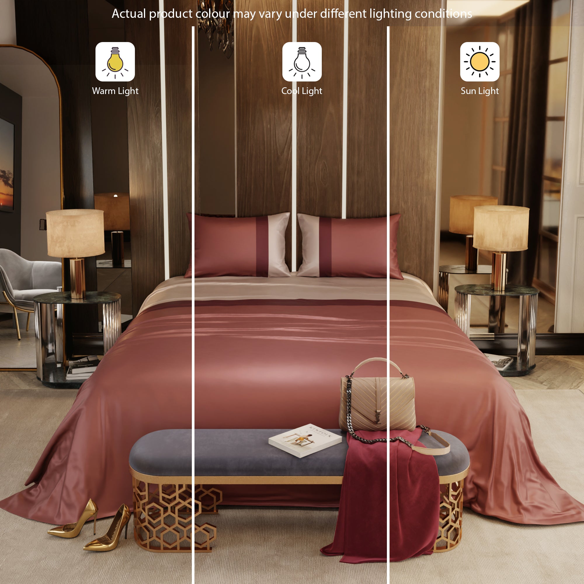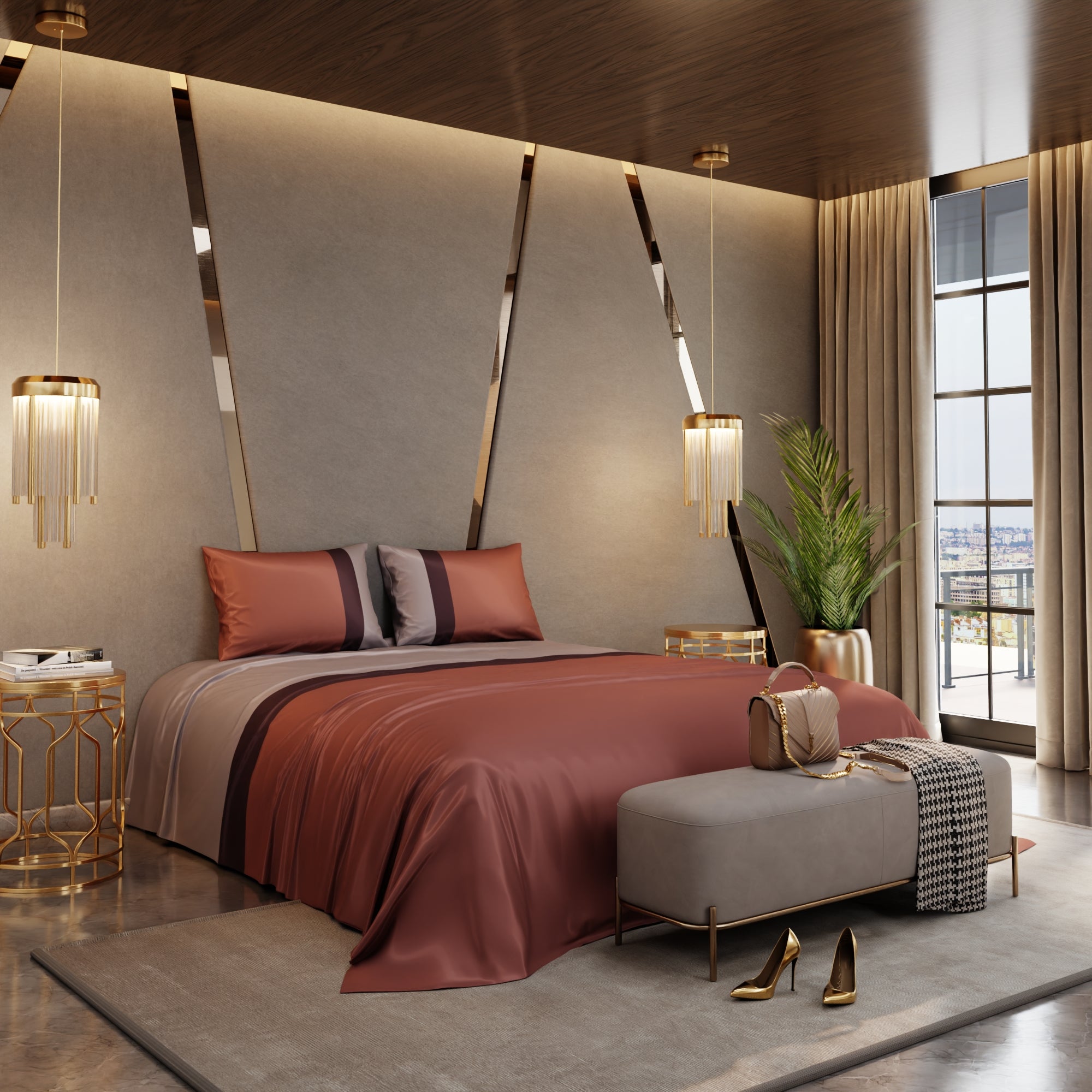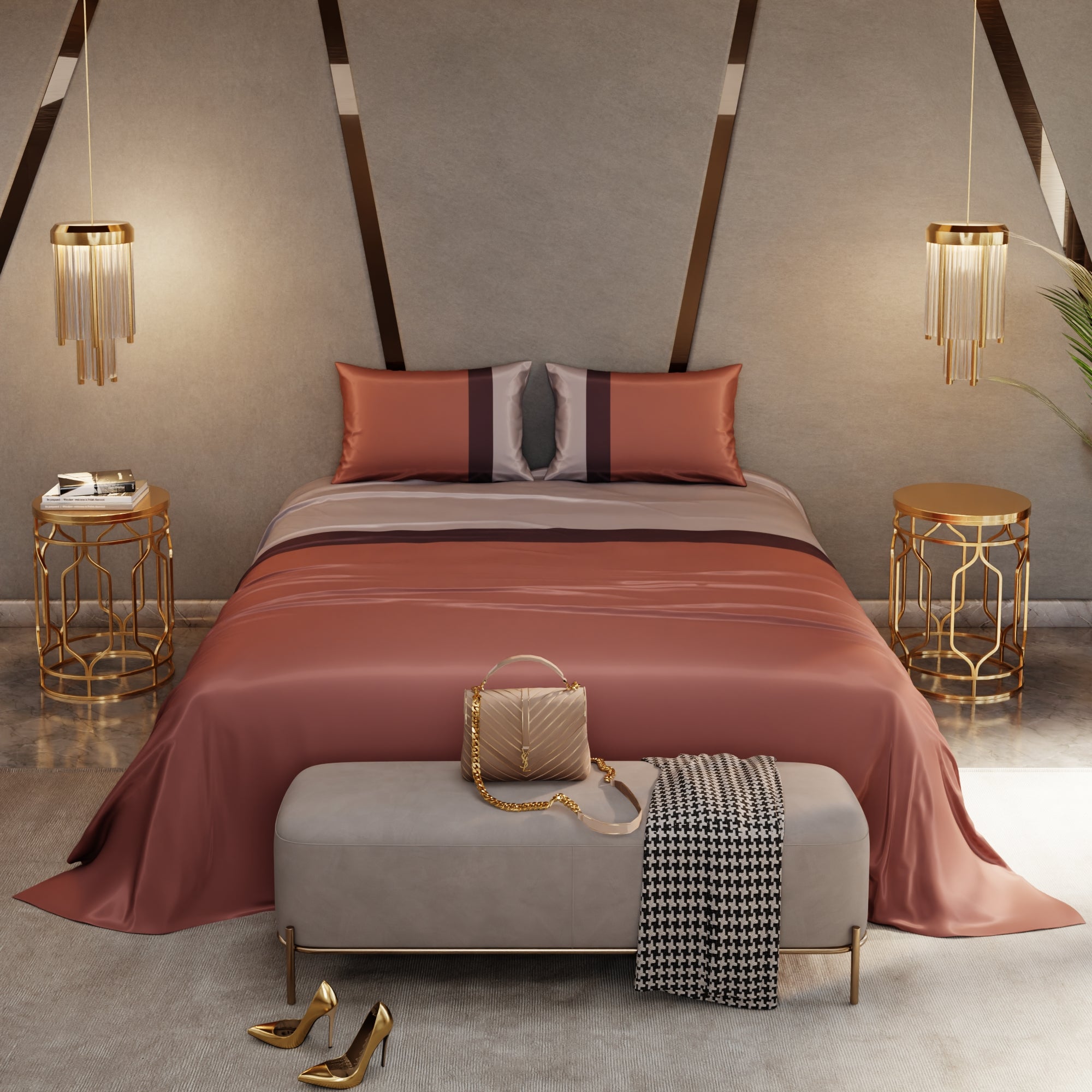 With the Stoa Paris Vogue Bedding Collection - Urban Tri-Bands, you're not just decorating your bedroom; you're creating a retreat where comfort and style come together. This exquisite satin bedsheet, graced by a harmonious blend of champagne, wine, and melted caramel hues, imbues your sleeping area with a blend of sophistication, passion, and comfort. Elevate your bedroom decor with this elegant bedding collection, where luxury and relaxation seamlessly converge.
