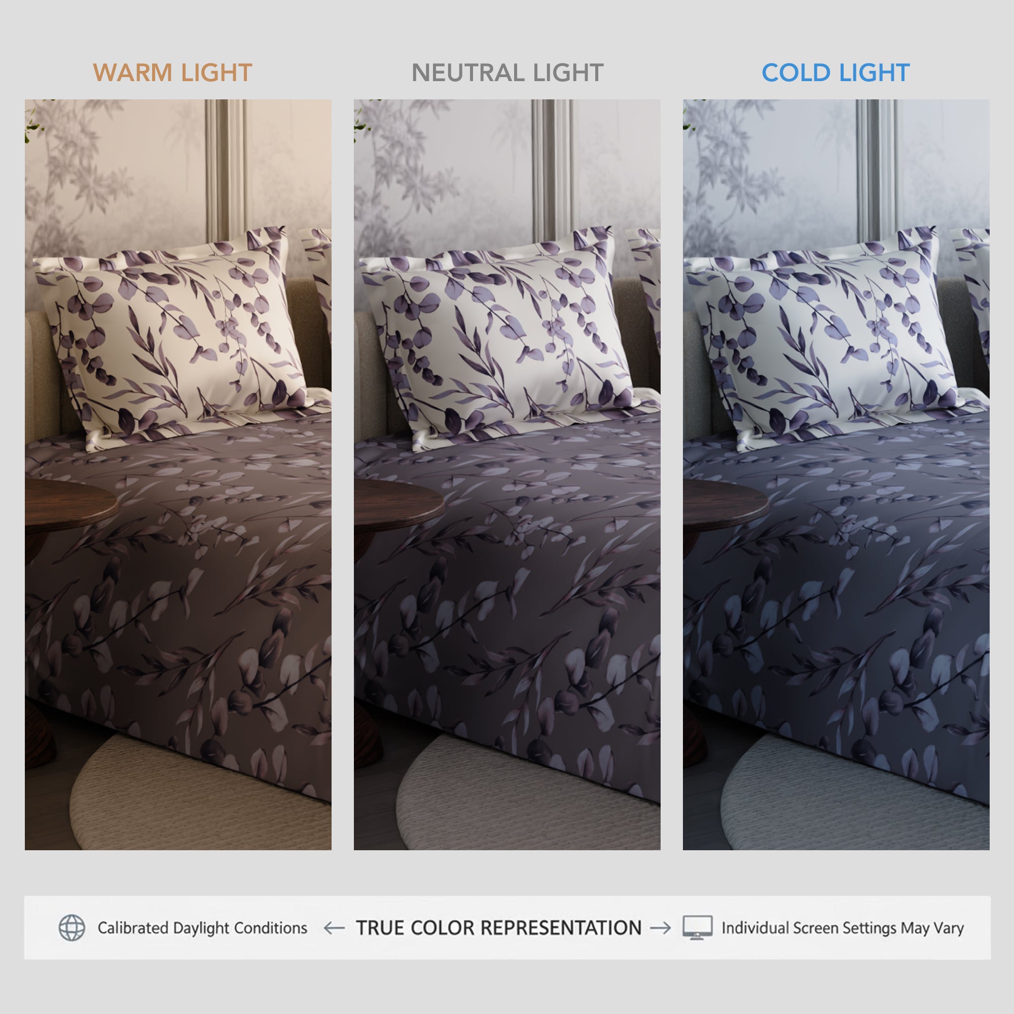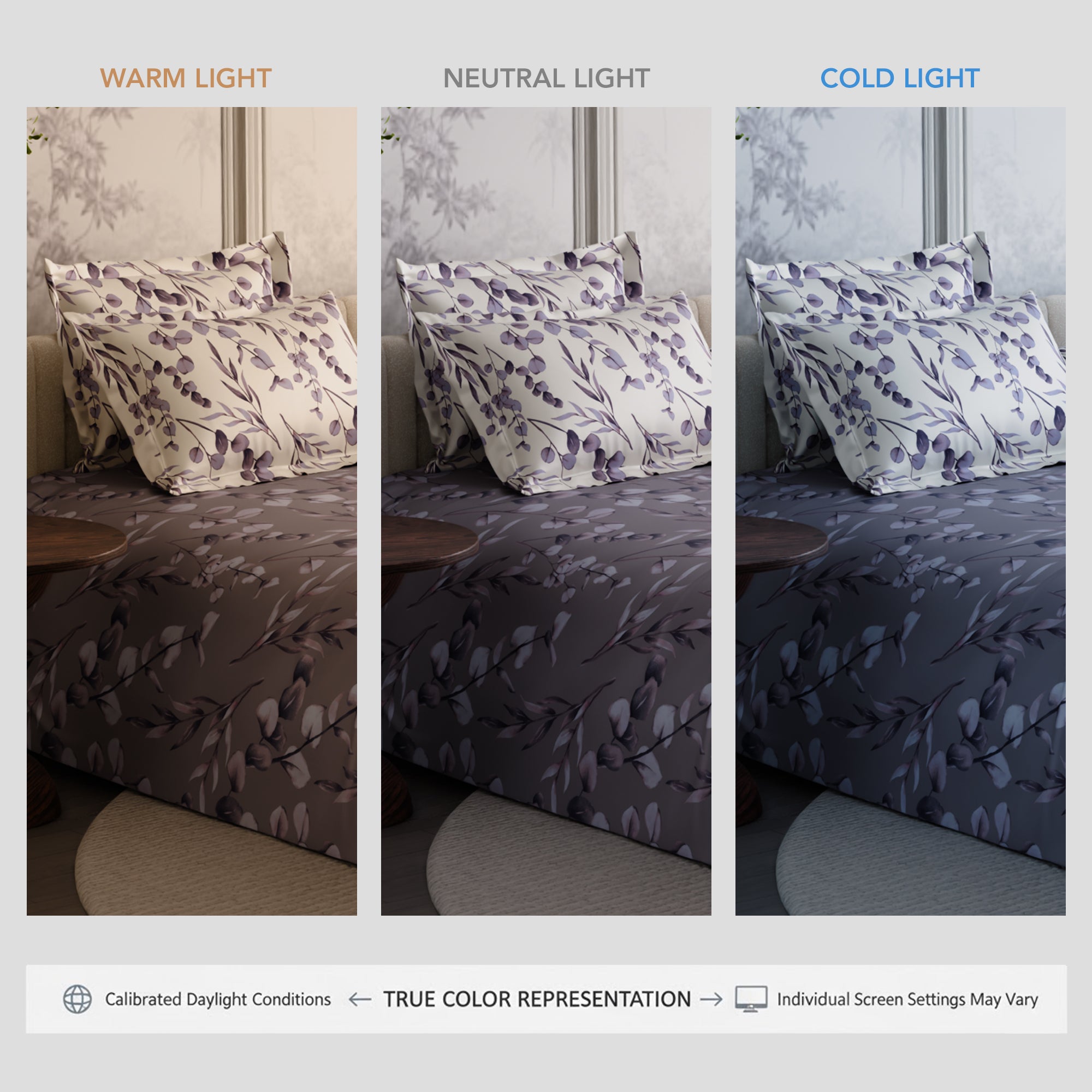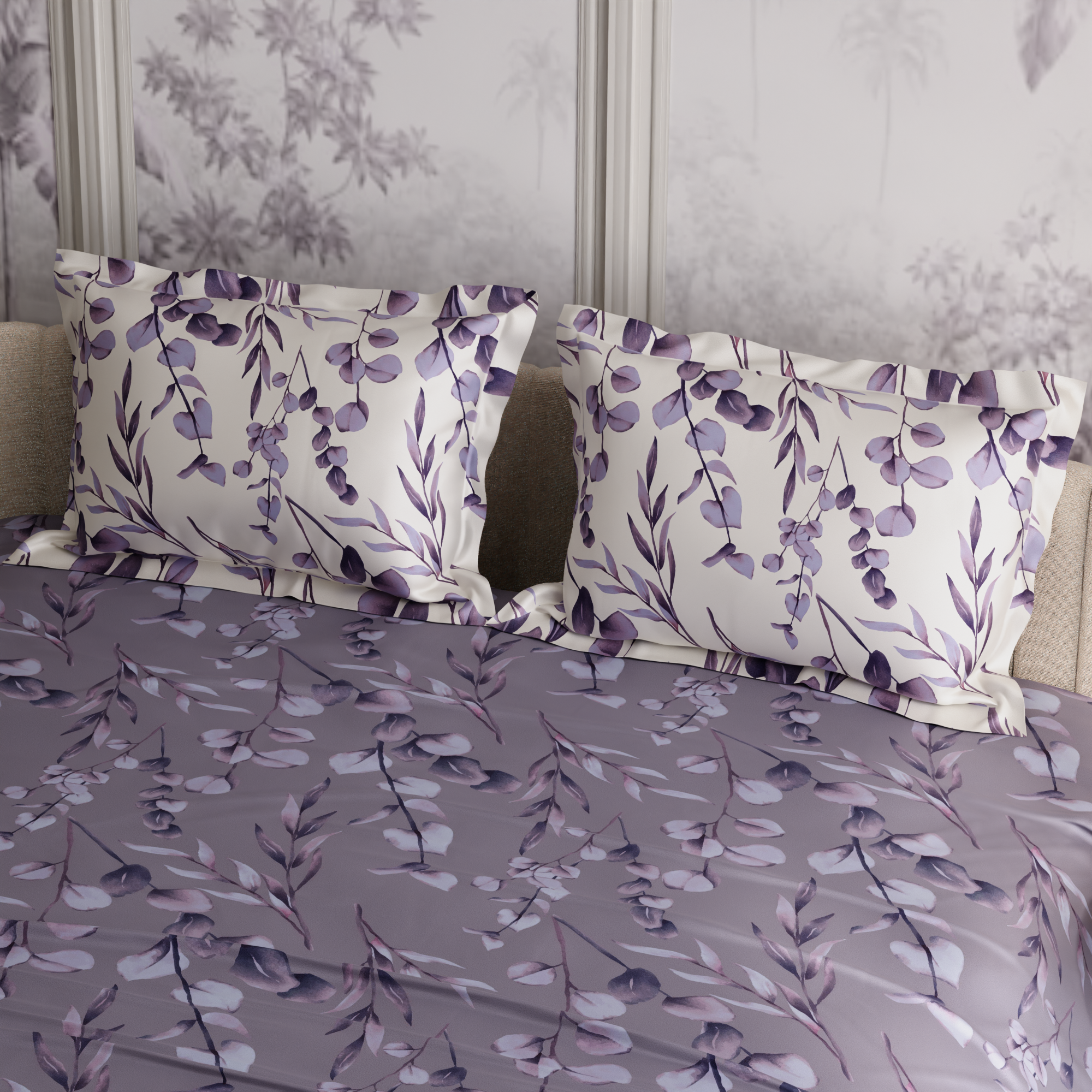 Florals that linger like twilight. Wisteria Shade bedsheet set in 300 TC channels the quiet drama of dusk in bloom. Deep violet tones and layered floral silhouettes bring a sense of mystery and moodiness, balanced by the soft comfort of 100% premium cotton. The contrasting ivory pillows add lightness to the look, making it feel styled and elevated, not overpowering. Fashionable, elegant, and made to impress—this is the beauty of French floral artistry.